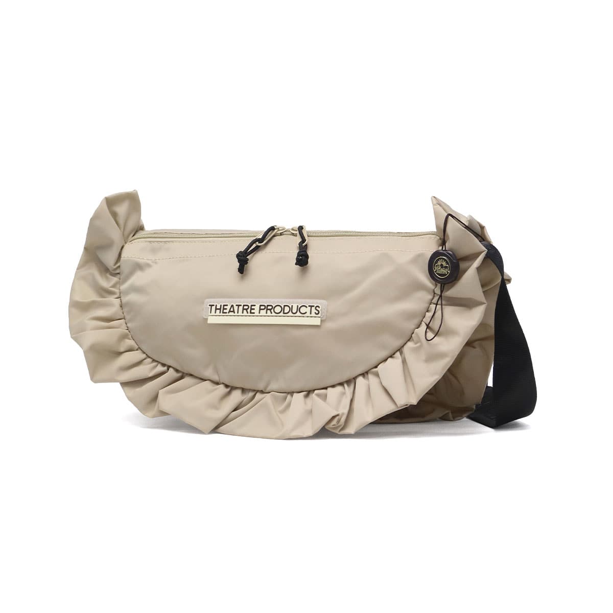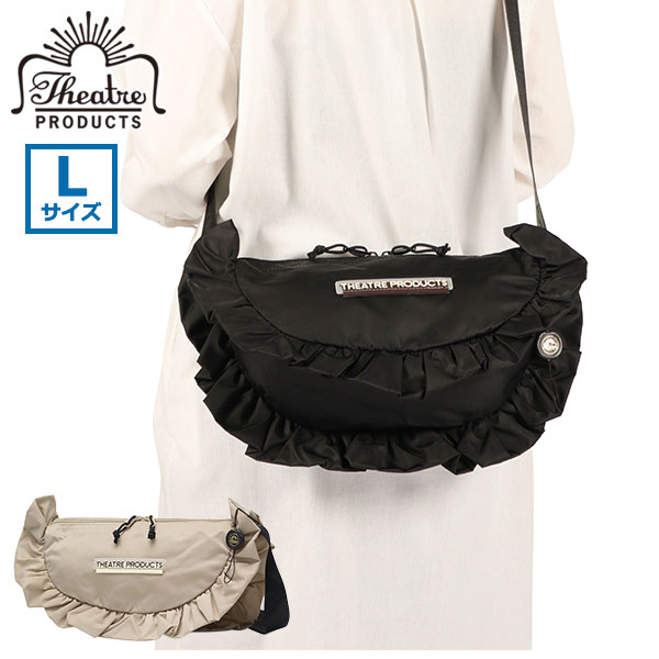 フリルデザインが女性らしく可愛らしい「THEATRE PRODUCTS」のLサイズショルダーバッグ。500mlペットボトルや長財布も入るサイズ感と広めのマチ幅で、収納力は見た目以上。上品で光沢感のあるナイロン素材にかわいいフリルをあしらった甘くなりすぎないカジュアルな印象のデザインが、コーデに華やかさをプラスしてくれます。