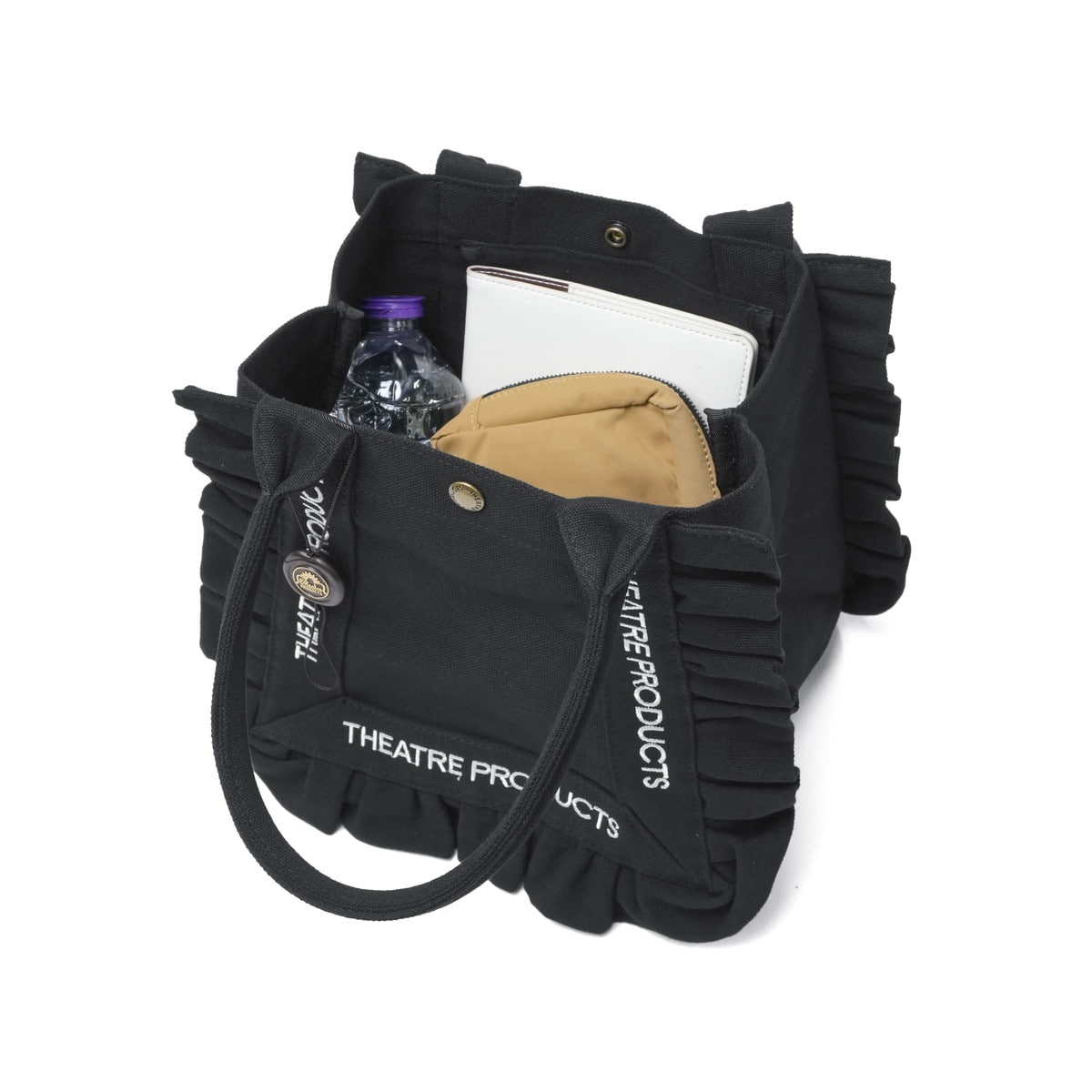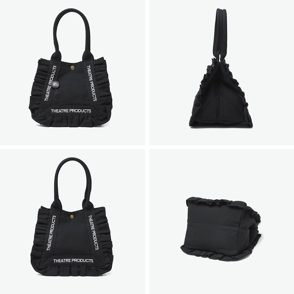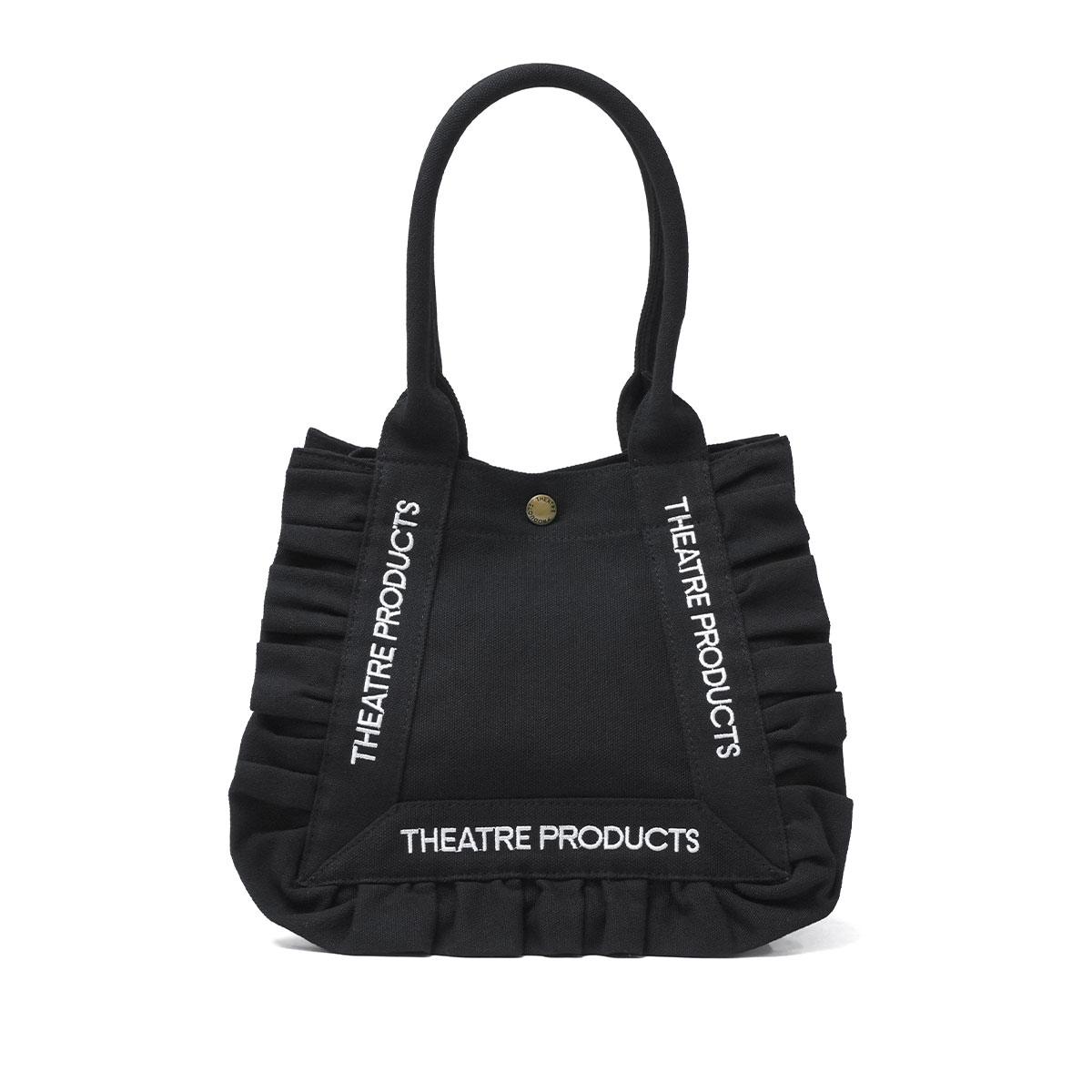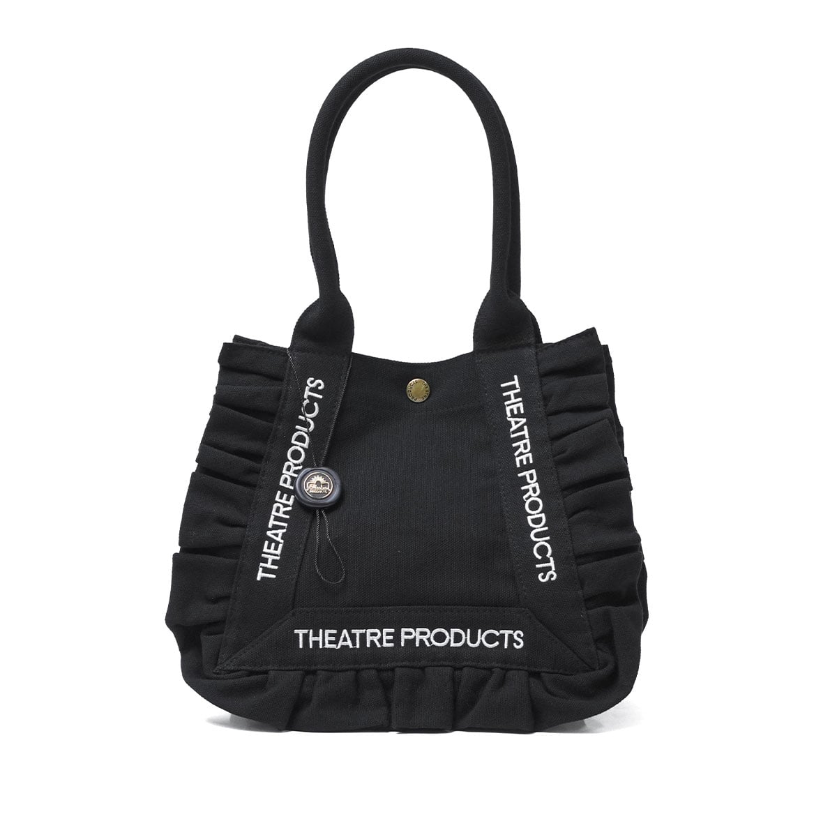 フェミニンなフリルデザインが目を惹く、THEATRE PRODUCTSのコットンフリルトートバッグのMサイズ。軽量キャンバス素材で通勤やお出かけにぴったり。A5サイズ収納可能で、マチ広めのデザインが実用的。コットンフリルと刺繍ロゴが可愛らしく、シンプルながら女性らしいカジュアルスタイルにマッチする、大人可愛いアイテムです。