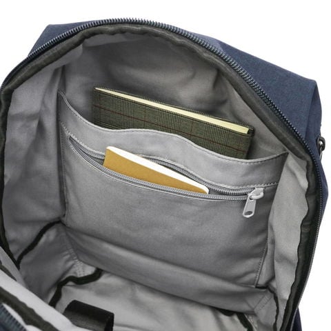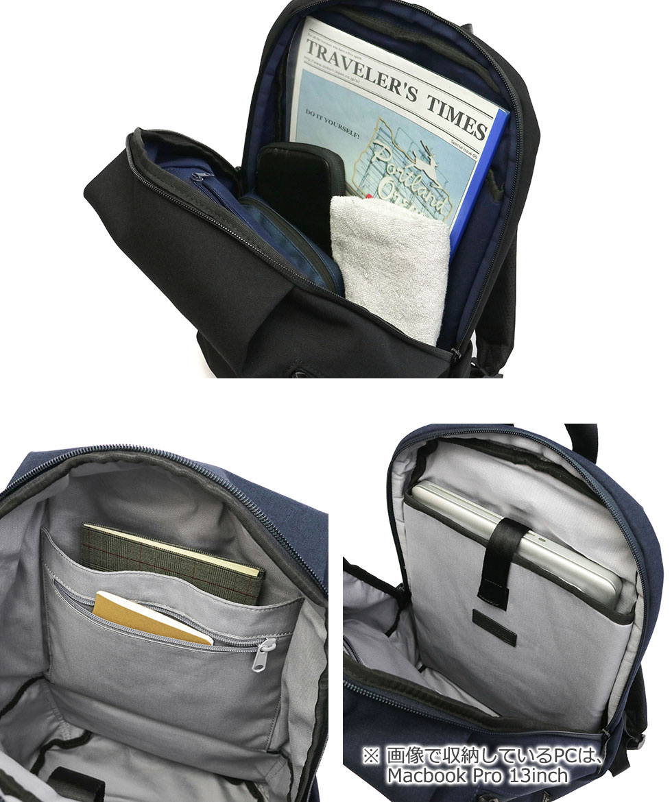 ダブルジップ開閉のメイン収納部は、見た目以上にゆったりとしまえるA4サイズの大きさ。内装にはクッション性のあるポケットを備え、PCも安心して持ち運ぶことができます。またバッグの中で埋もれがちな小物類なども収納でき、シンプルながら必要な機能を備えたデザインとなっています。