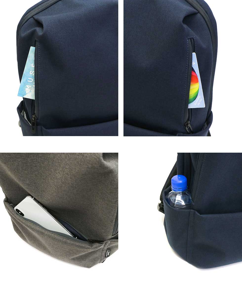 本体上部の左右には同じ大きさのジップポケットを備えており、縦ジップファスナー仕様なので背負いながらでも開閉しやすいのがポイントです。また、頻繁に使用するアイテムなどは下部ポケットや両サイドのポケットが便利なスペースです。