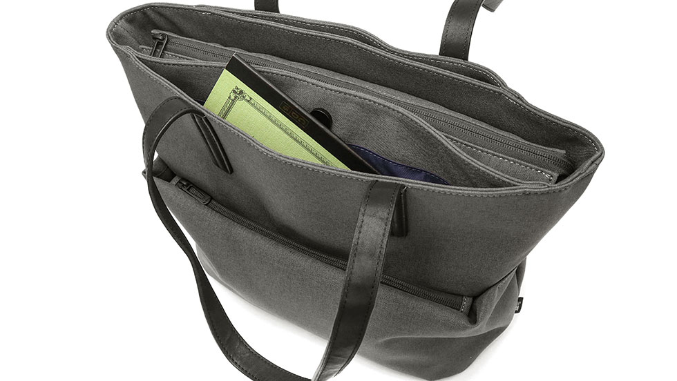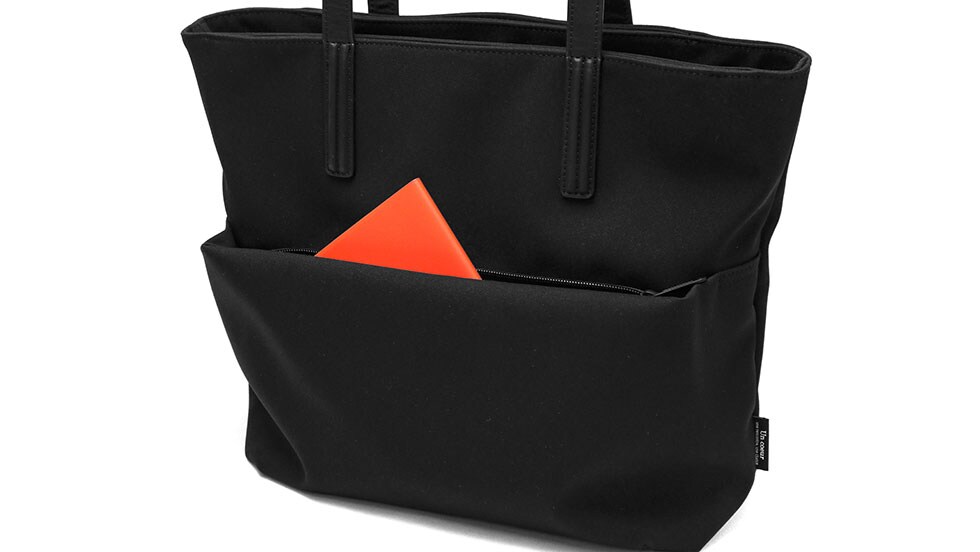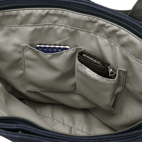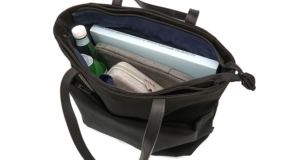 メインルームはA4書類がちょうど収まるサイズ感です。マチが広いため、ペットボトルやポーチなど厚みのあるアイテムもまとめて収納可能。収納口はファスナー仕様となっており、荷物が飛び出してしまう不安もありません。