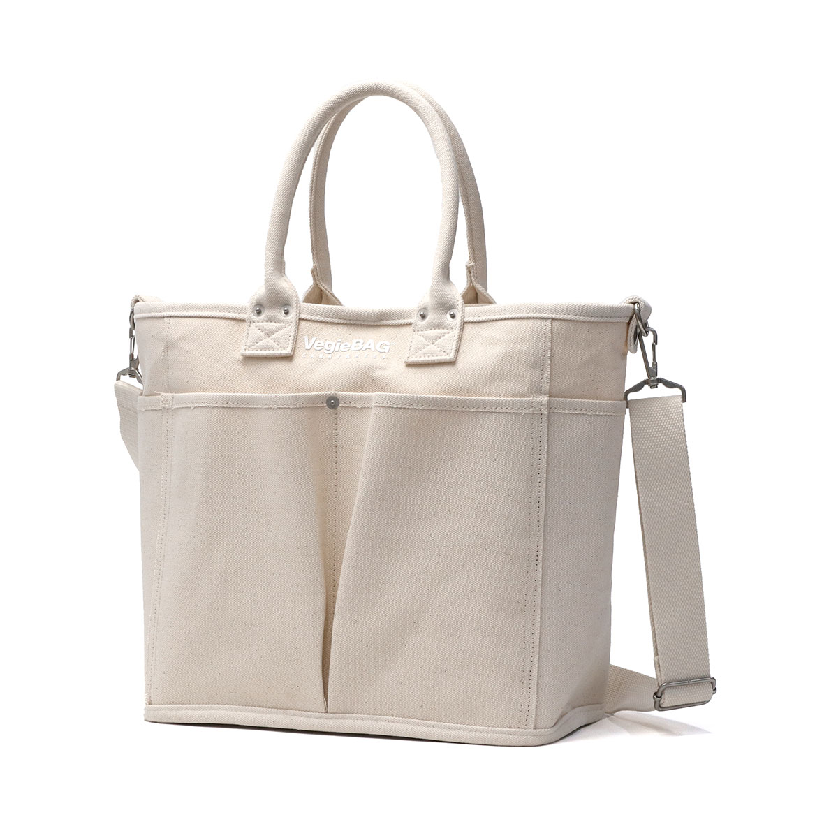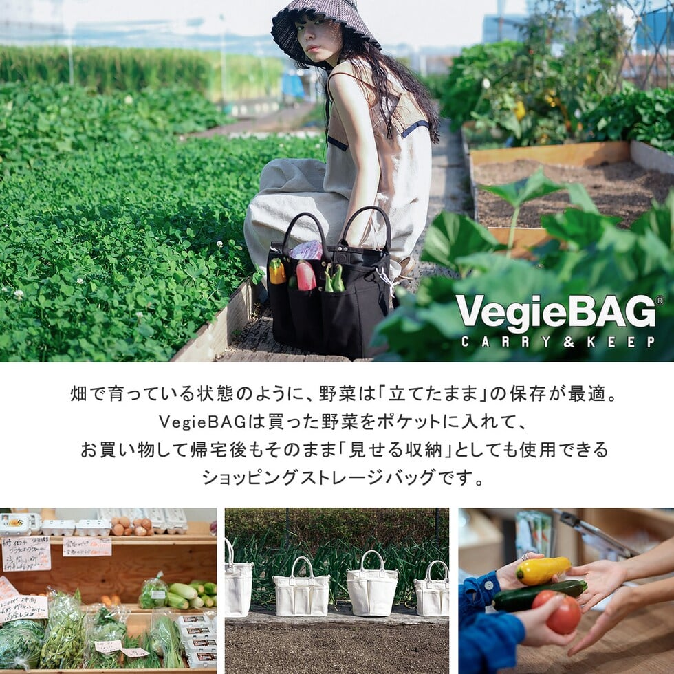VegieBAGは、朝市やファーマーズマーケットで買った野菜をポケットに入れ、帰宅後もそのまま「見せる収納」としても使用できるショッピングストレージバッグ。こちらは四角い形がポイントのスクエア型2WAYトートバッグです。雑誌やA4書類がぴったり入るサイズ感と、自立する本体、荷物が綺麗に整頓できる便利な内装設計で、お仕事用のバッグなどにもおすすめのアイテムです。