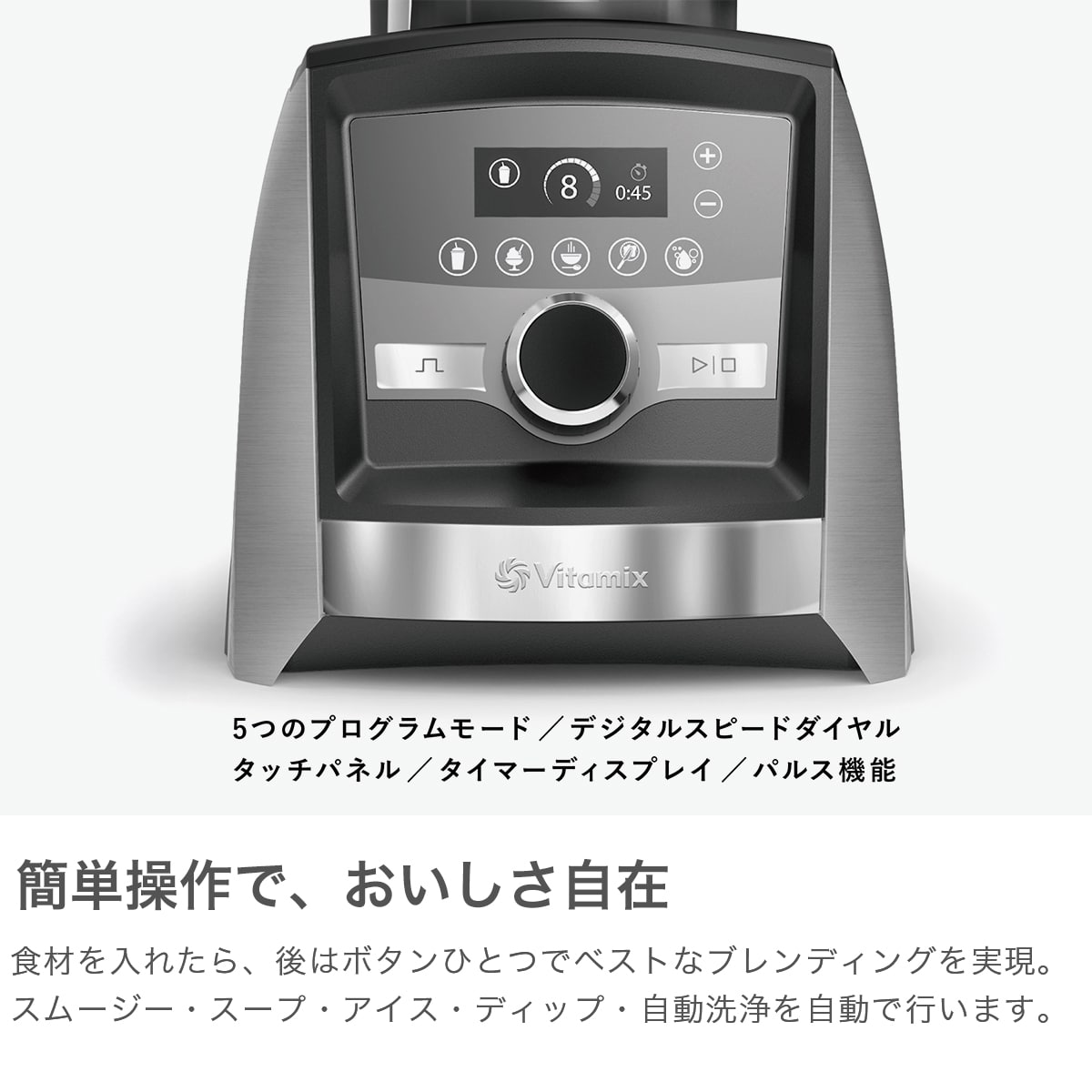 種も皮も栄養まるごと摂れる、100年以上の間世界中で愛されつづける老舗ブレンダー『Vitamix/バイタミックス』。こちらは、3つのプログラムモード・スピードダイヤル・パルス機能はもちろん、撹拌時間を表示するデジタルタイマーを搭載したスムージー、スープ、アイスをメインで使う方におすすめのモデルです。夕食の仕込み、メインディッシュの調理までカバーし、お鍋やフライパンと同じようにキッチンに欠かせない調理器具としてお使いいただけます。