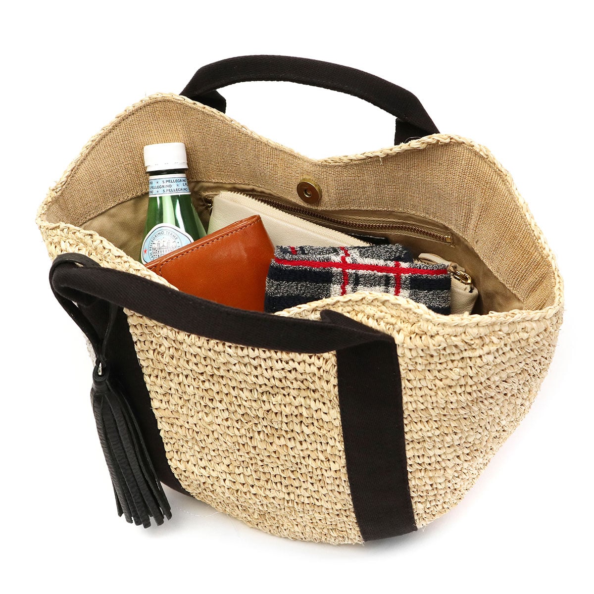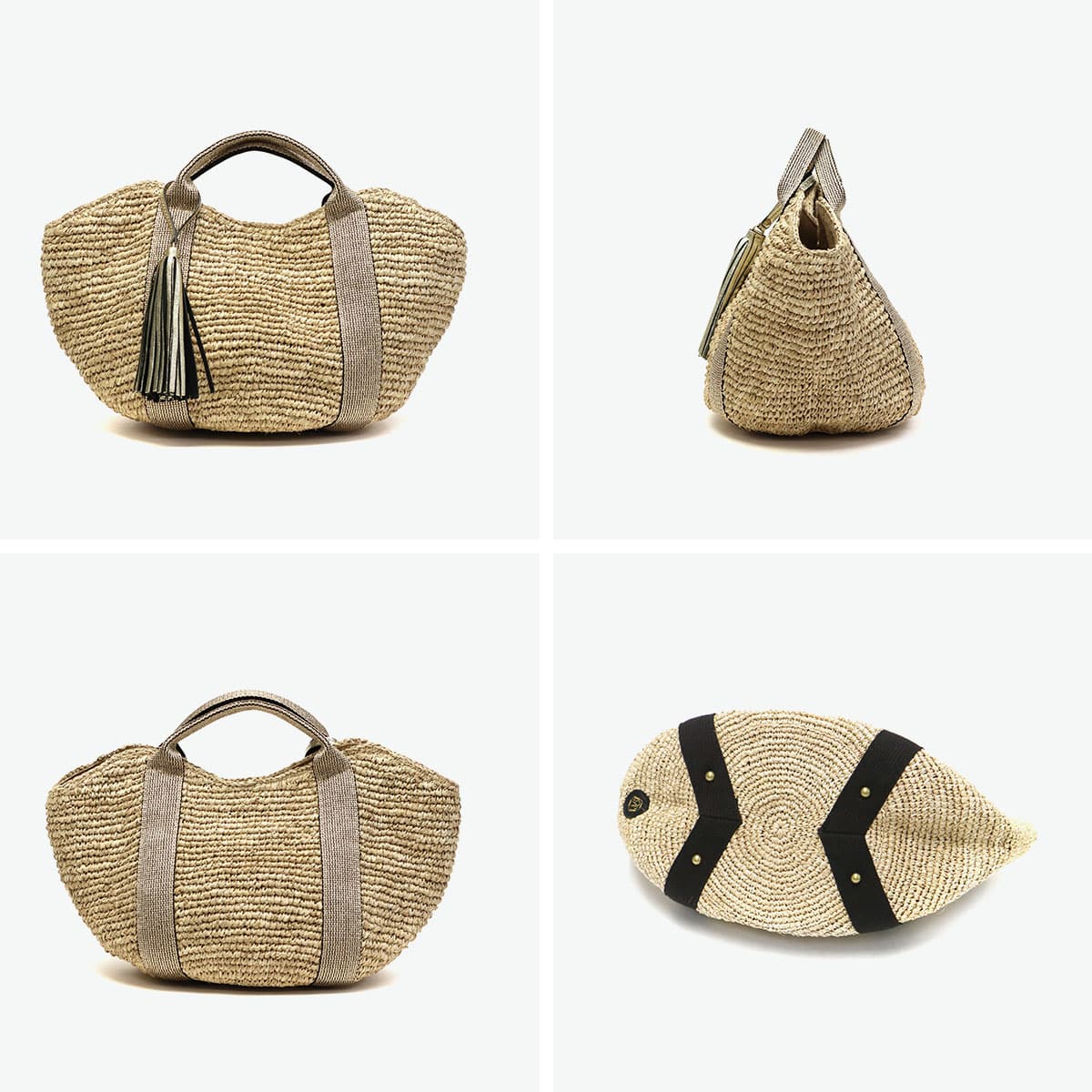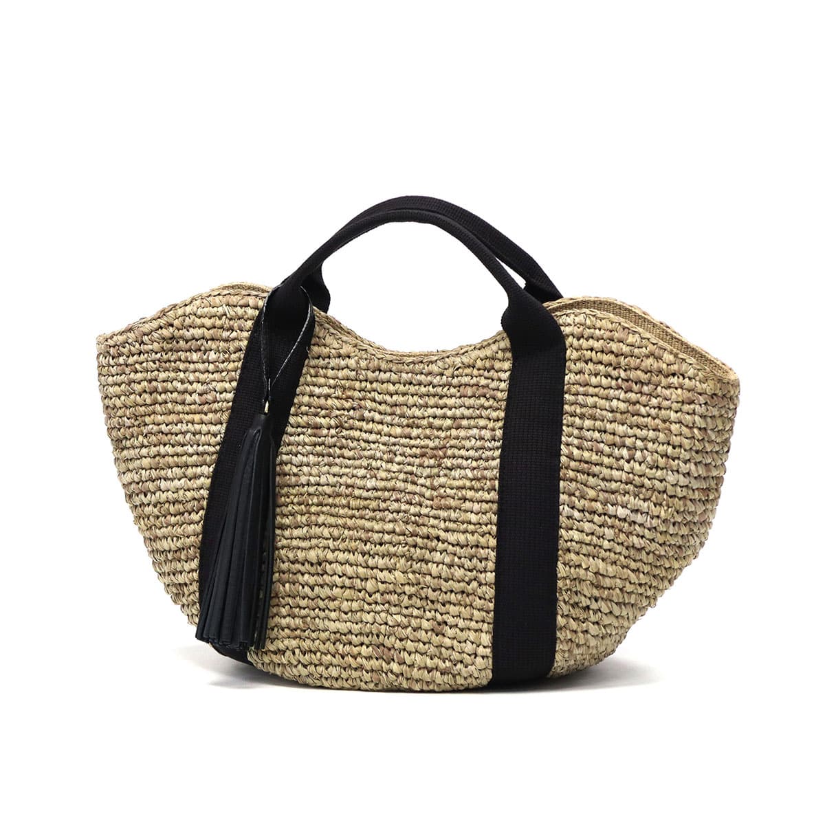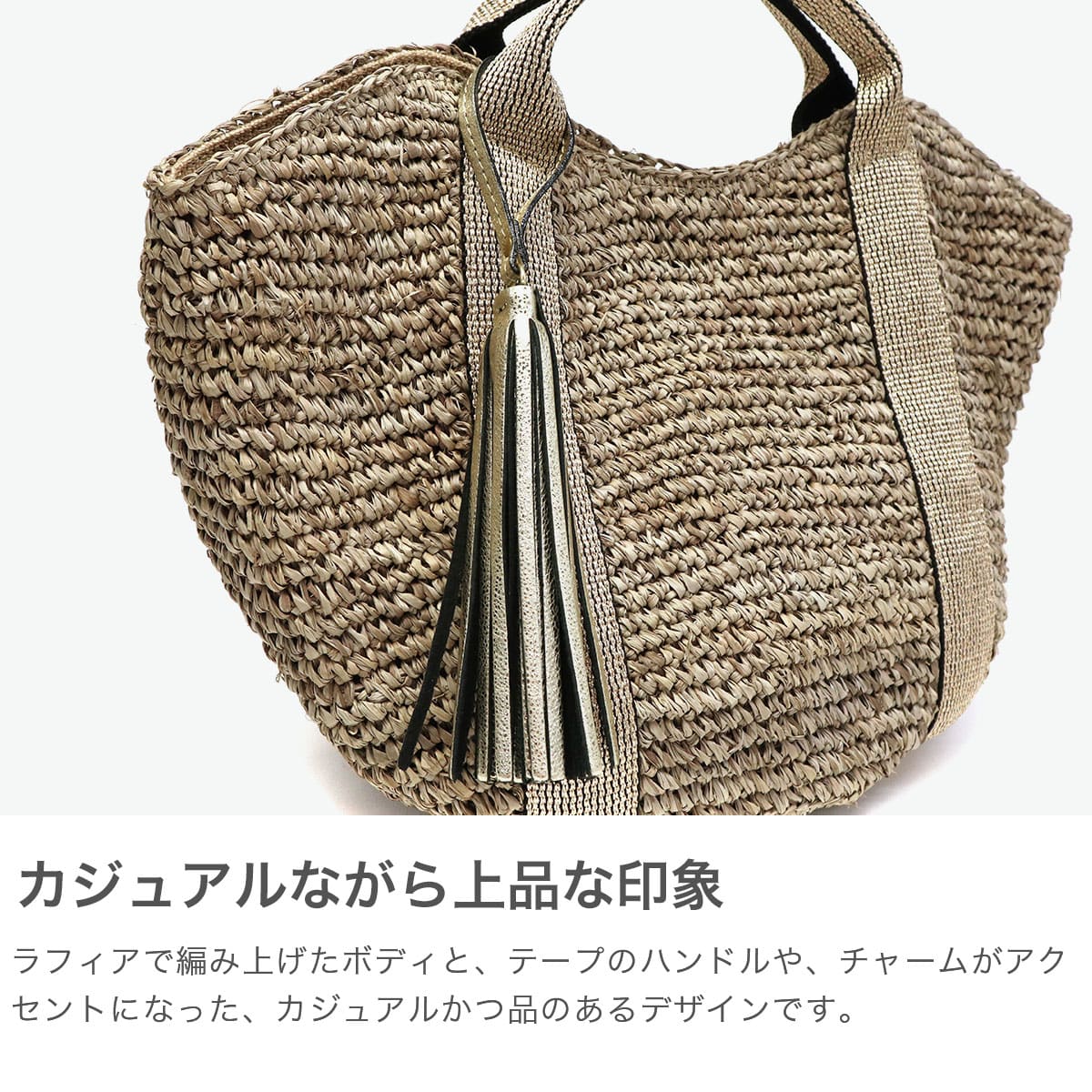 ラフィアで編み上げたボディにテープのハンドルがアクセントになったカゴバッグ。天然素材のカジュアル感がありながらもフェミニンな印象のルックスと、上品に揺れるタッセルが魅力的です。ルックスだけでなく、利便性、収納力にも優れているので、幅広いシーンでお使い頂けます。
