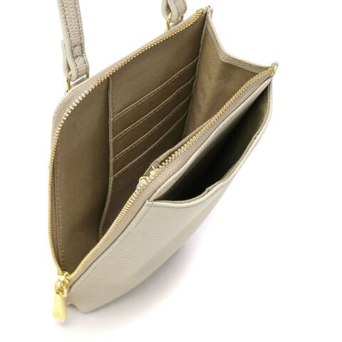 内装は紙幣や小銭から、カードまで収納できるデザイン。収納口がL字型のため、スムーズにお会計することができます。フロントにはスマートフォンがぴったり収まるポケットを備えており、出し入れも楽々。本体背面のカードポケットには、頻繁に使うカードを収納しておけます。