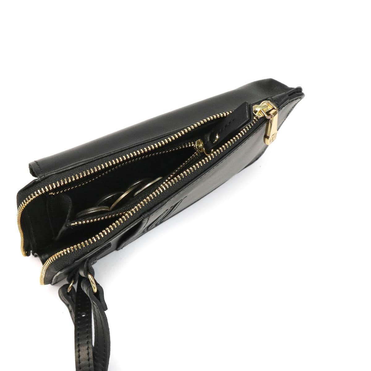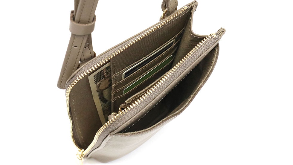 背面側のファスナー部分の収納スペースには、4ヶ所のカードポケットや小銭入れ、お札が収まるポケットを設け、必要な量のお金をコンパクトにまとめることができます。収納口はL字型なので可視性に優れ、お会計がスムーズに行えるよう配慮されたつくりになっています。
