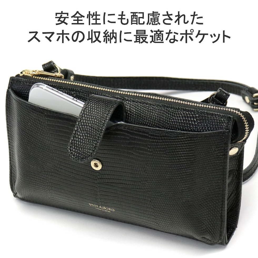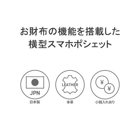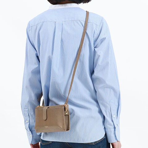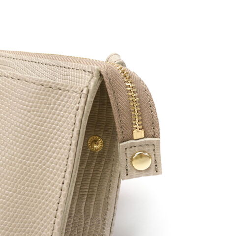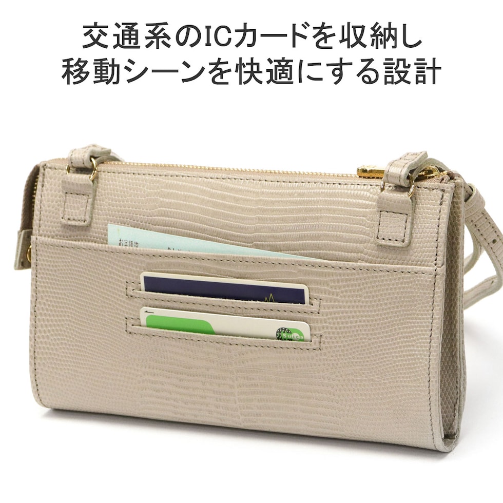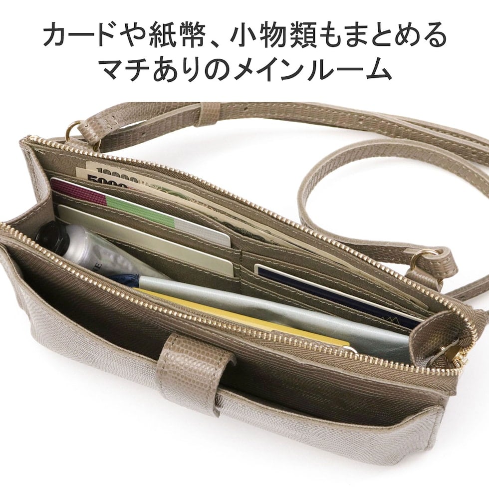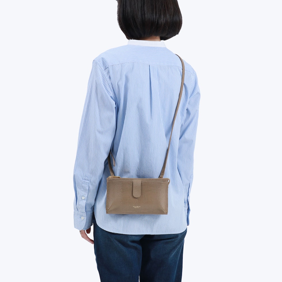 リザードの型押しレザーが女性らしい、横型のスマホポシェット。スマホケースと財布、両方の役割を一体化した便利な設計で、ちょっとした外出や旅行時に活躍します。メインルームはマチ幅の広いスペースを完備し、紙幣や小銭だけでなくコスメや小物の収納にも対応するマルチなつくりに仕上がりました。