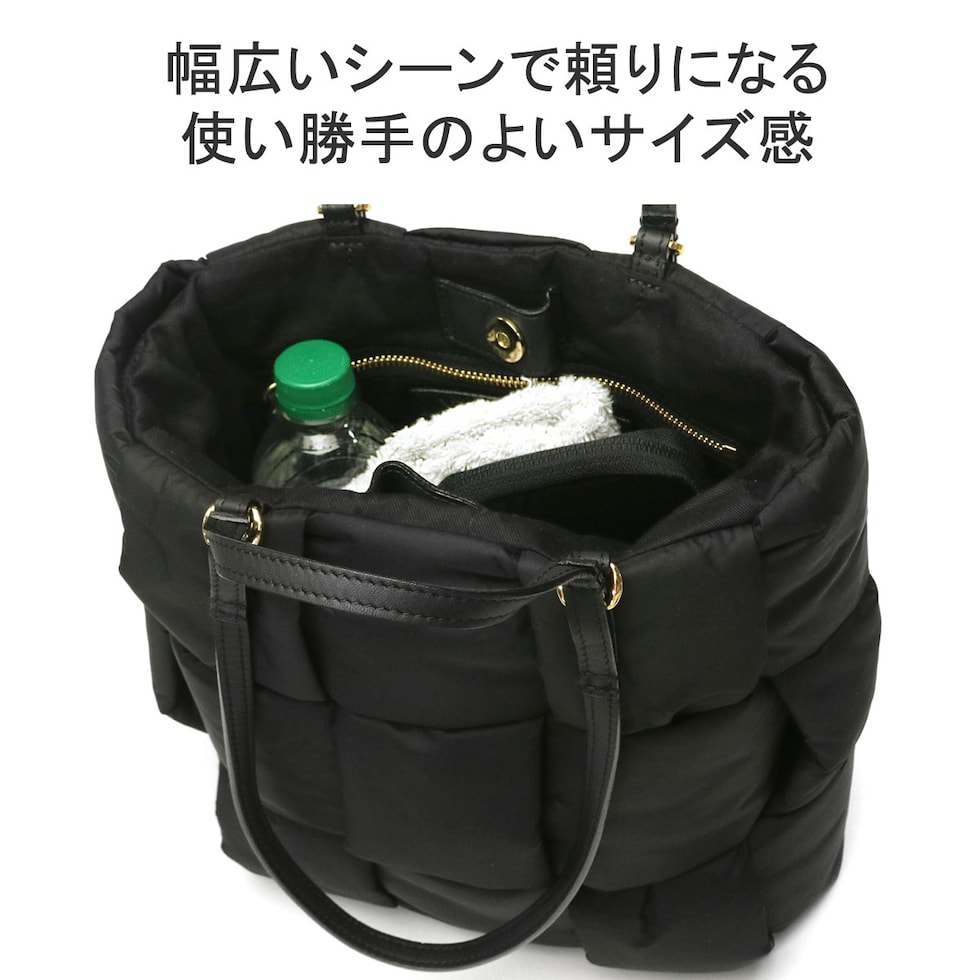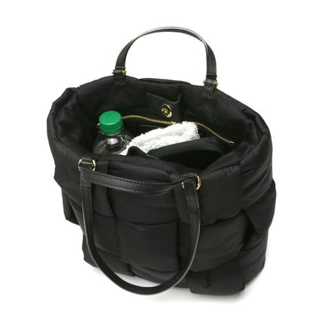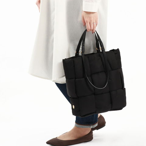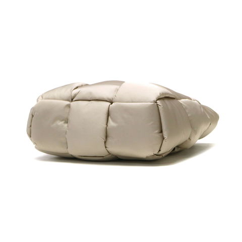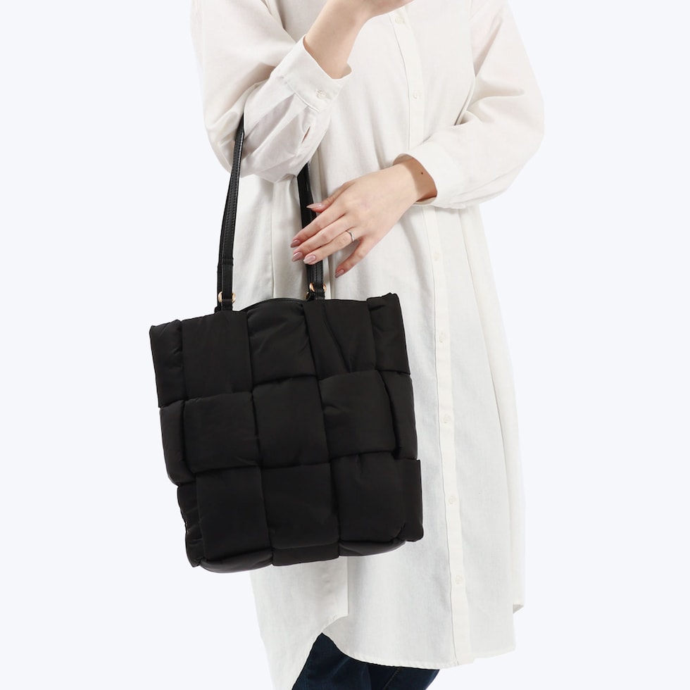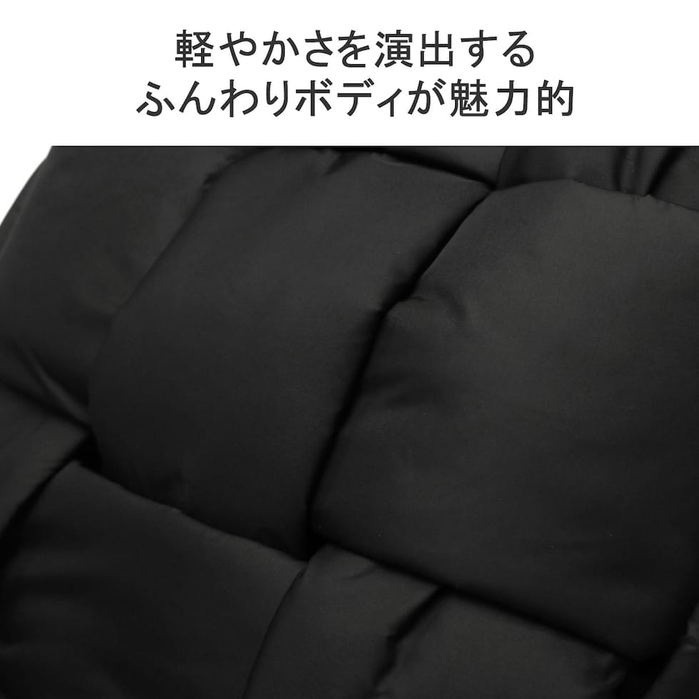 テープ状のボンディングナイロンを組み合わせたメッシュトート。思わず触りたくなるような、ふんわりとしたソフトな質感が魅力です。カジュアル感のある素材ながらも、レザーやゴールドのパーツをあしらうことで上品な印象に仕上げています。長さの異なるハンドル付きなので、シーンやコーデに合わせて持ち方を変えることが可能。長財布や500mlペットボトルなどがすっぽりと入るサイズ感で、デイリーに使いやすいアイテムです。