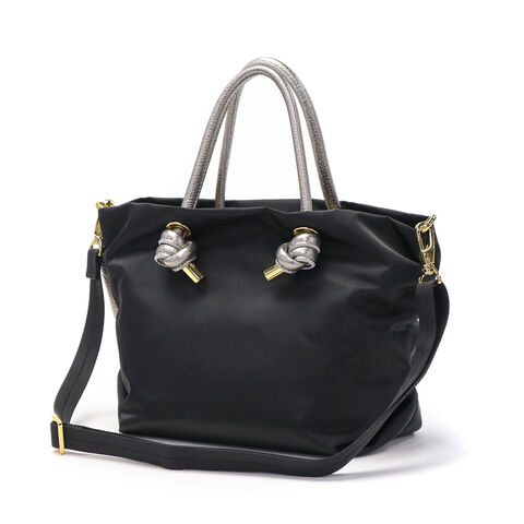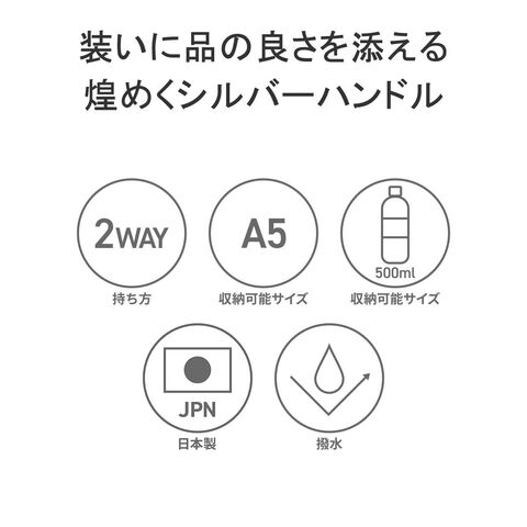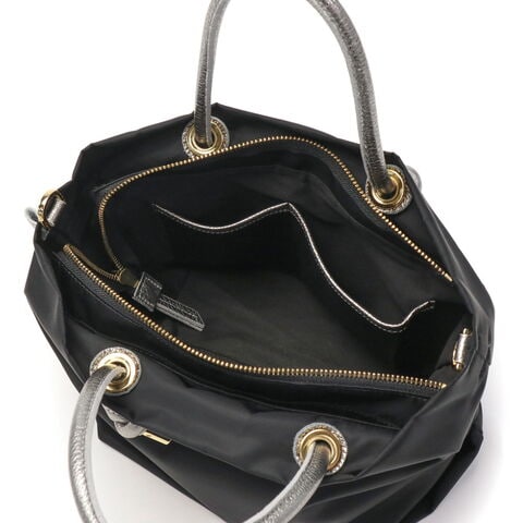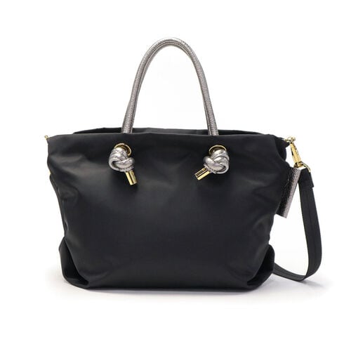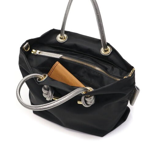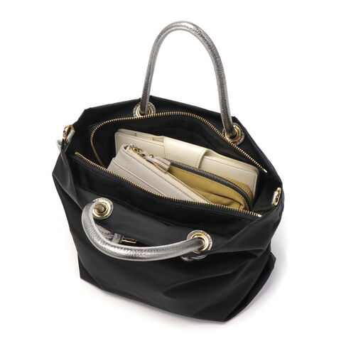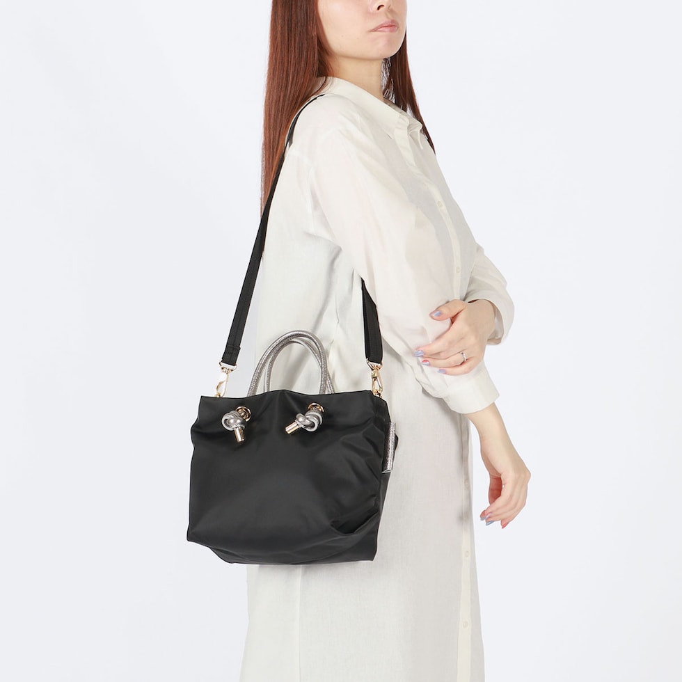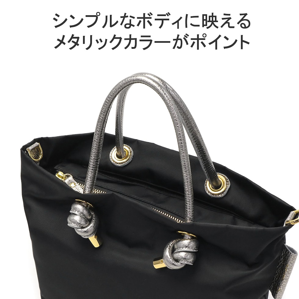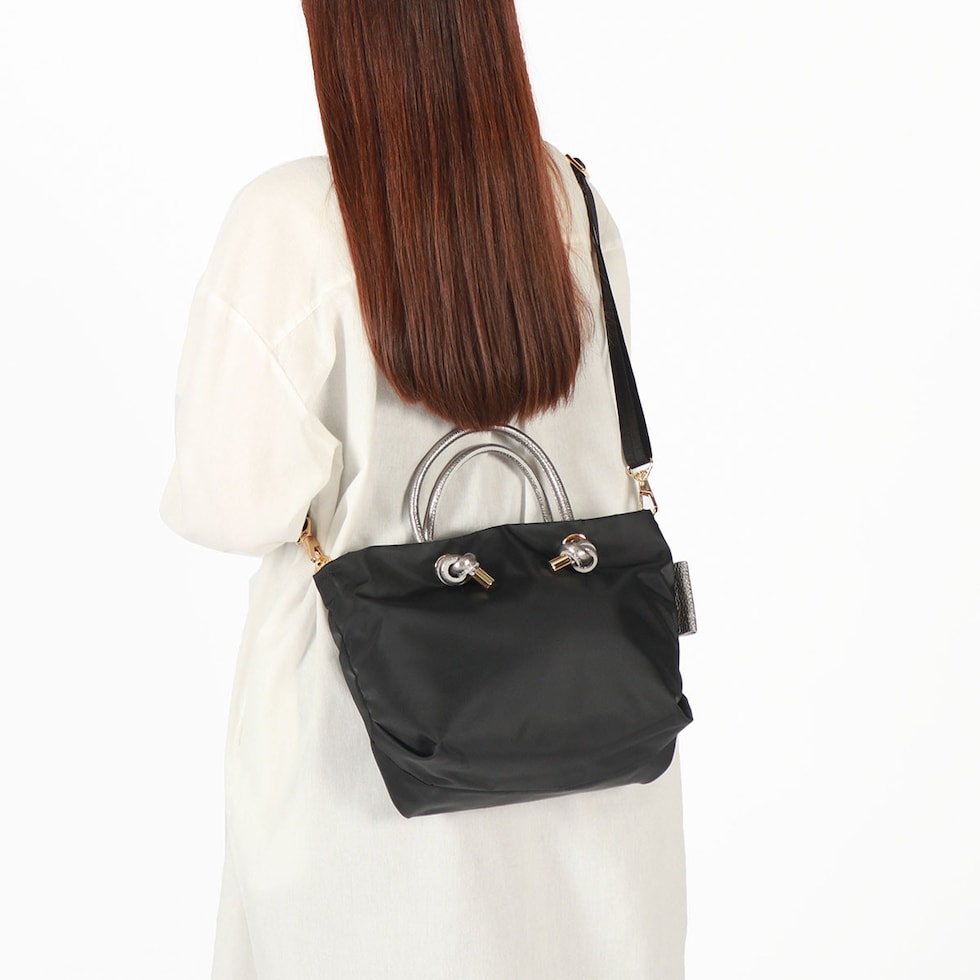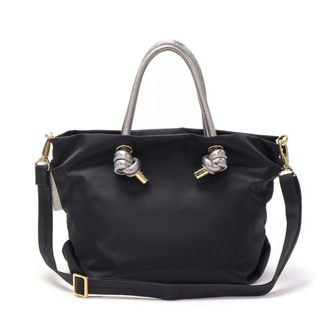 シンプルなデザインのボディに、メタリックレザーのノットハンドルがアクセントになった2WAYトートバッグ。内装はA5サイズが収容可能な大きさで、長財布やペットボトルなどが収納できます。弱撥水性が施されたナイロン素材で、お手入れがしやすく軽量に持ち運べるところもポイント。付属のショルダーストラップを取り付けて、斜め掛けや肩掛けなど持ち方を変えればコーディネートにも幅を利かせることができます。