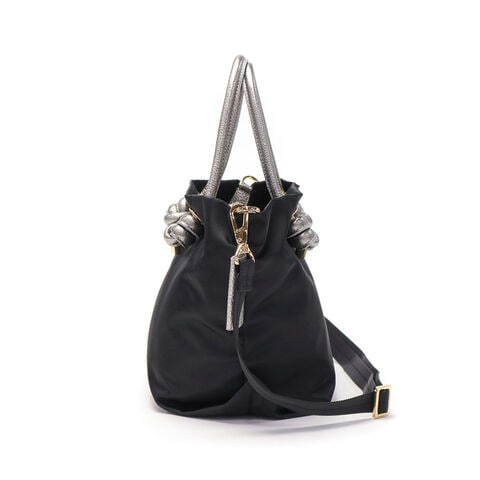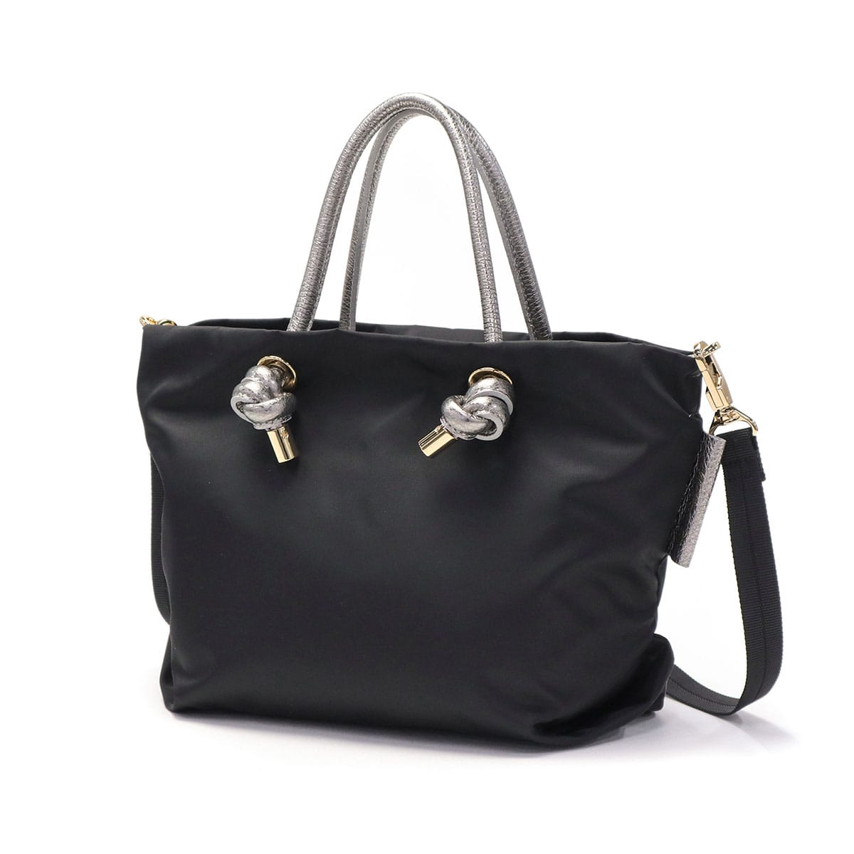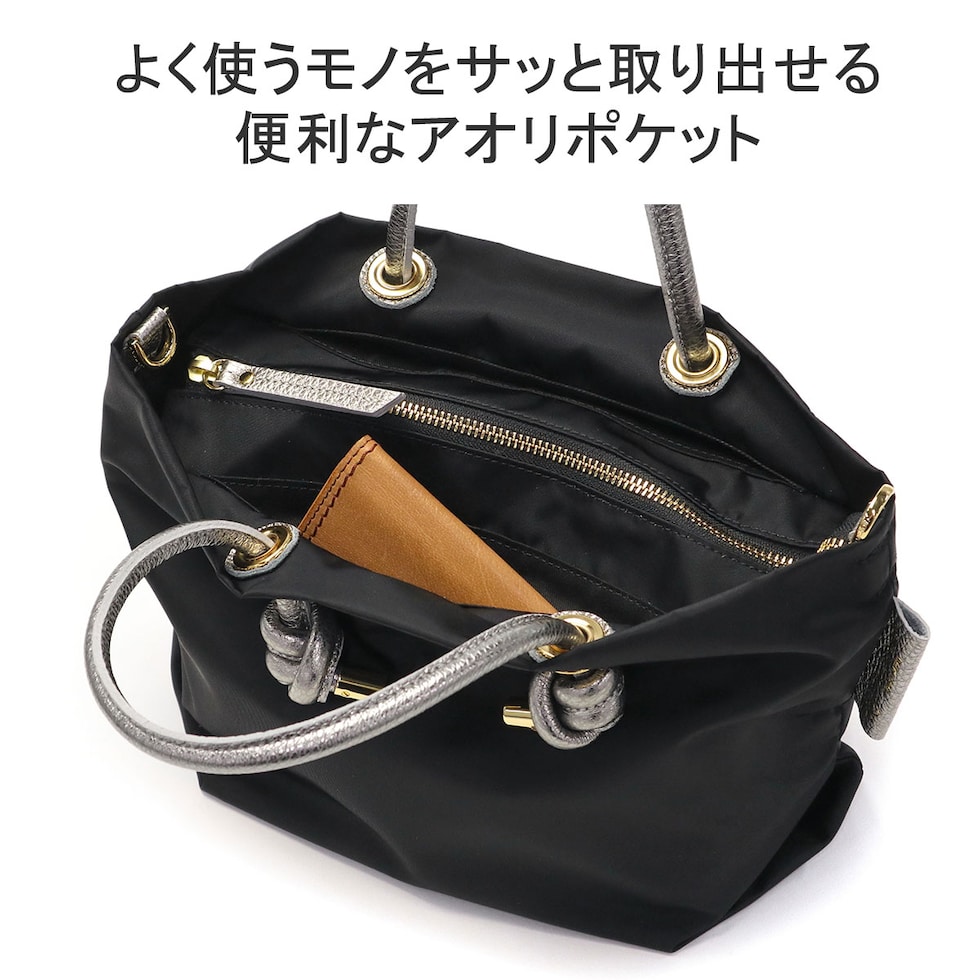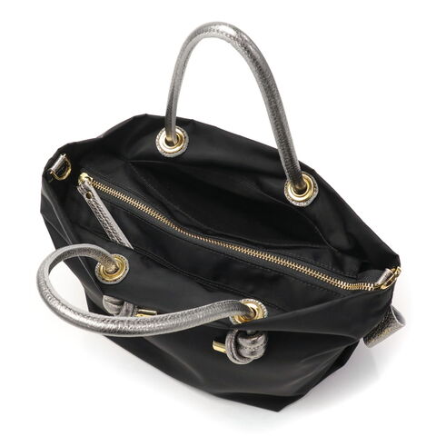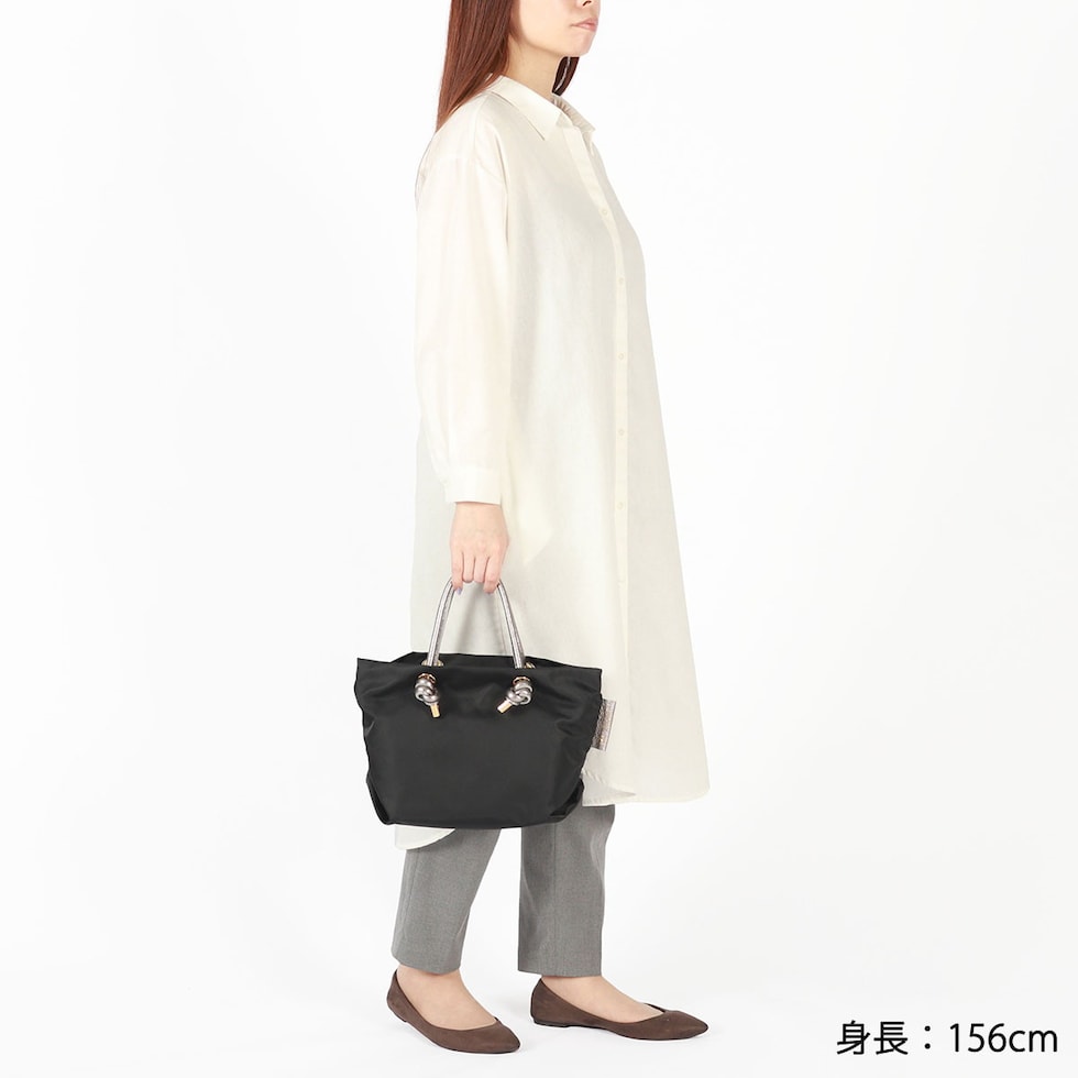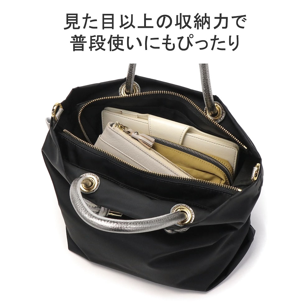 シンプルなデザインのボディに、メタリックレザーのノットハンドルがアクセントになった2WAYトートバッグ。内装はA5サイズが収容可能な大きさで、長財布やペットボトルなどが収納できます。弱撥水性が施されたナイロン素材で、お手入れがしやすく軽量に持ち運べるところもポイント。付属のショルダーストラップを取り付けて、斜め掛けや肩掛けなど持ち方を変えればコーディネートにも幅を利かせることができます。