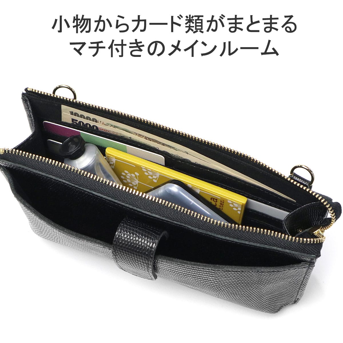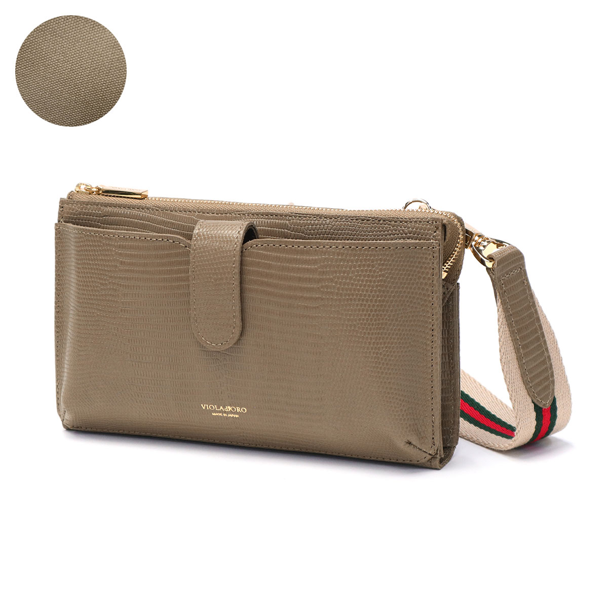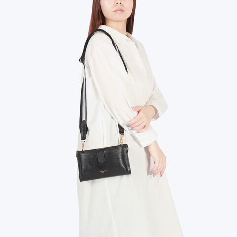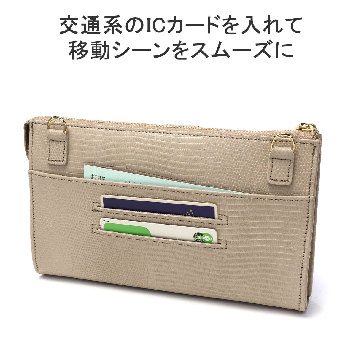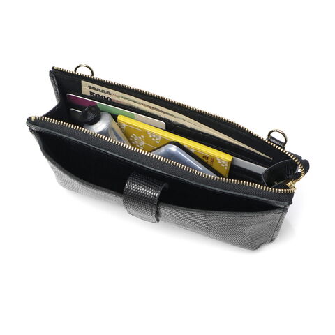 リザードの型押しレザーが上品なスマートフォンポシェットです。正面にはスマホが収納できるポケットを、背面にはカードスリットやジップポケットを配置し、最低限の荷物で外出したい方やキャッシュレス派にオススメのつくりに。視認性にも優れているため、必要な物がサッと取り出せる点も魅力です。