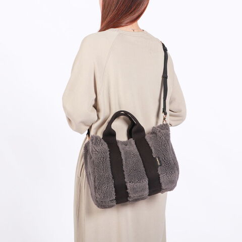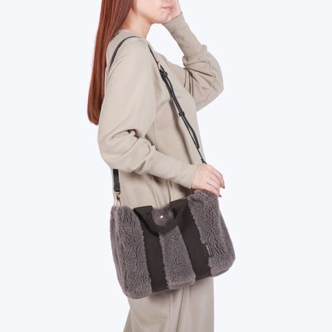 ボアが大人可愛いエコムートンを使用した2WAYファーバッグ。本体は、A5サイズが収まる大きさで、必需品や500mlペットボトル、小物類なども収納できます。また着脱可能な内ポケットとショルダーストラップが付属しており、トート・ショルダーの2WAYで持ち運べる仕様もポイントです。