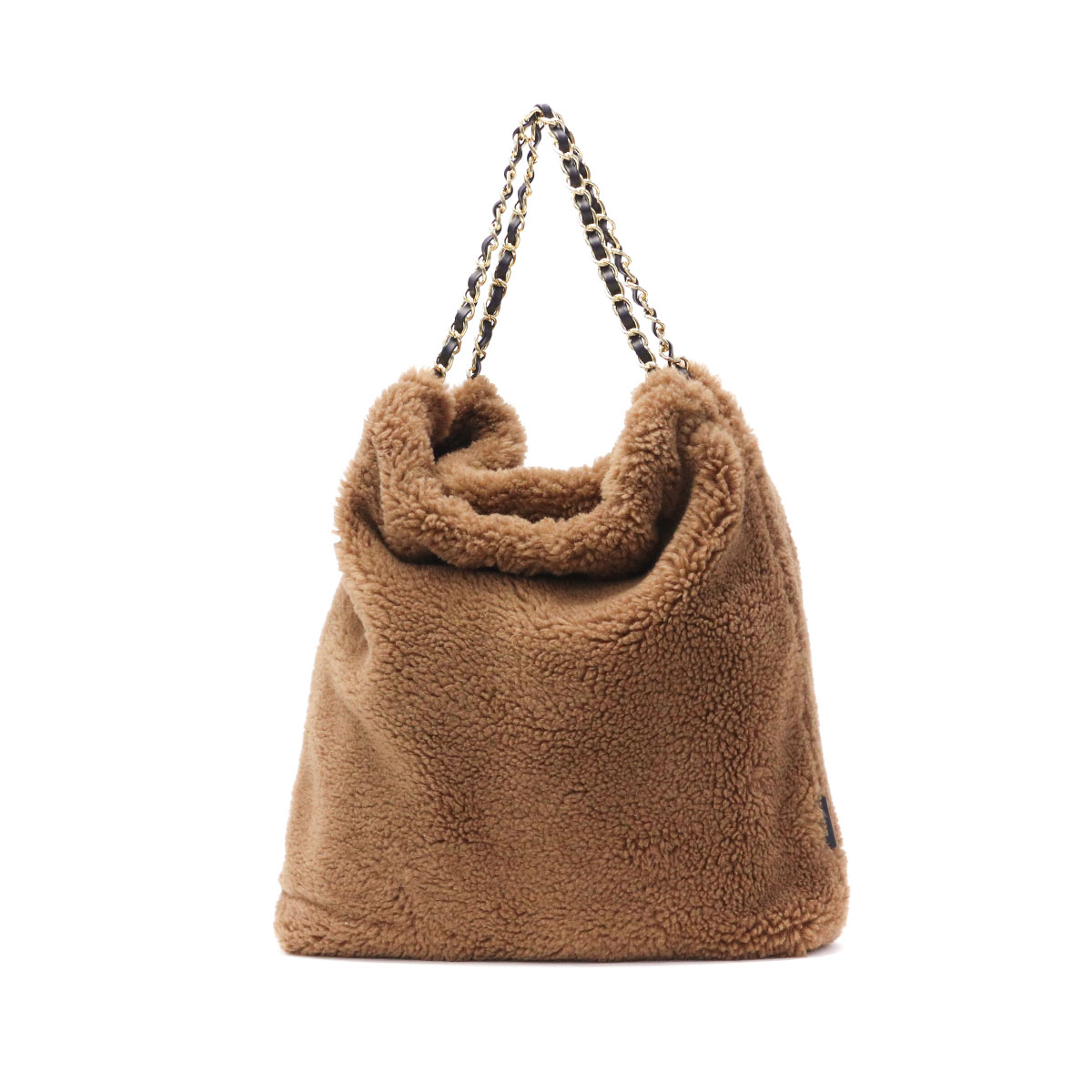ボアが大人可愛いエコムートンを使用した『ELMO』のLサイズファーバッグ。カジュアルな雰囲気で温かみのあるボア素材に、華やかなチェーンハンドルを組み合わせたデザインがポイントです。ワンタッチで開閉できるマグネット仕様で荷物の出し入れがスムーズに。ゆったり肩がけできる仕様のため、お出掛けはもちろん、秋冬の通勤バッグとしても最適です。