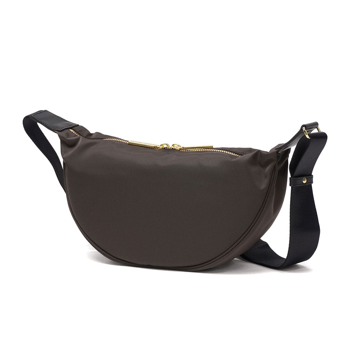 光沢感を抑えたマットな質感で高級感があり、大人女性が持ちやすいボディバッグ。機織りからコーティングまで製造を国内で生産しているこだわりの弱撥水性ナイロン素材を採用。コンパクトな見た目ながらも長財布や500mlのペットボトルが収納でき、ダブルファスナーで開閉がしやすく使い勝手抜群。金具のゴールド使いが女性らしい仕上がりとなっています。