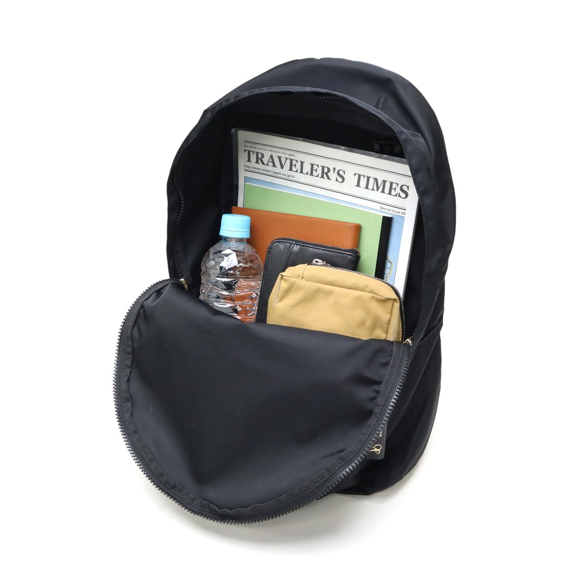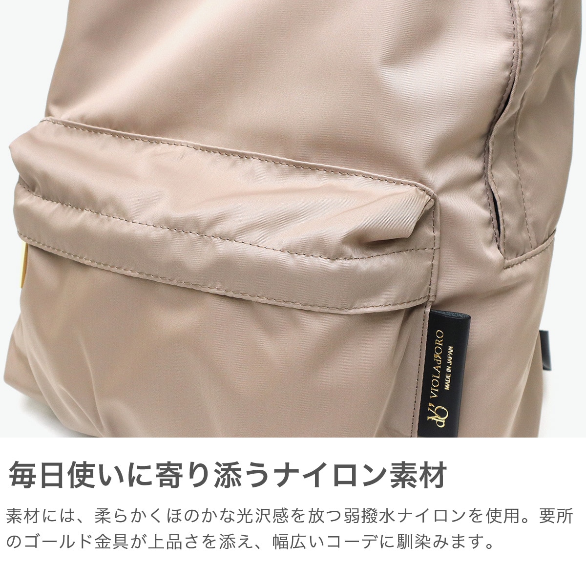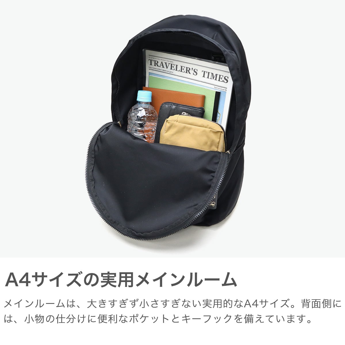 きれいめからカジュアルスタイルまで合わせやすい、ベーシックなデザインが魅力のシリーズ『GINO/ジーノ』のナイロンバックパック。上品な光沢感とゴールドの金具使いで、女性らしい印象に。弱撥水性のため、タウンユースにはもちろんレジャーシーンにもお使いいただけます。