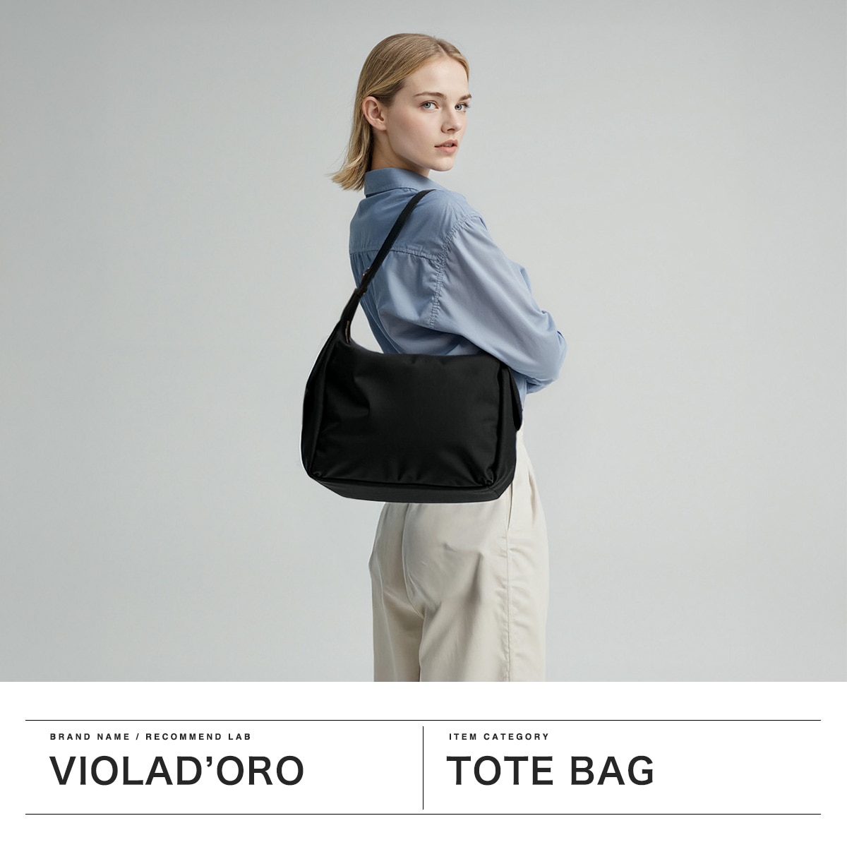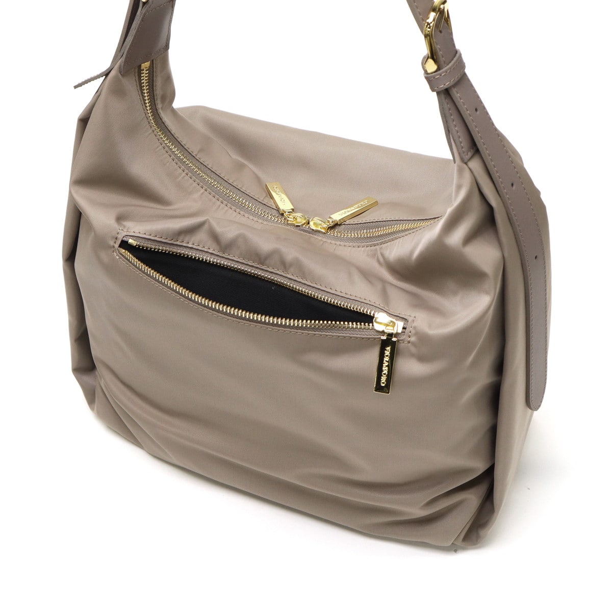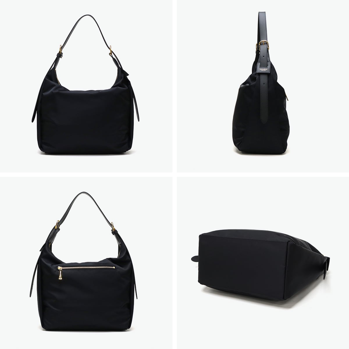 弱撥水効果のあるナイロン生地と、イタリアンレザーを使用したホーボーバッグ。ハンドルは長さ調節が可能で、無理なく肩掛けができるのが嬉しいポイント。豊富なポケットで荷物をしっかりと整理できるので、普段使いはもちろん通勤などでも活躍します。