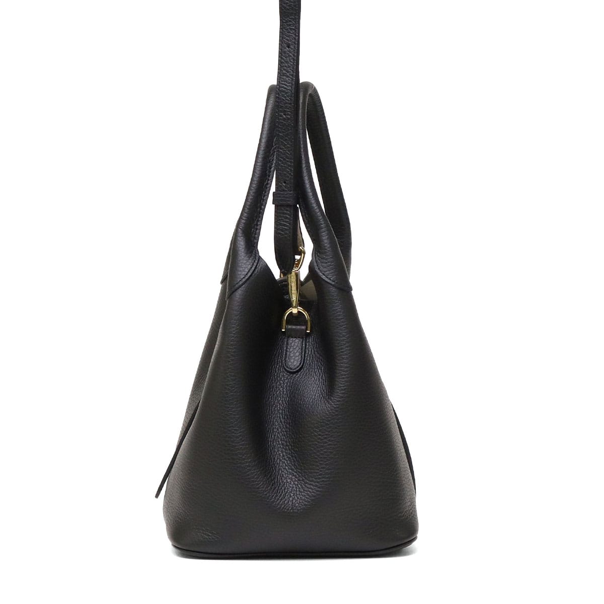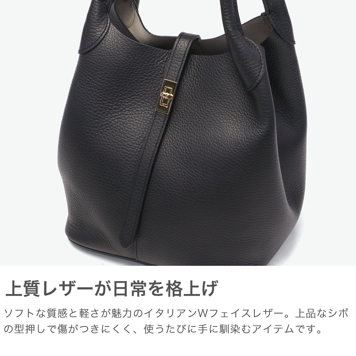 ソフトで軽やかなイタリアンWフェイスレザーを使用した、上品なベルト付きトートバッグ。傷が目立ちにくいシボ型押しで、毎日使いにも安心。コンパクトながら長財布がすっきり収まる実用的なサイズ感。2WAY仕様で通勤から休日まで幅広く活躍します。