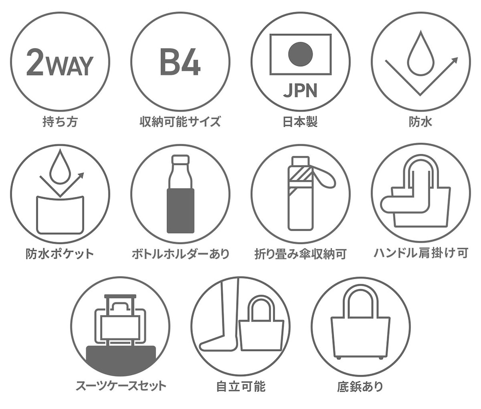 独立排水ポケットや独自の構造設計で高耐水性を実現したWRシリーズの2WAYトートバッグ。B4対応のメイン収納には底と繋がっていない仕切りを備え、荷物に合わせてフレキシブルに使用することが可能。背面にはセットアップ機能も備え、出張や旅行時にも心強いアイテムとなっています。