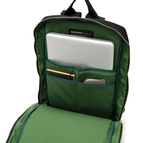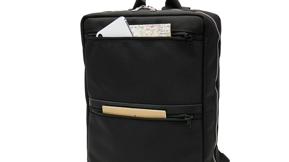 収納部はA4サイズがしまえるサイズで、スクエア型のフォルムのため書類もすっきりと収まります。内装には、PCやタブレットの収納に便利なクッション性のあるポケットや、小物類の仕分けに便利なポケットを装備し、ビジネスツールを綺麗に整理できます。