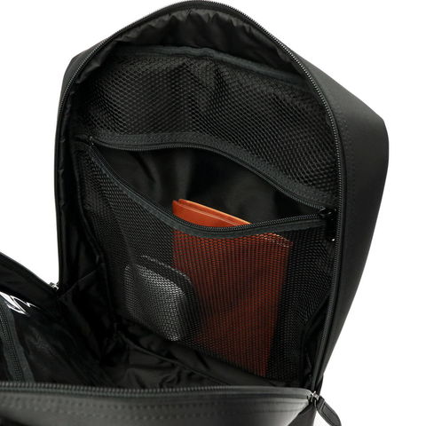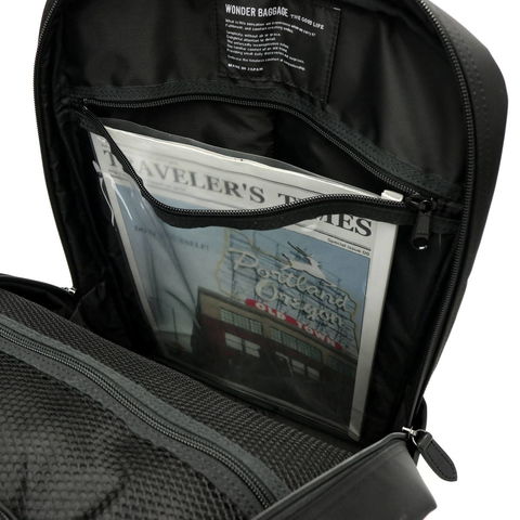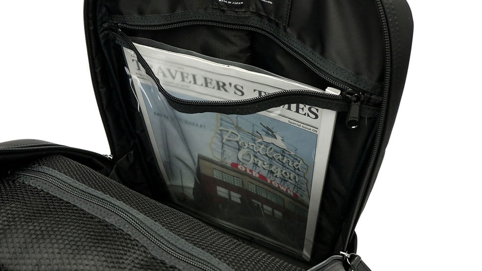 メインルームはA4サイズが余裕を持って収納可能。内装にはメッシュポケットとクリアポケットを装備し、視認性に優れただけでなく、直感的に入れる物を仕分けできるため取り出すときに迷うことがありません。