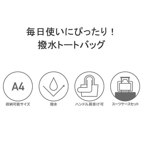 毎日使いに便利なA4サイズのトートバッグ。アクセントになるミニポーチが付属した、おしゃれなルックスがポイントです。本体内外には細かな荷物の整頓に役立つポケットを設けており使い勝手抜群です。また、本体外側背面には、スーツケースと連結が可能なセットアップ機能も装備。本体素材には、耐水性・撥水性に優れた高機能素材AQUASTOPPERを使用しており、急な雨天にも安心。また、ポーチとお揃いの可愛らしい内装デザインで、使う度気分が上がる仕上がりとなっています。