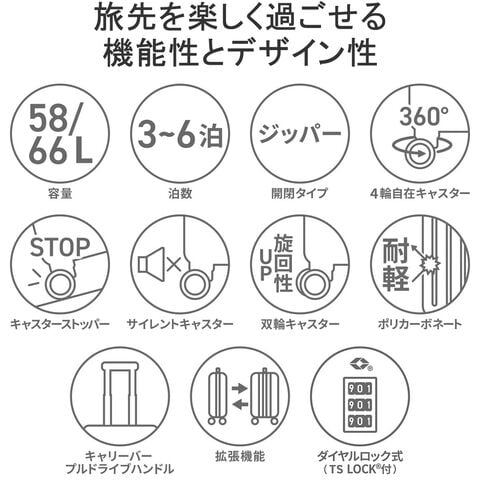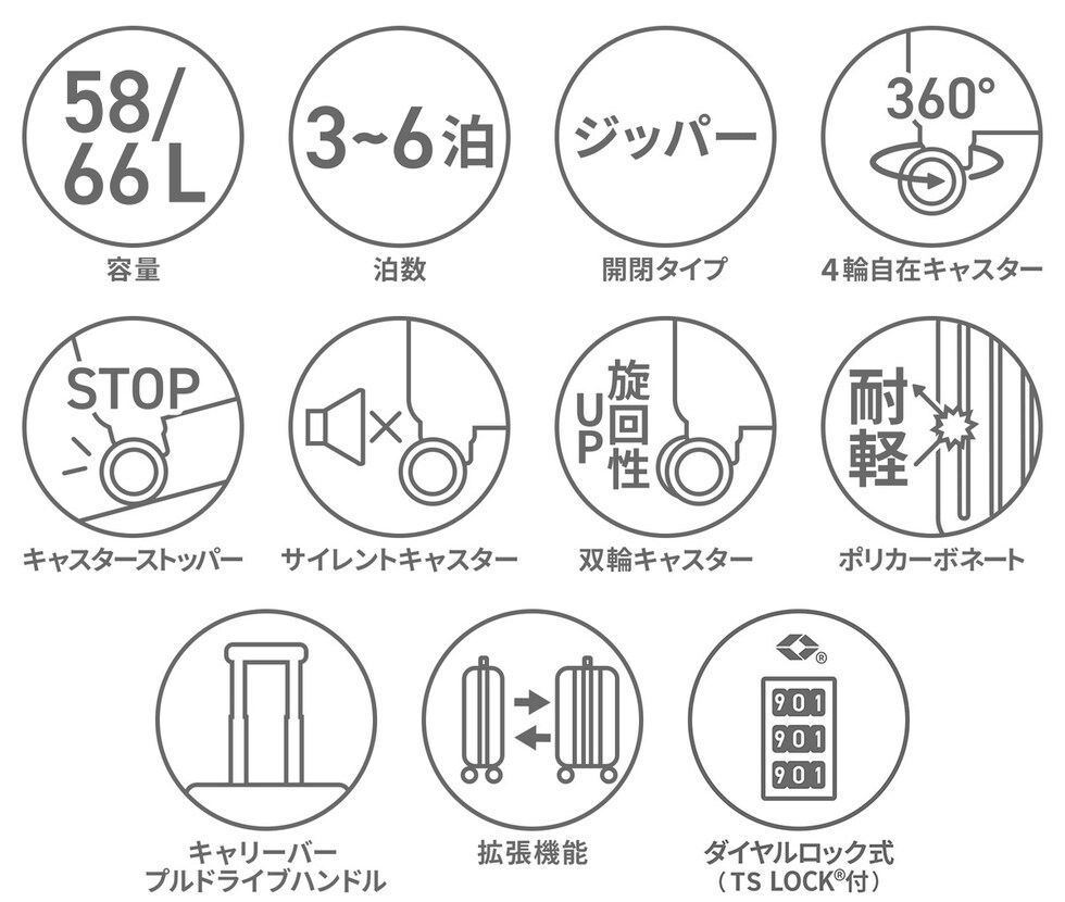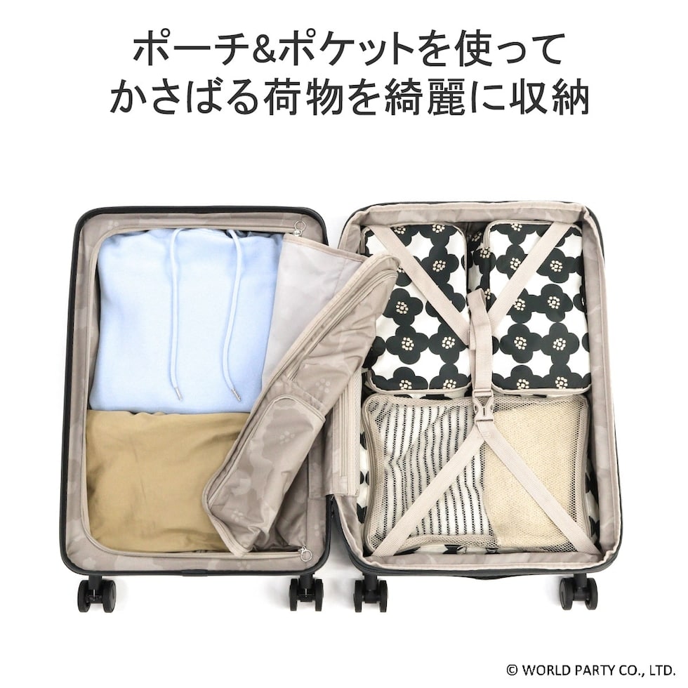 “雨の日を楽しく過ごしてもらいたい”というレイングッズメーカーならではの観点による、華やかで明るい色使い&デザインが特徴のスーツケースです。長期旅行に適した大きめの設計にも関わらず、5~6泊程の荷物にも対応する拡張機能を搭載。さらにアイテムの仕分けに便利なポーチも付属しており「パッキングが苦手…」という方でも安心してご利用いただけます。旅先へ持ち運ぶ物だからこそ、機能的でおしゃれな物を選んでみませんか。