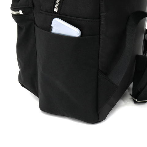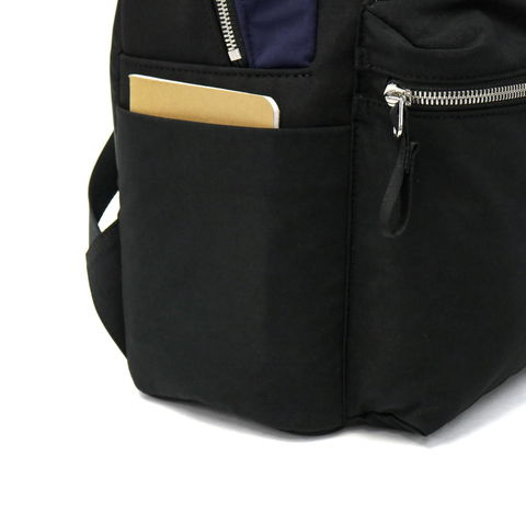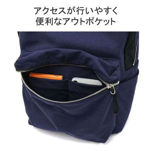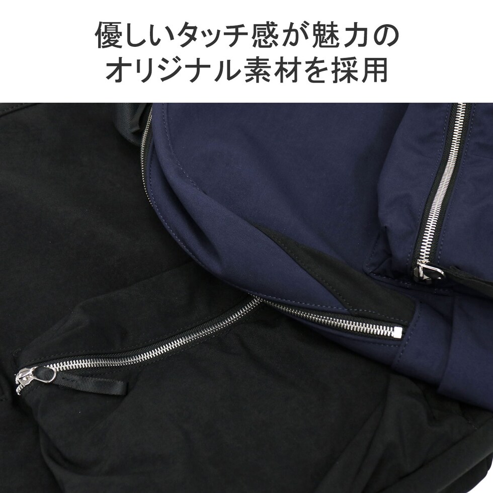 収納部は、A4ノートや13インチのPCが収まる、便利なサイズ感でデイリー使いに最適です。本体フロント部分にはスムーズに荷物を取り出せる収納スペースを装備。荷物を効率的に収納できるだけでなく、移動中の荷物の取り出しが行いやすいため、スマホやパスケースなどの管理に重宝します。シンプルなデザインながら気の利いた設計で、日々の外出のお供に最適な仕上がりになっています。また、メインの素材はナイロンのジャージー編みに塩縮加工を施し、しっかりと目を詰めた手触りのよいオリジナル素材を採用しています。織物とは違う優しいタッチ感が魅力的です。