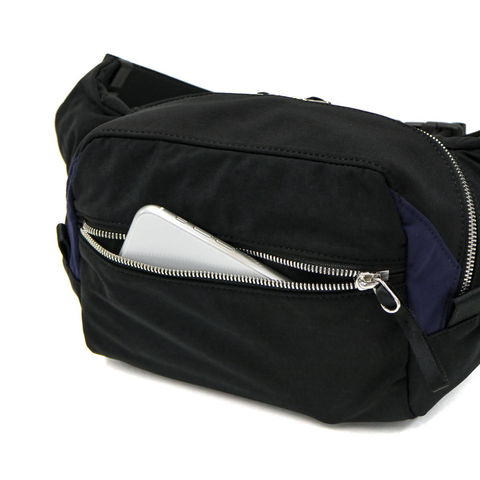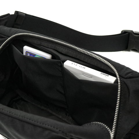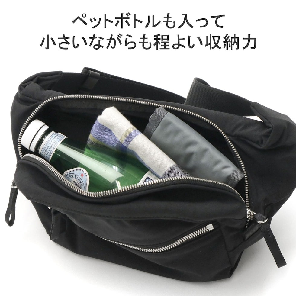 小さめのサイズ感ながら、500mlペットボトルも横にすることで収納可能。荷物少なめの方におすすめです。収納部が大きく開く構造もポイントとなっており、ダブルファスナー仕様なので利き手を選ばず開けやすく、大きく開き中身が見やすいのも魅力となっています。