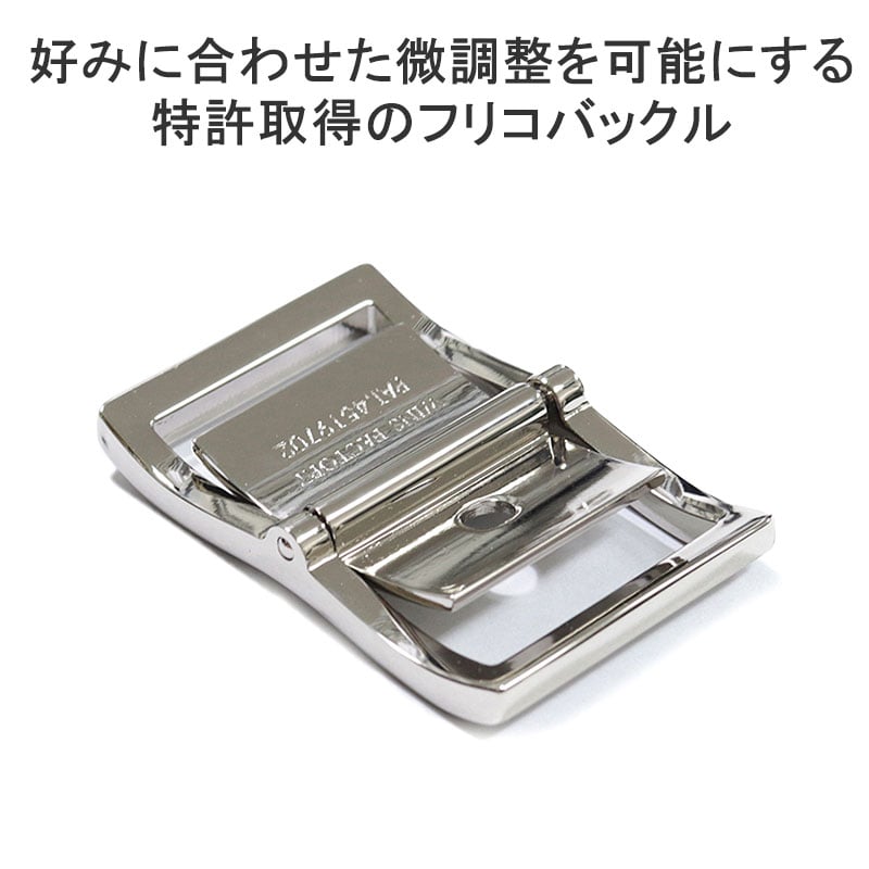 革の特徴と使い易さを考えて開発されたフリコベルトは、革の摩擦抵抗を利用して止まる仕組みの、無段階調整が可能なベルトです。ピンホールがなくフリーサイズでご利用いただける上、微調整が簡単にできるのが特徴です。定番のロングセラーのビジネスタイプは、バランスのいいシンプルなつくりで使いやすさ抜群。ベルト革はイタリアのトスカーナ地方で制作されており、使うほどに艶としなやかさが増すので愛着を持って永くお使いいただけます。