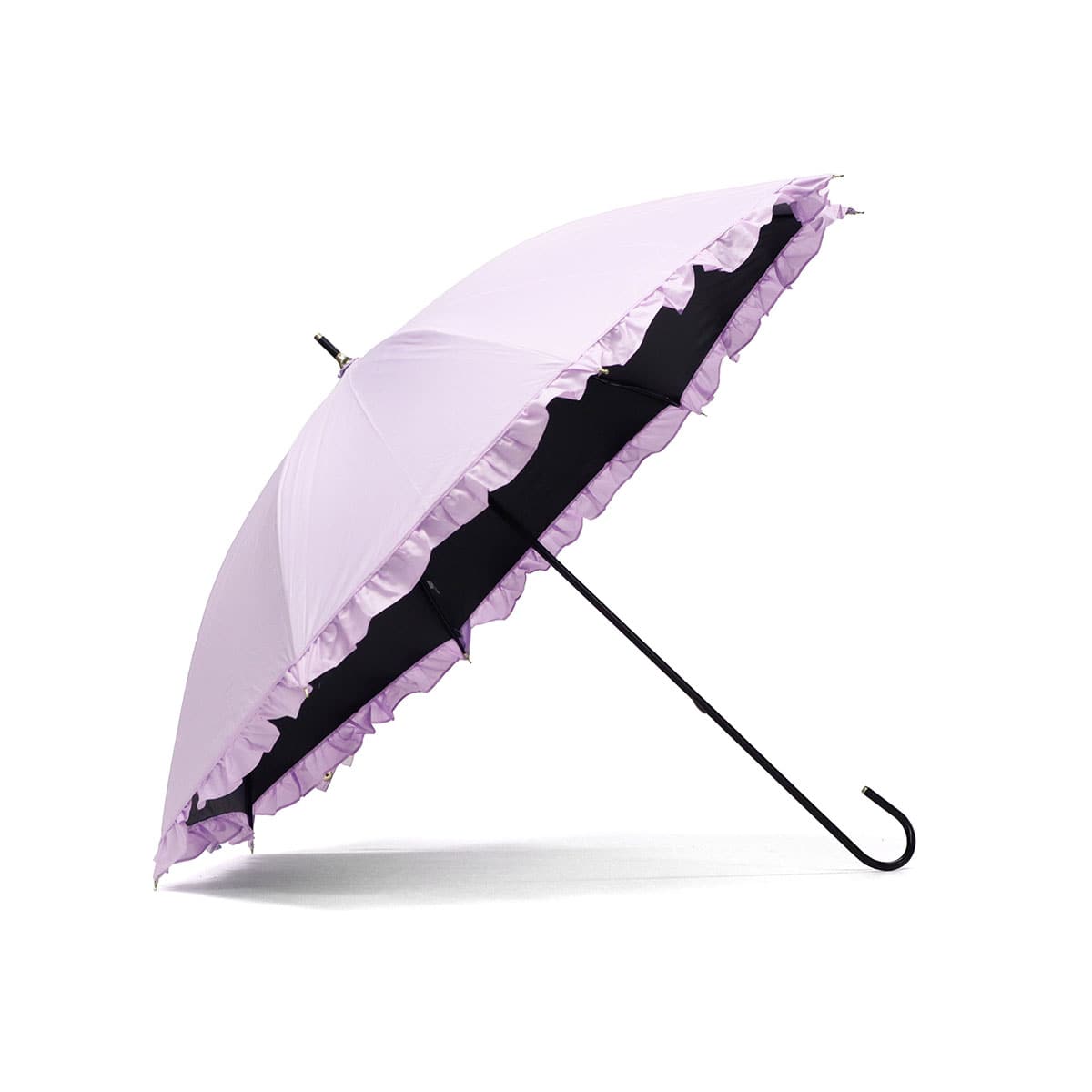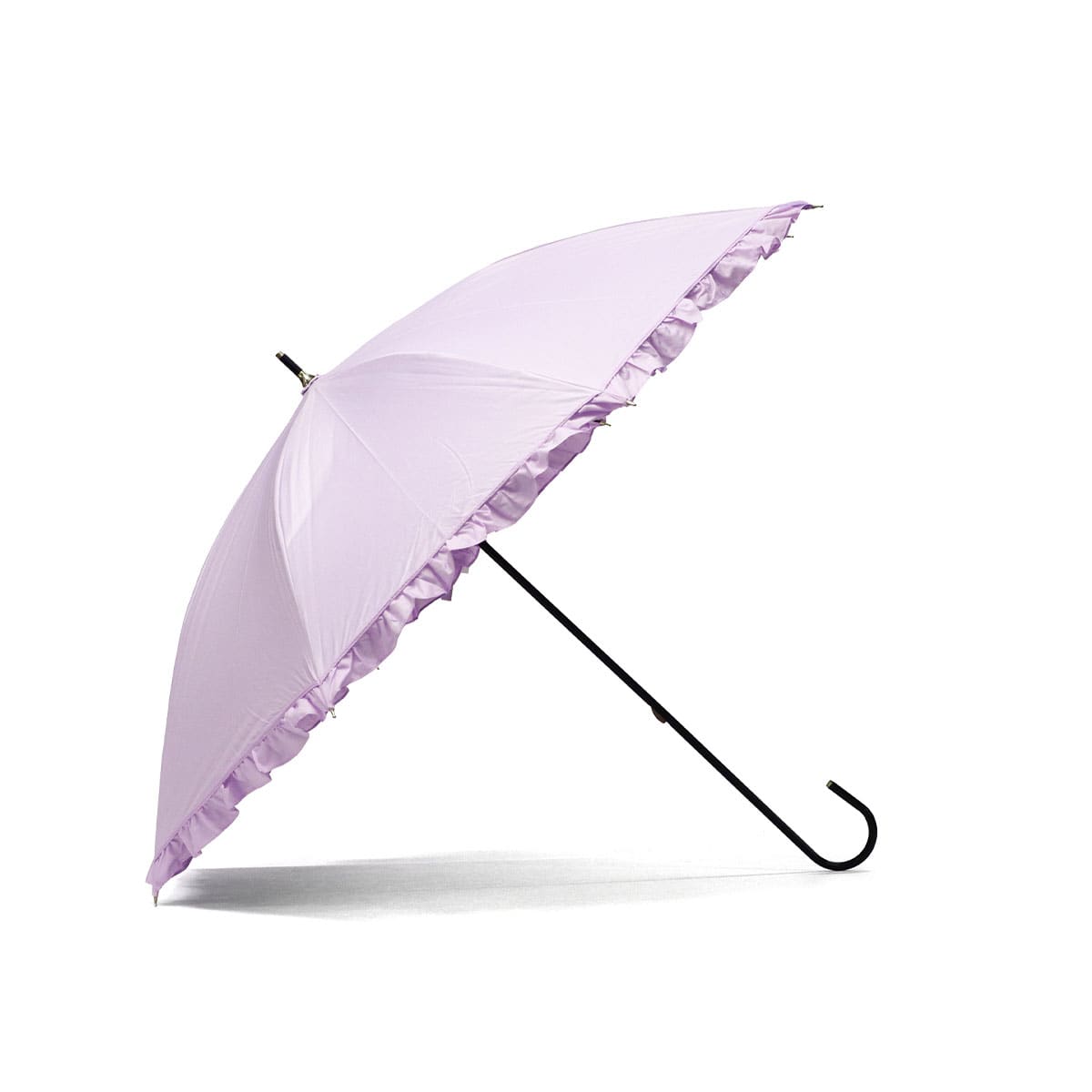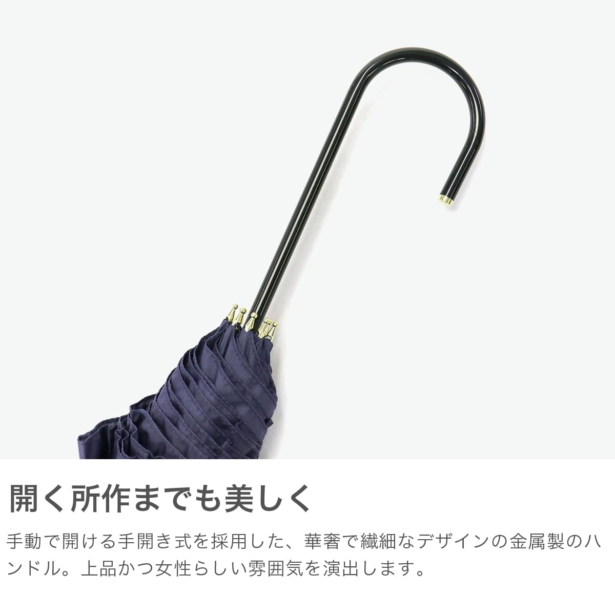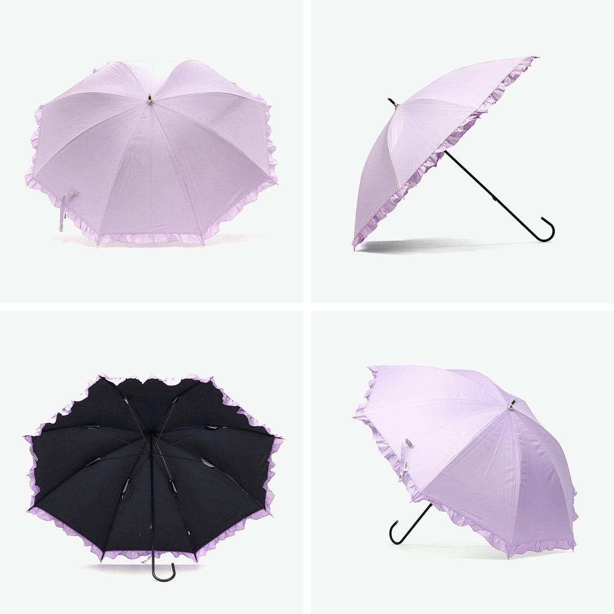 上品で可憐なフリルが人気の、完全遮光100%のフェミニンな晴雨兼用の長傘。レトロな黒の金属製ハンドルが手元を美しく引き立て、控えめな甘さが大人の装いに寄り添います。晴れの日も雨の日も、気分まで優しく包み込んでくれる一本です。