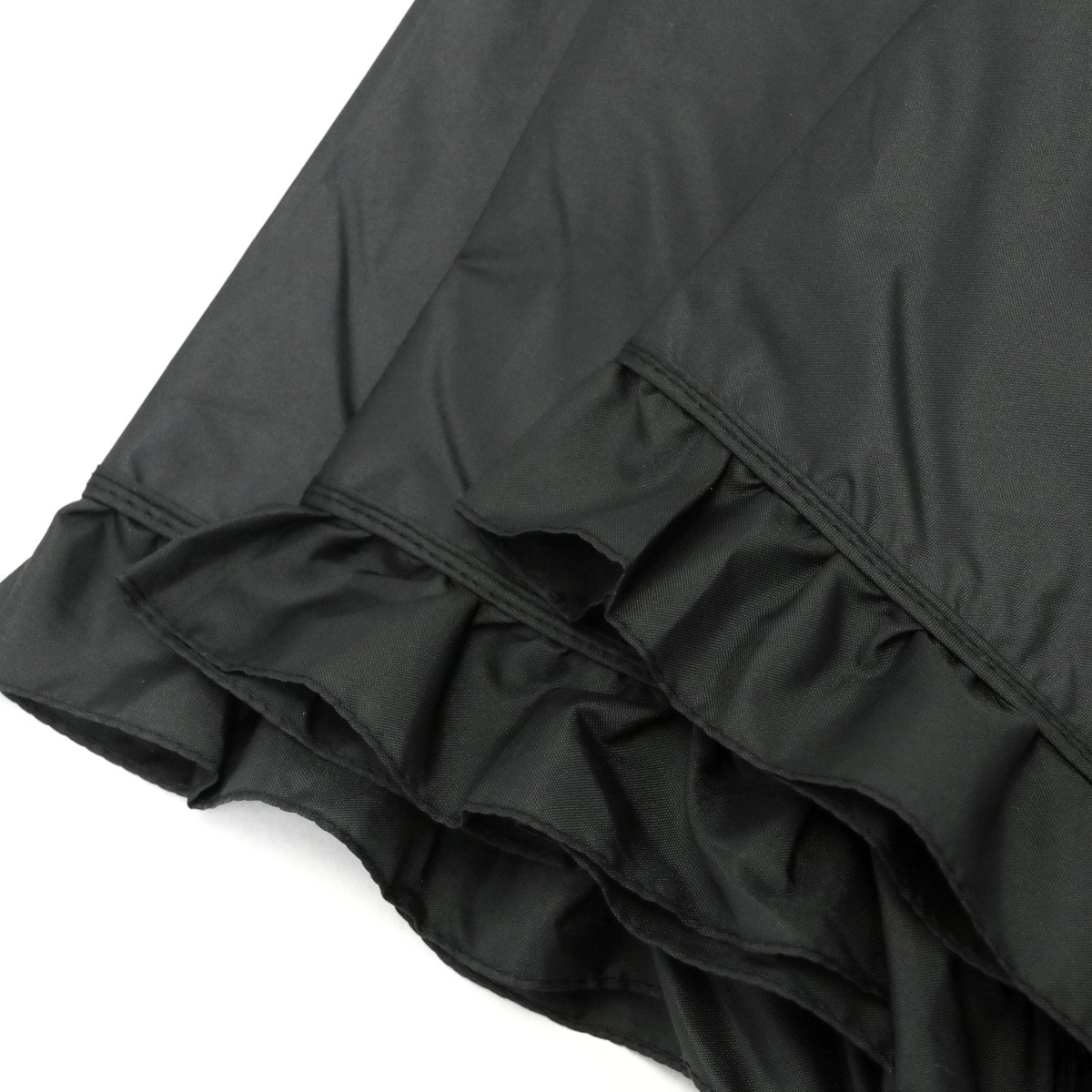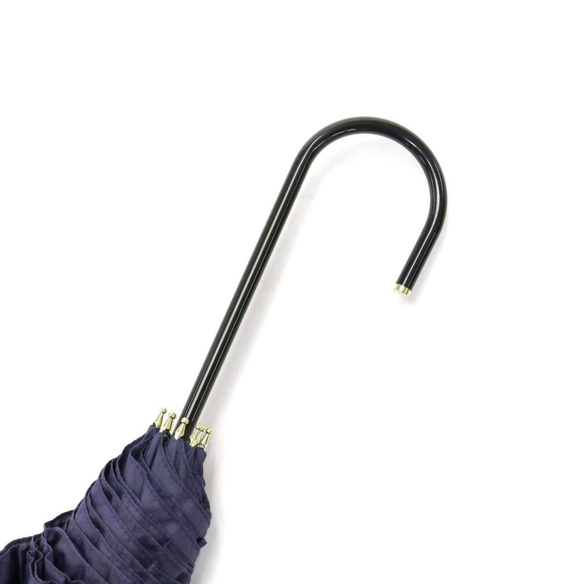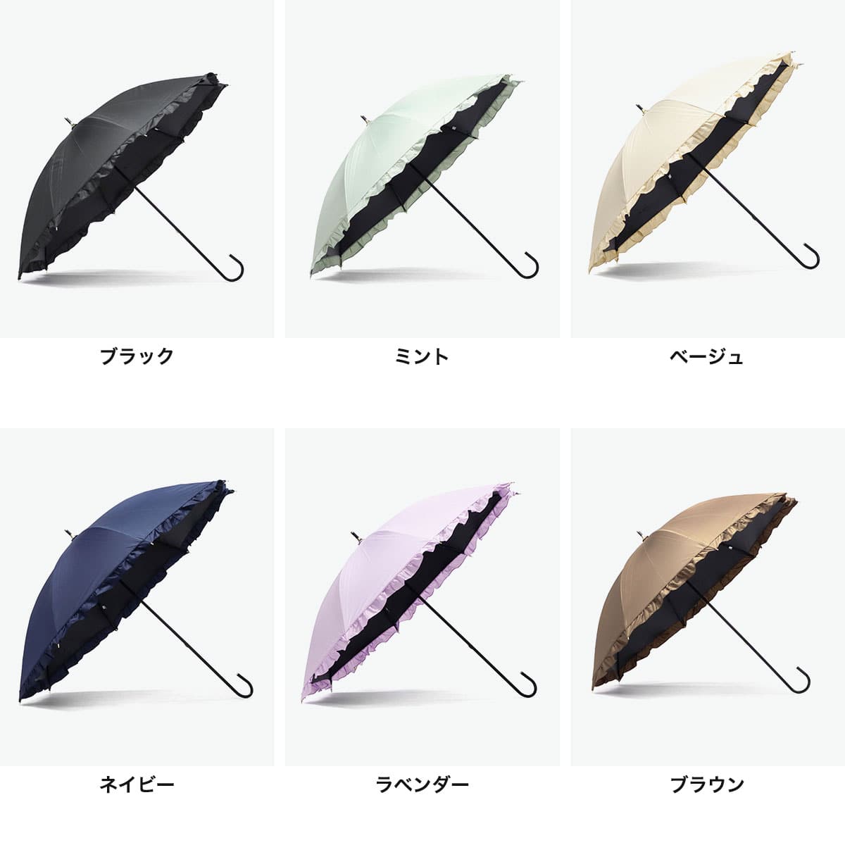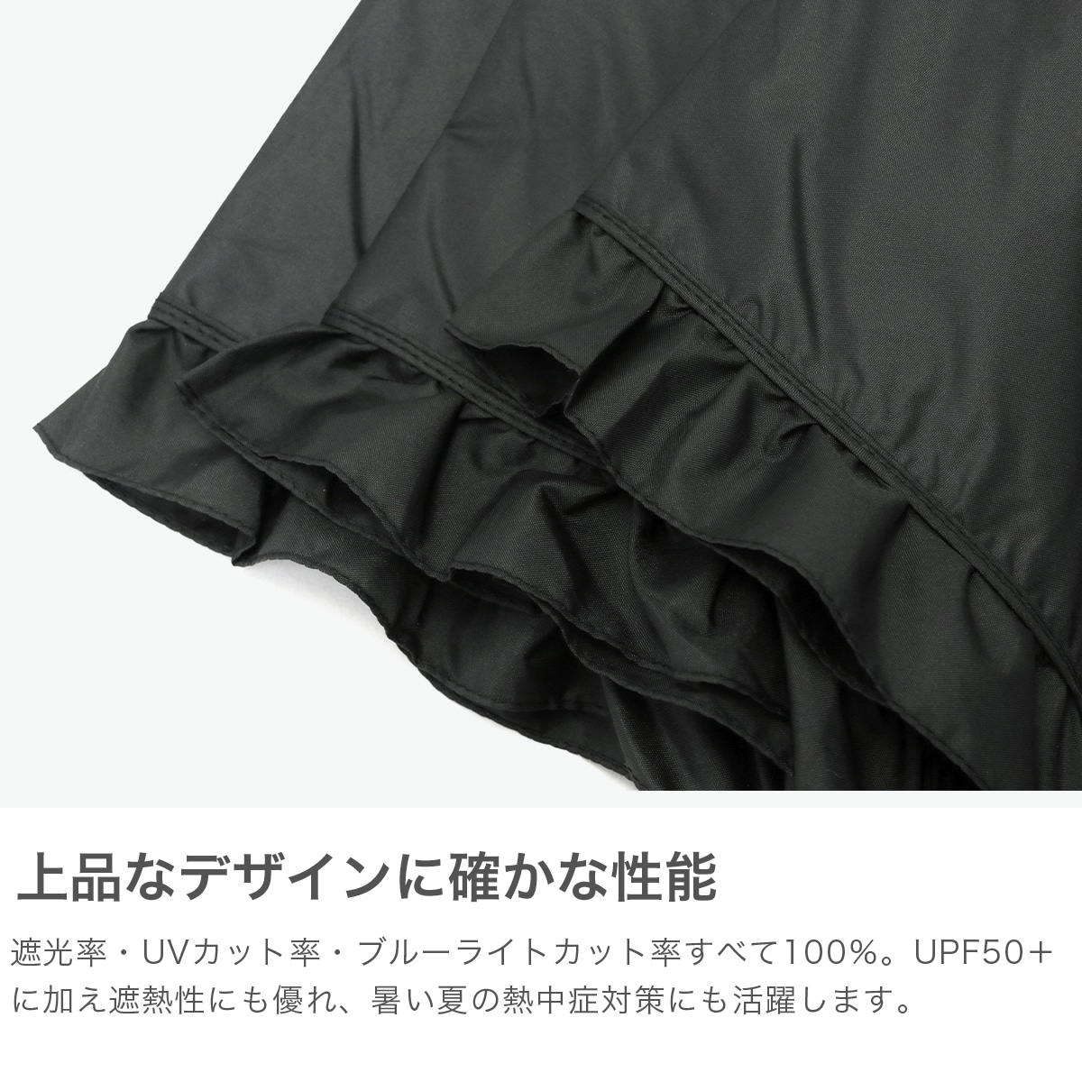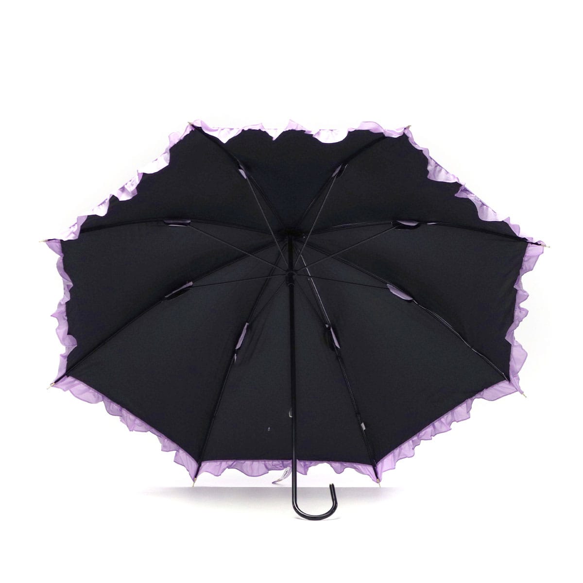上品で可憐なフリルが人気の、完全遮光100%のフェミニンな晴雨兼用の長傘。レトロな黒の金属製ハンドルが手元を美しく引き立て、控えめな甘さが大人の装いに寄り添います。晴れの日も雨の日も、気分まで優しく包み込んでくれる一本です。