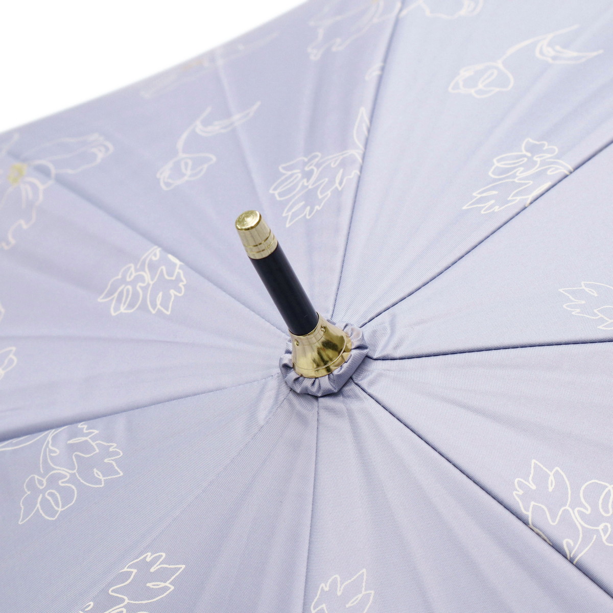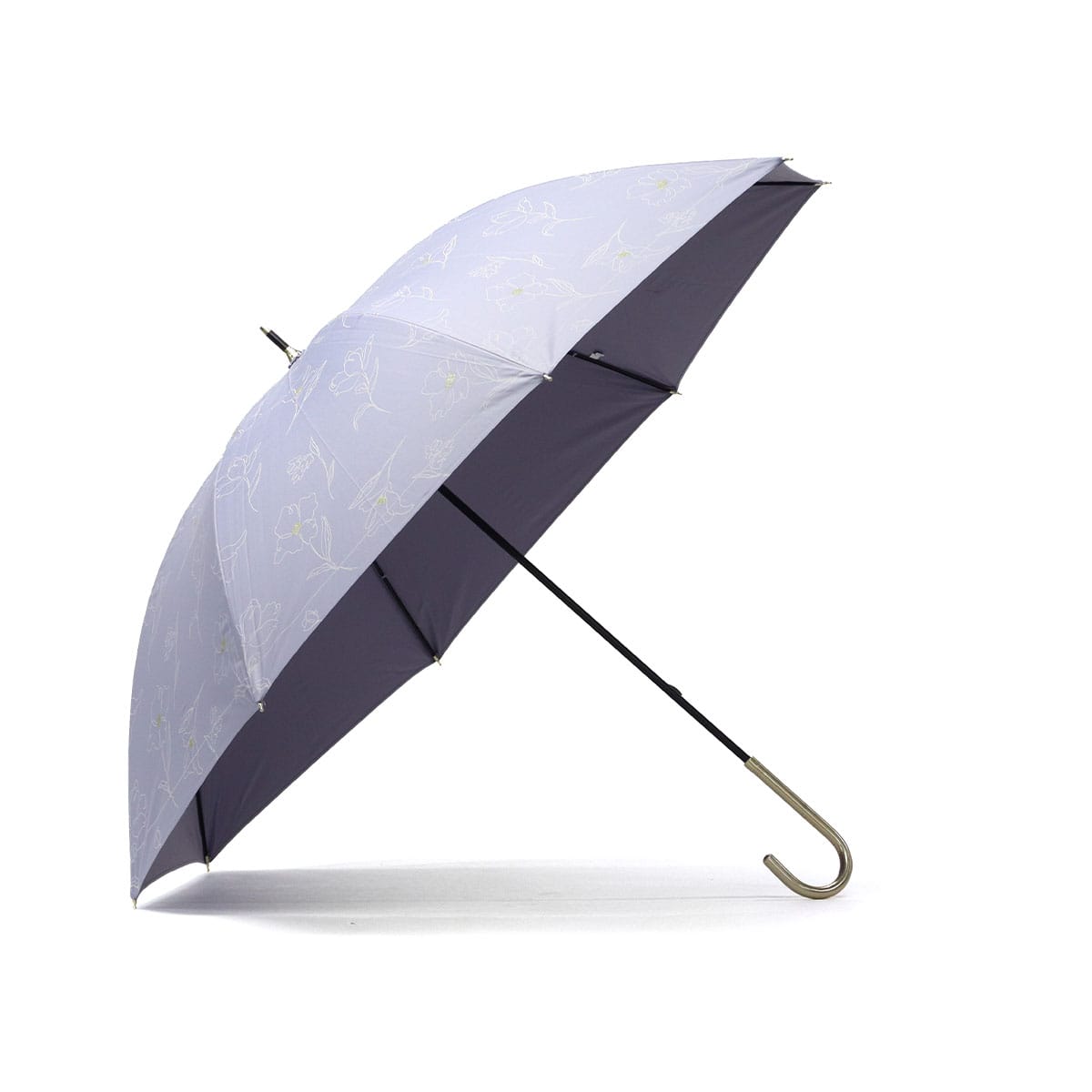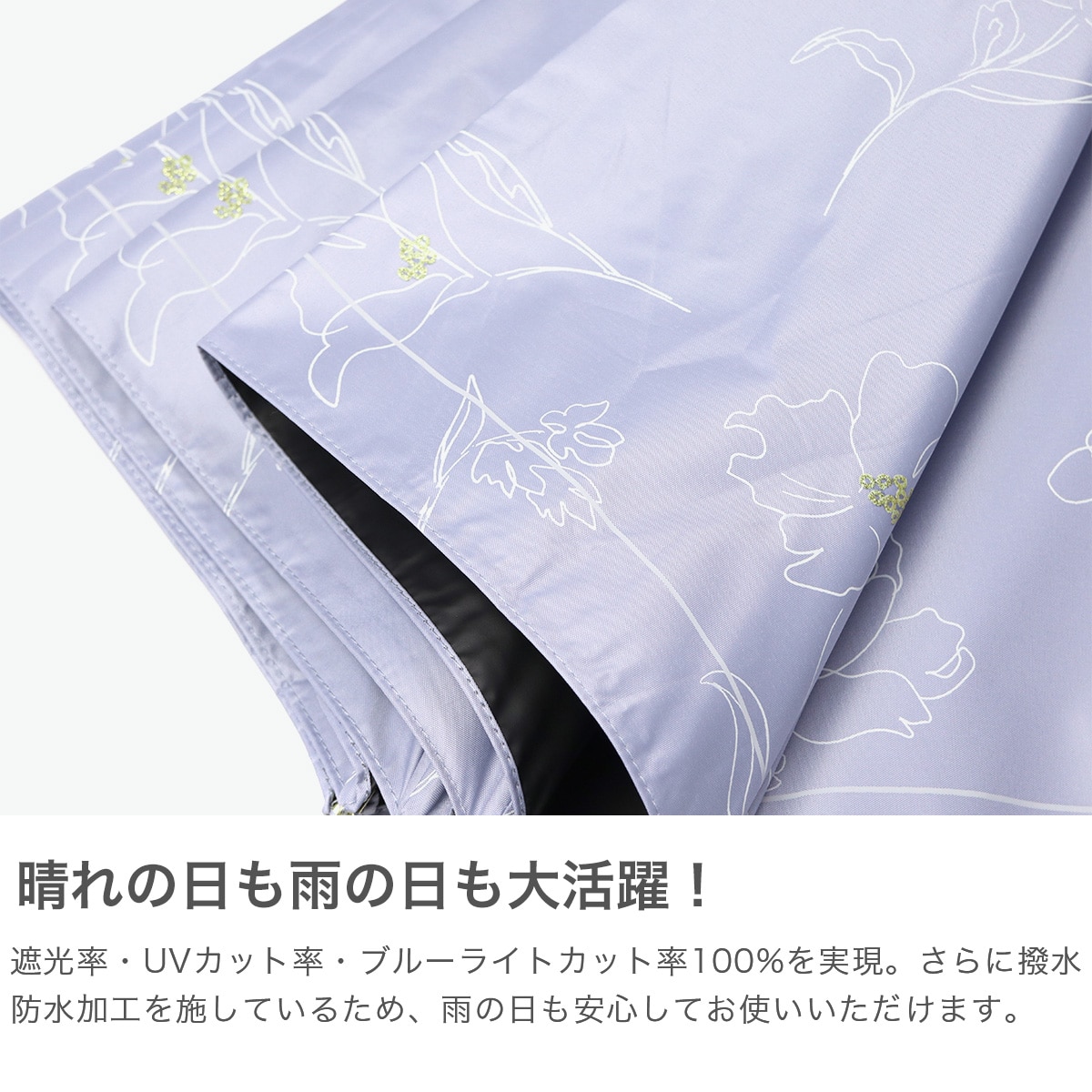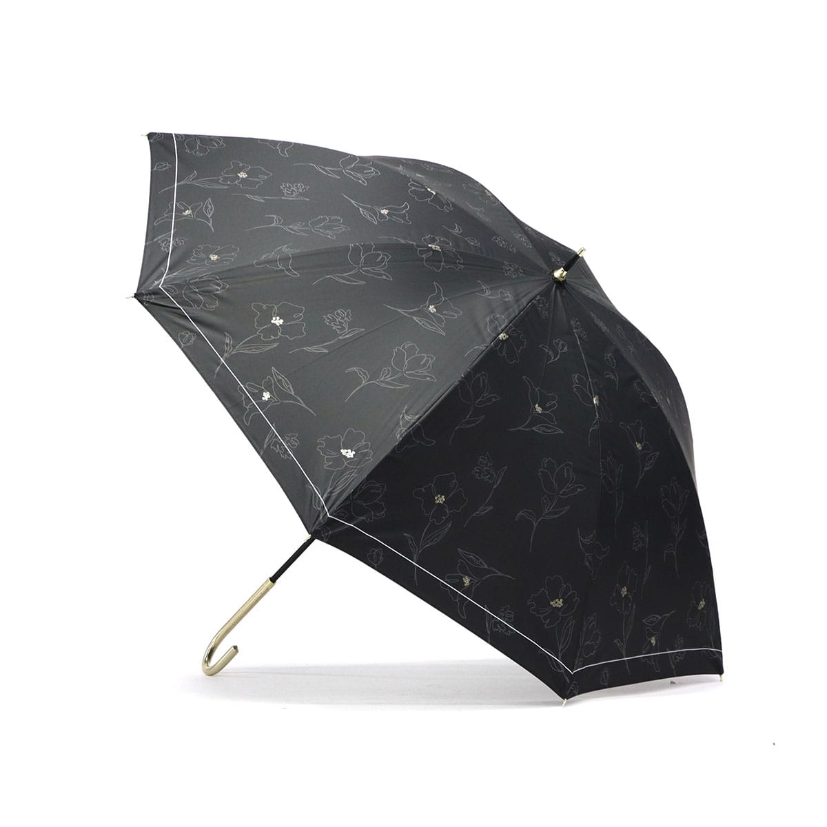 傘を開くと雨の日でも気分が晴れそうな、美しいフラワーデザインの晴雨兼用傘。持ち手には女性の手元を美しく見せてくれるフェイクレザーを採用。遮光率・UVカット率・ブルーライトカット率100%、UPF50+を実現し、親骨は大きめの55cmで紫外線をしっかりガードしてくれる、頼もしい1本に仕上がっています。