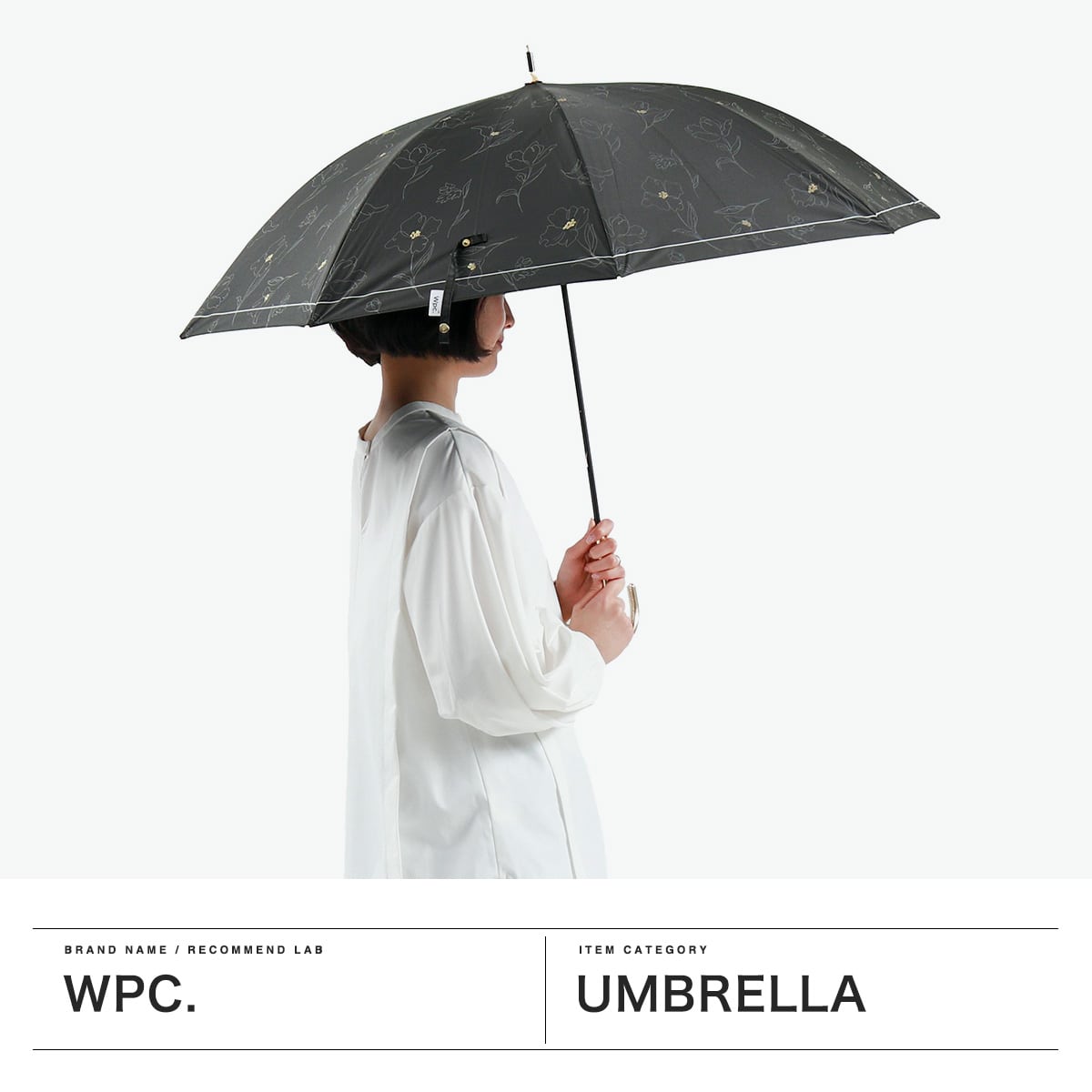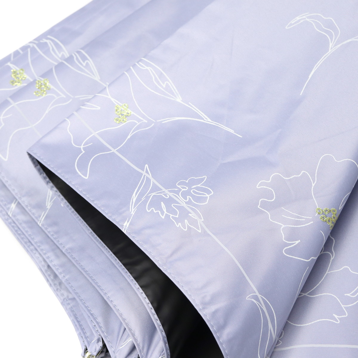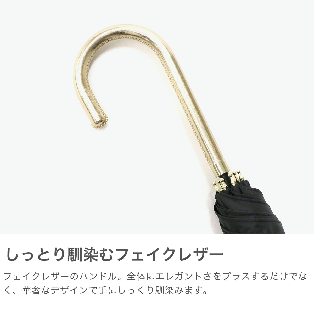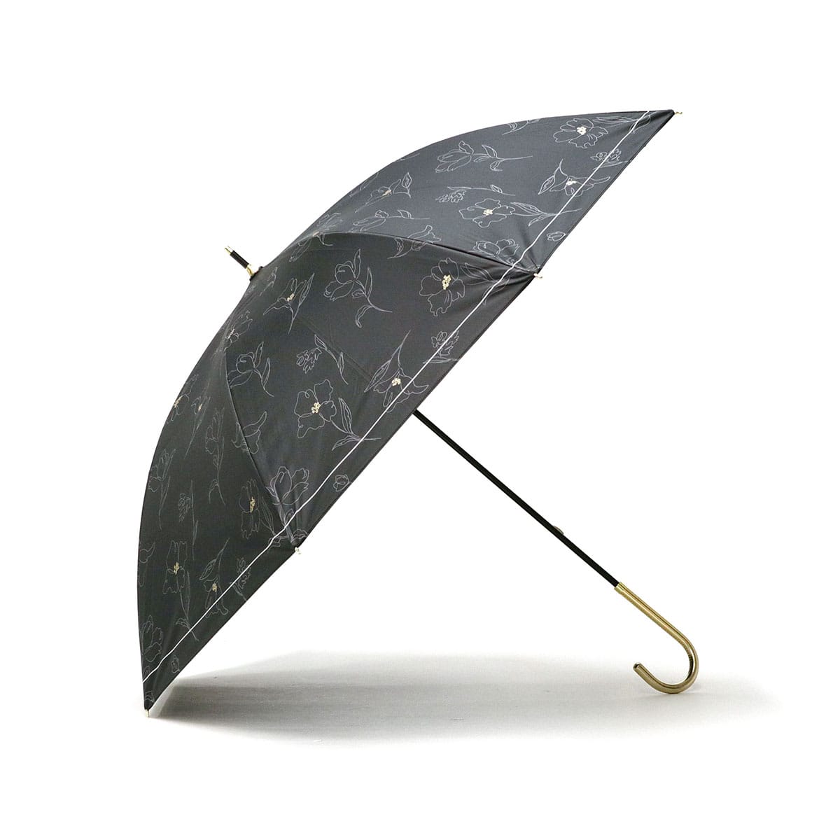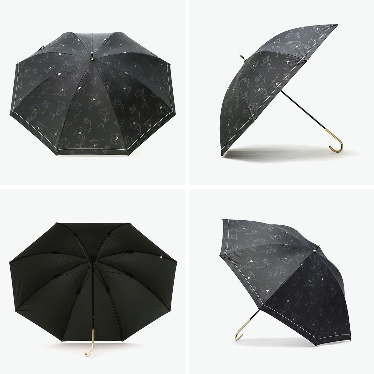 傘を開くと雨の日でも気分が晴れそうな、美しいフラワーデザインの晴雨兼用傘。持ち手には女性の手元を美しく見せてくれるフェイクレザーを採用。遮光率・UVカット率・ブルーライトカット率100%、UPF50+を実現し、親骨は大きめの55cmで紫外線をしっかりガードしてくれる、頼もしい1本に仕上がっています。