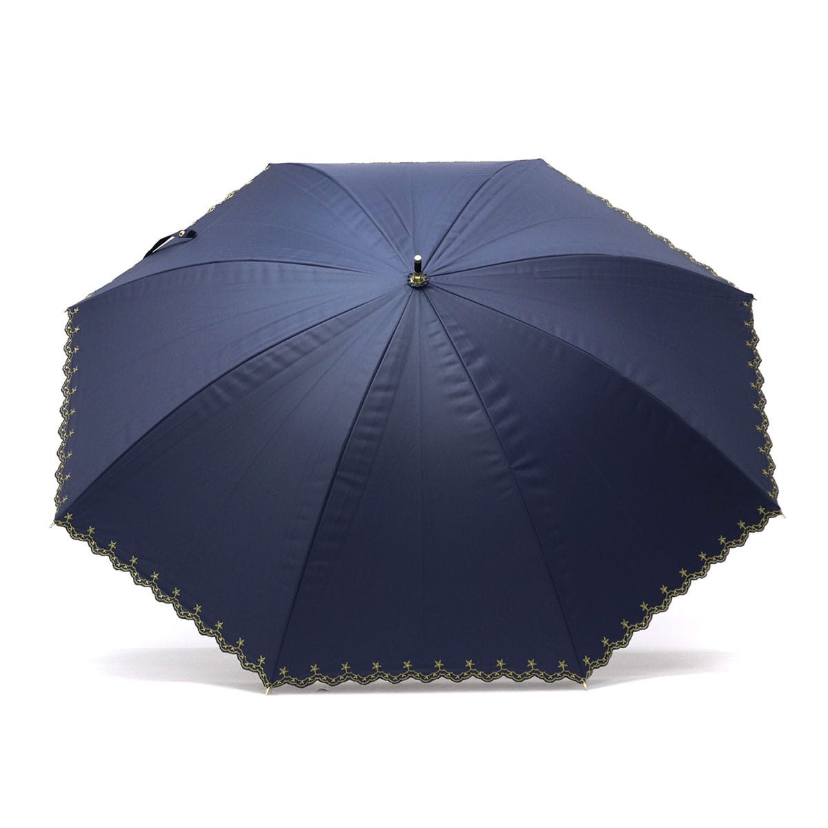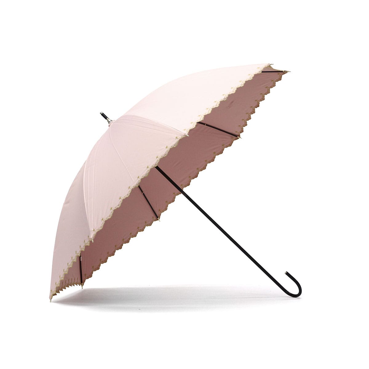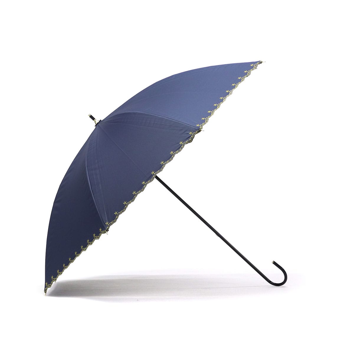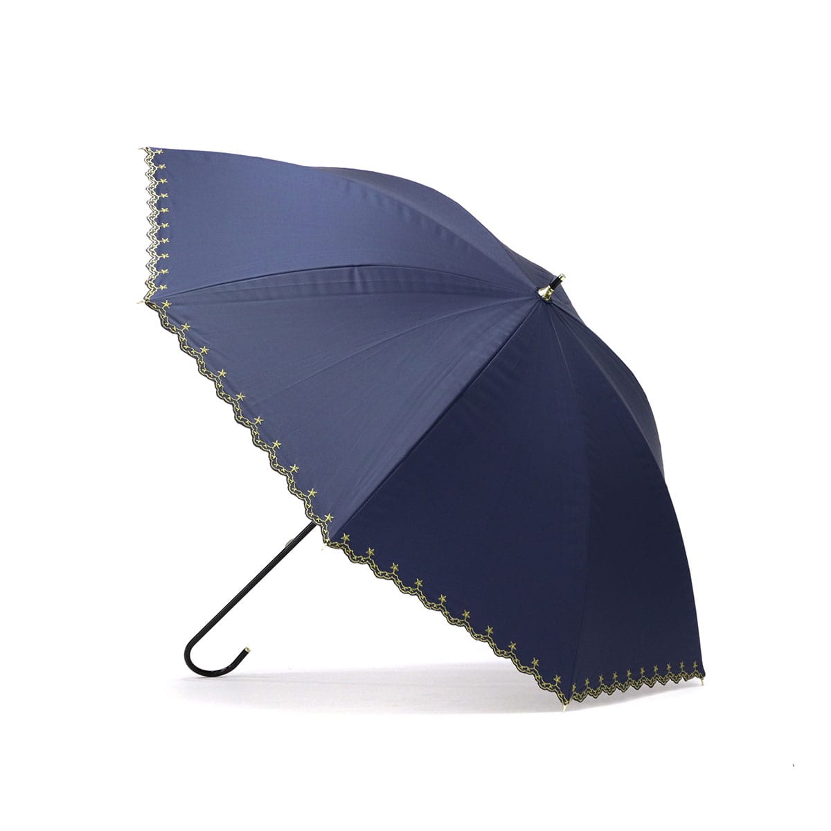 星柄とスカラップに星の刺繍をあしらった上品な日傘。スカラップがやわらかい印象を与え、さりげない星がワンポイントになっています。高級感のある刺繍が華やかさを演出。シンプルで使いやすいデザインながらも機能性面でも安心のアイテムです。