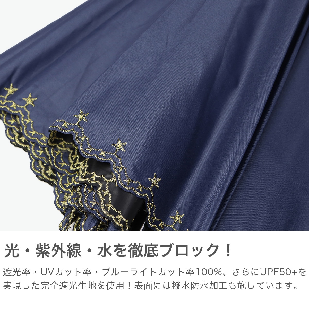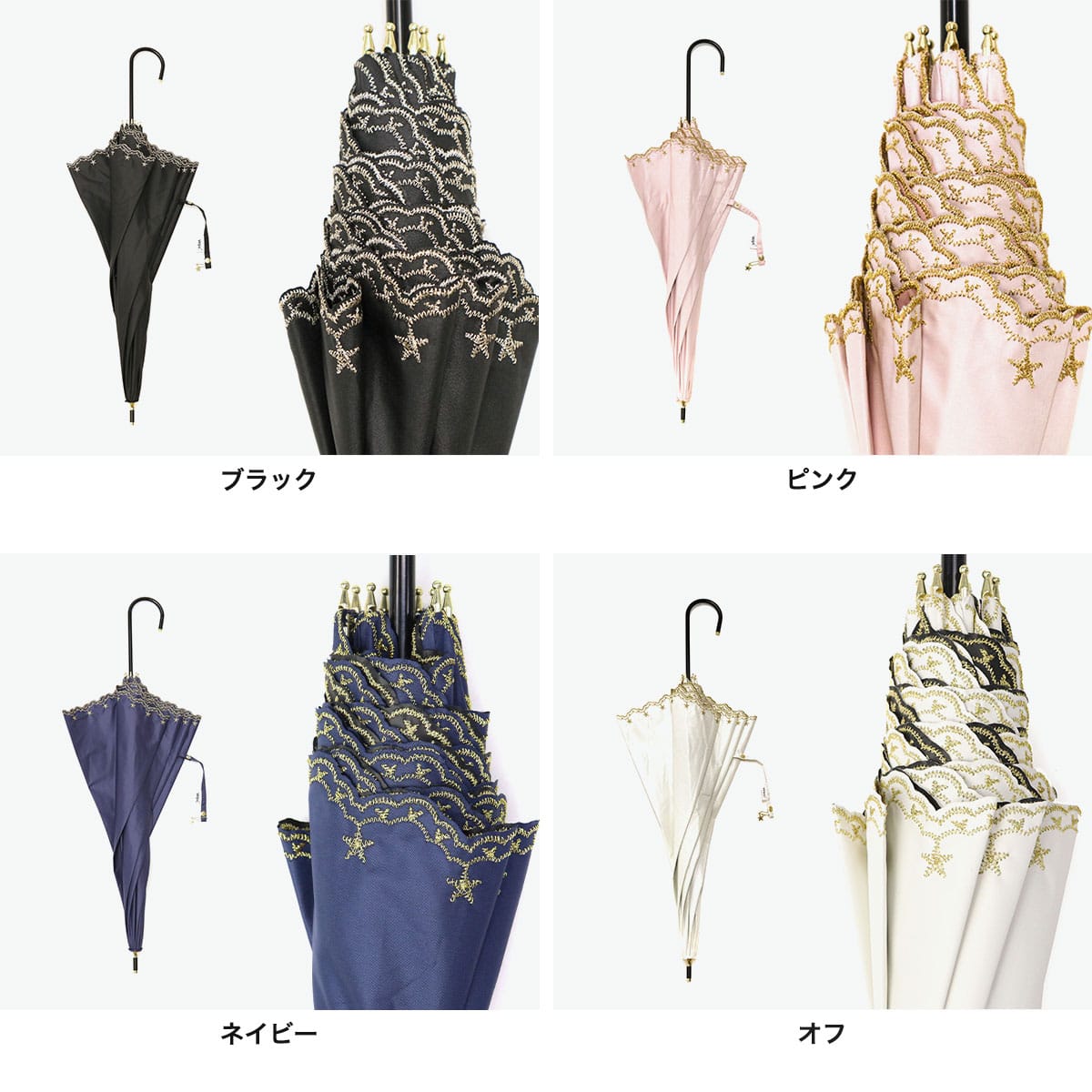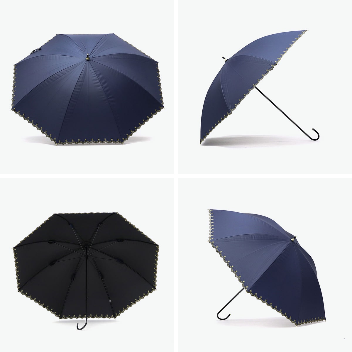 星柄とスカラップに星の刺繍をあしらった上品な日傘。スカラップがやわらかい印象を与え、さりげない星がワンポイントになっています。高級感のある刺繍が華やかさを演出。シンプルで使いやすいデザインながらも機能性面でも安心のアイテムです。