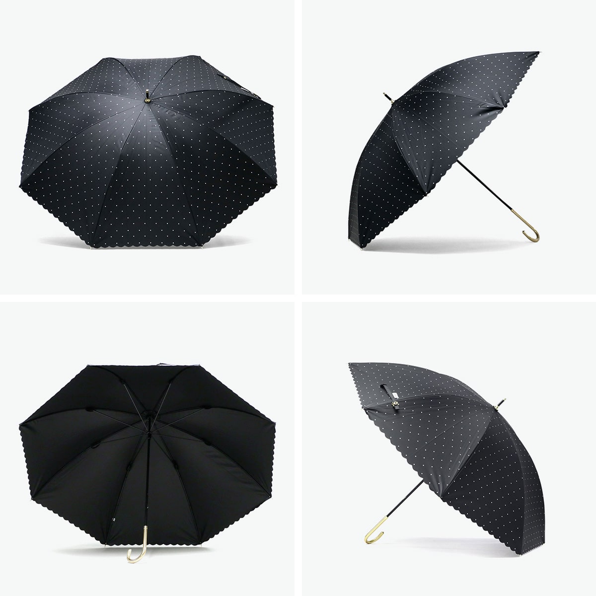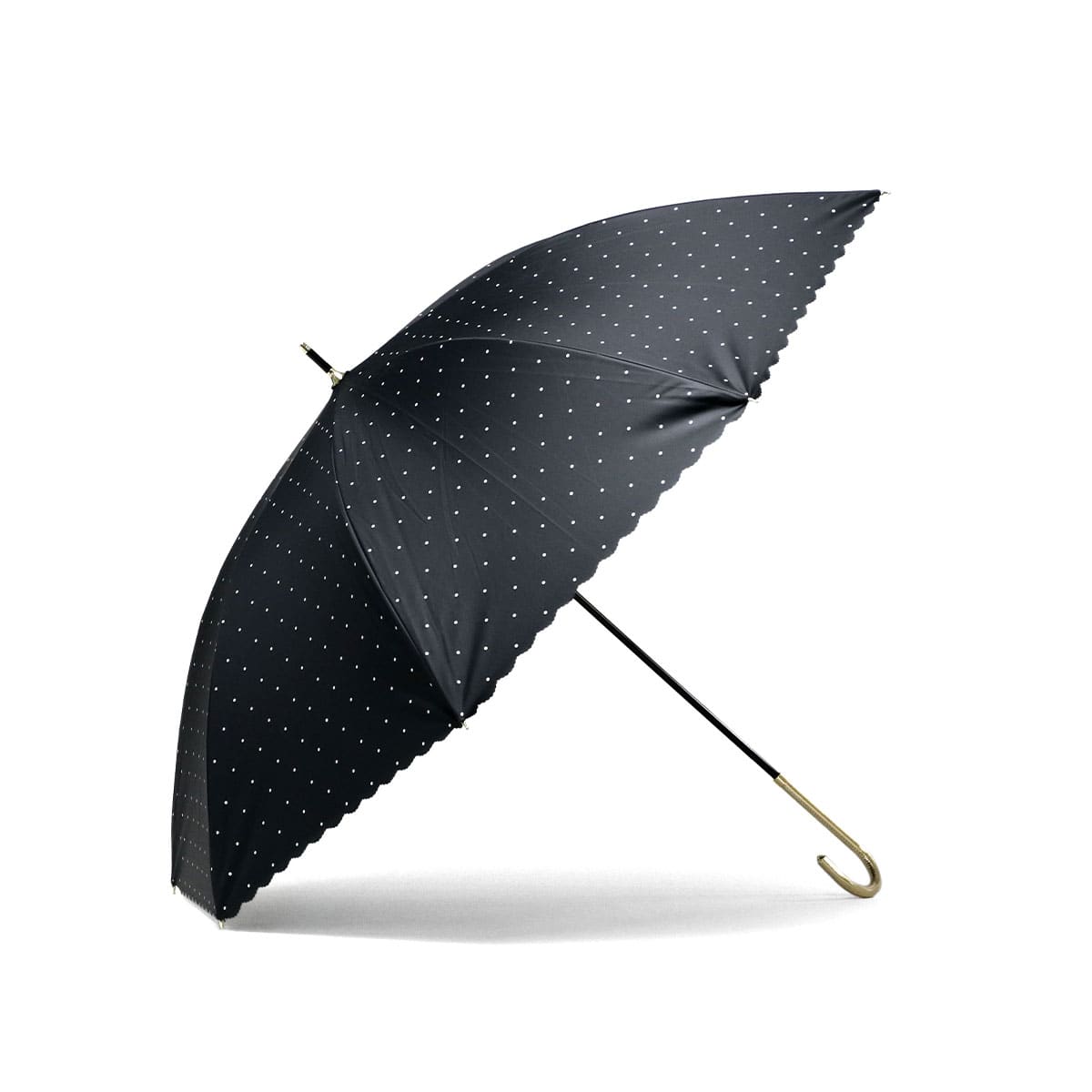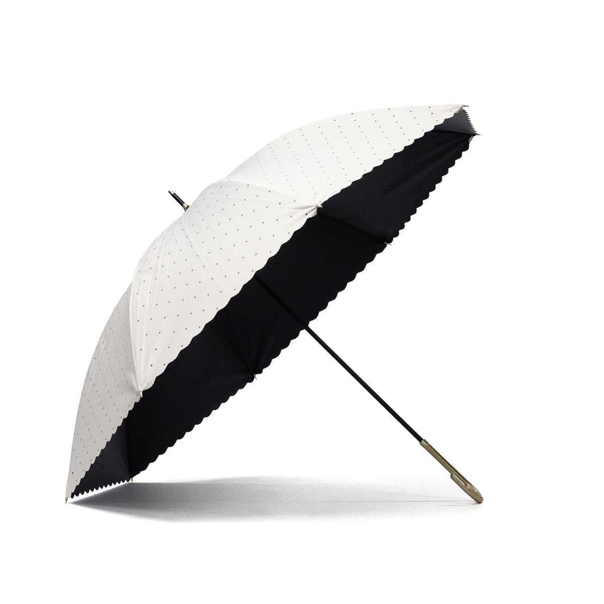 全カラー遮光率・UVカット率100%で、紫外線・熱中症対策が万全にできる晴雨兼用の長傘。カバー力をしっかりと感じられる大きめのサイズ感で、遮熱性にも優れ暑い夏を涼しく過ごすために必要不可欠です。シンプルなホワイトとブラックの2色をベースに、ドット柄とフチのカットがガーリーでかわいらしい仕上がりです。