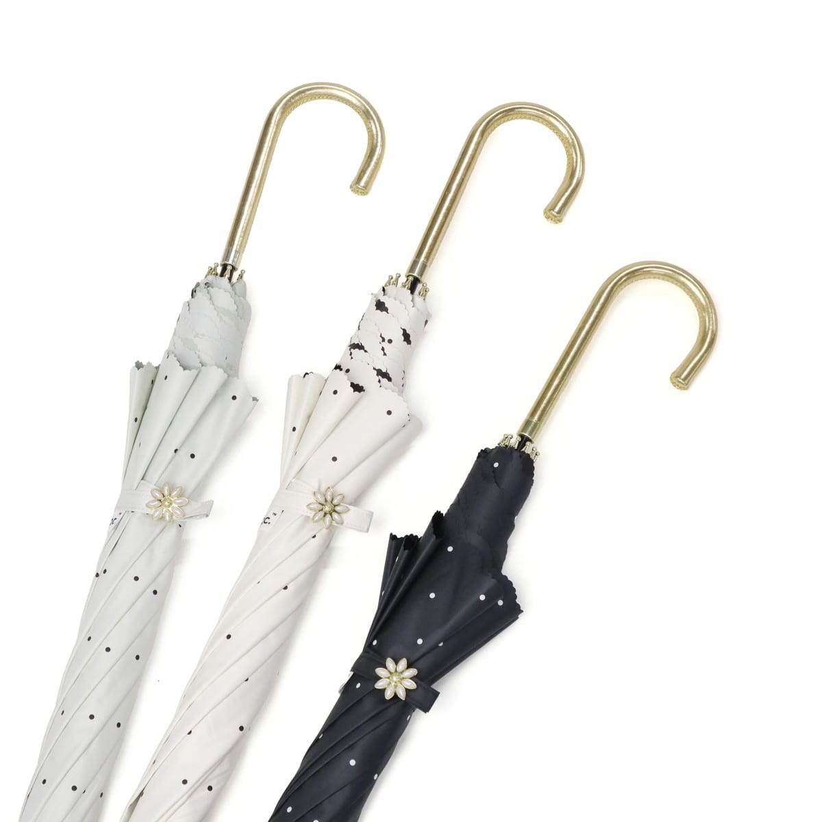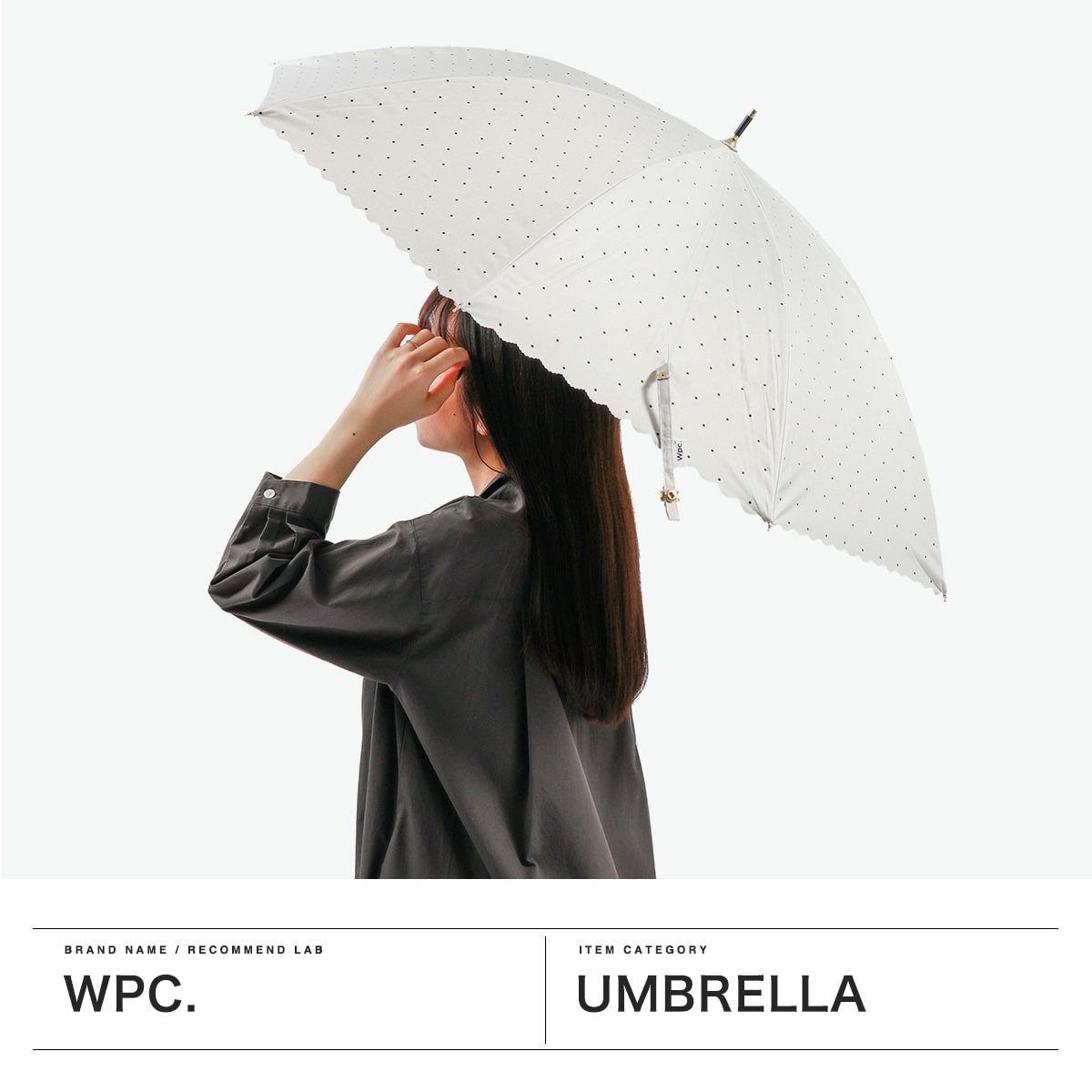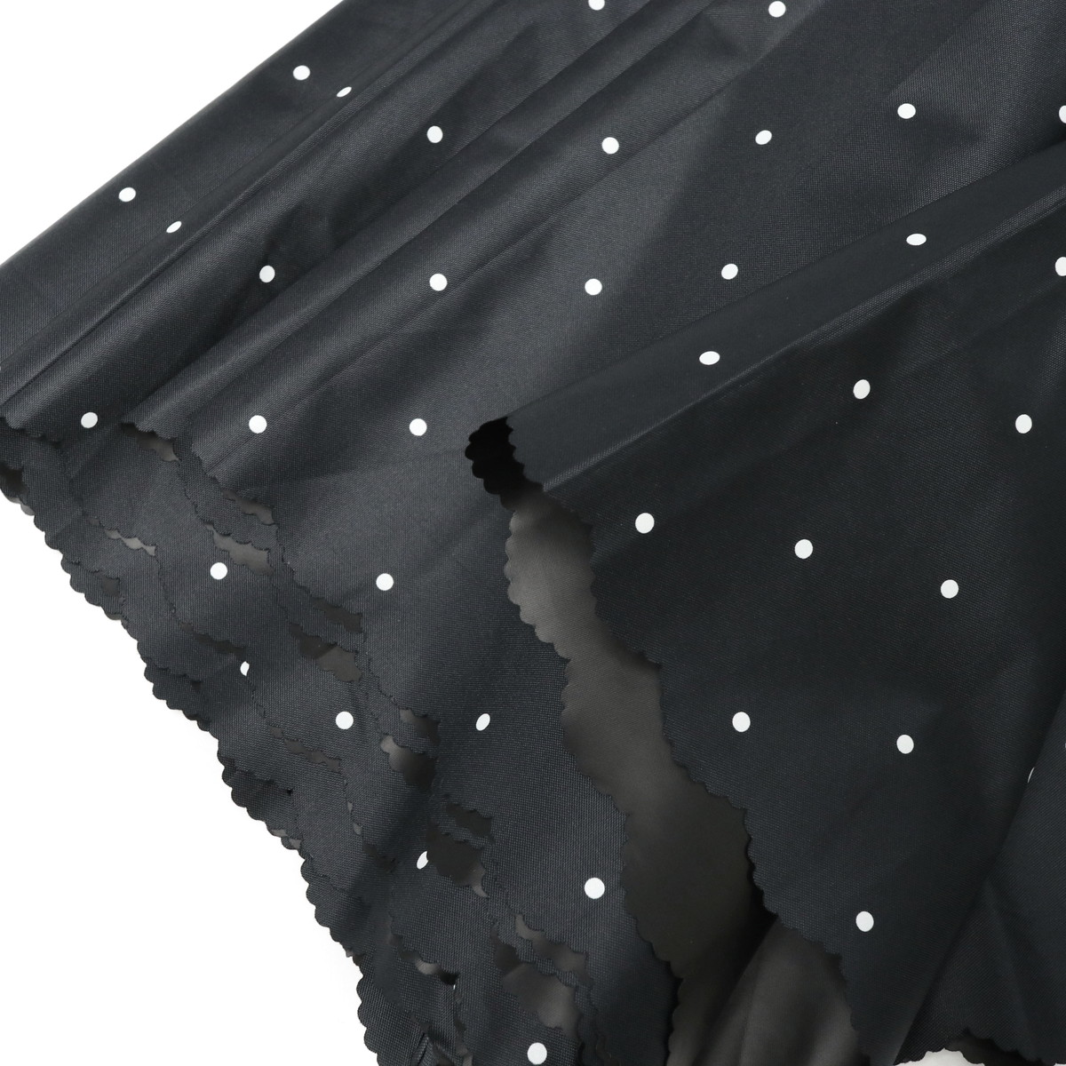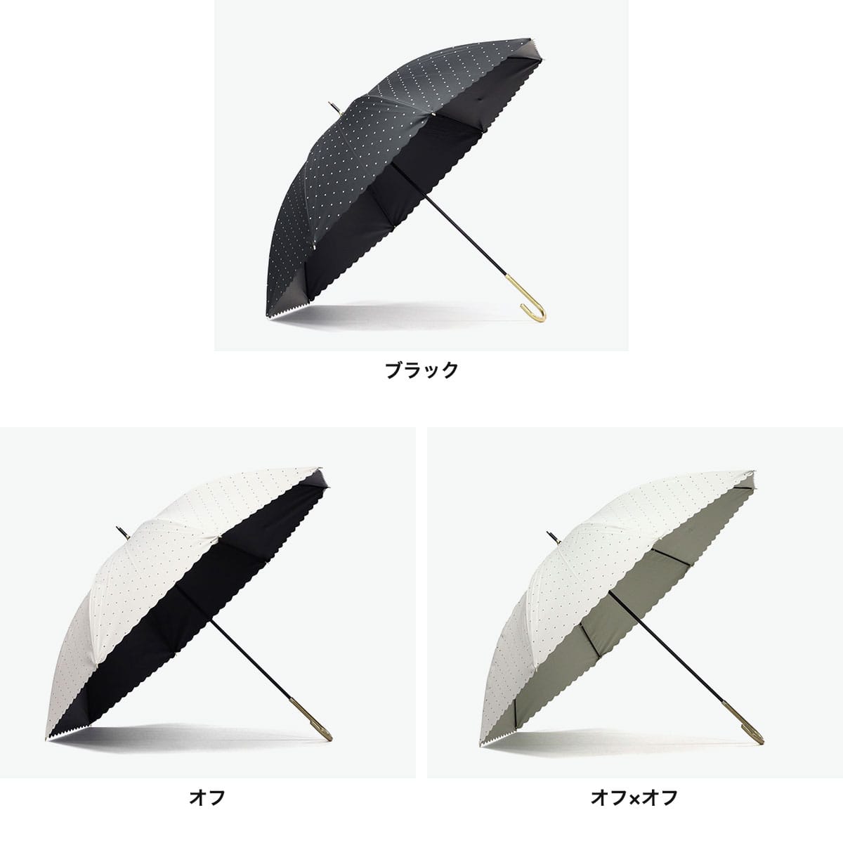 全カラー遮光率・UVカット率100%で、紫外線・熱中症対策が万全にできる晴雨兼用の長傘。カバー力をしっかりと感じられる大きめのサイズ感で、遮熱性にも優れ暑い夏を涼しく過ごすために必要不可欠です。シンプルなホワイトとブラックの2色をベースに、ドット柄とフチのカットがガーリーでかわいらしい仕上がりです。