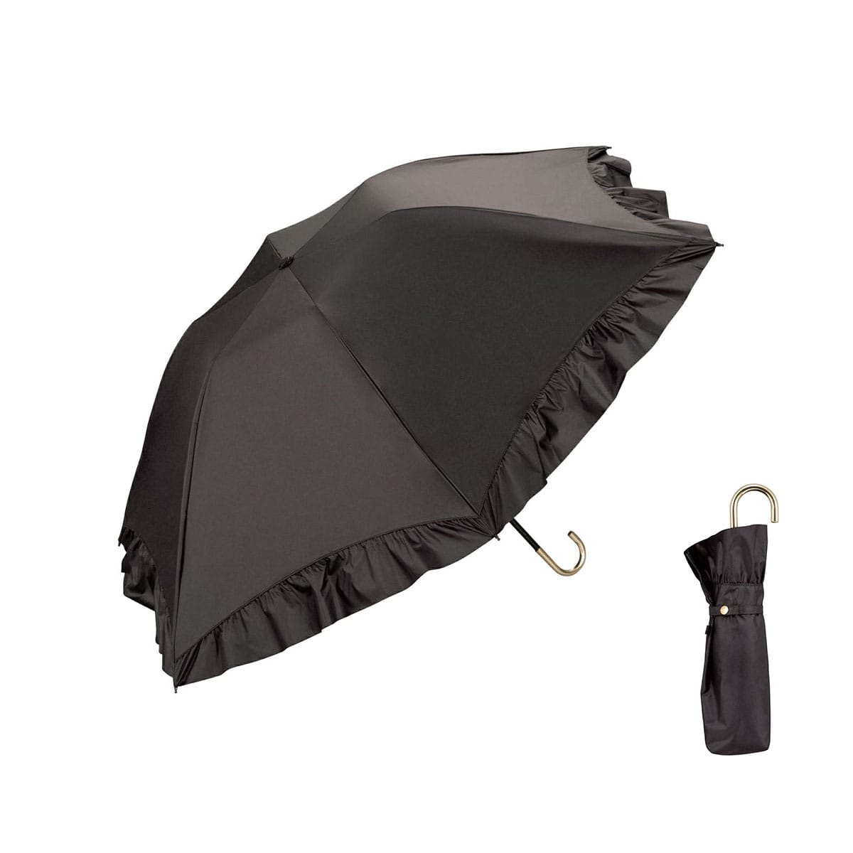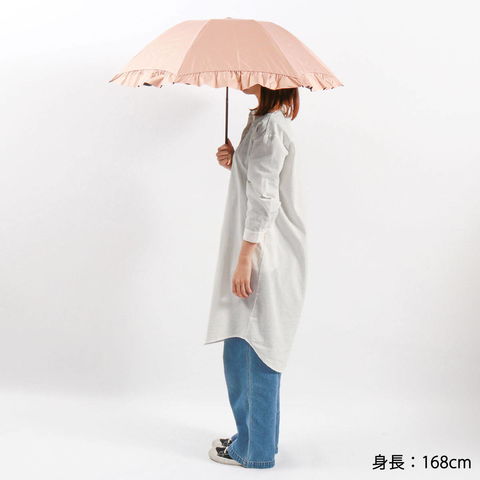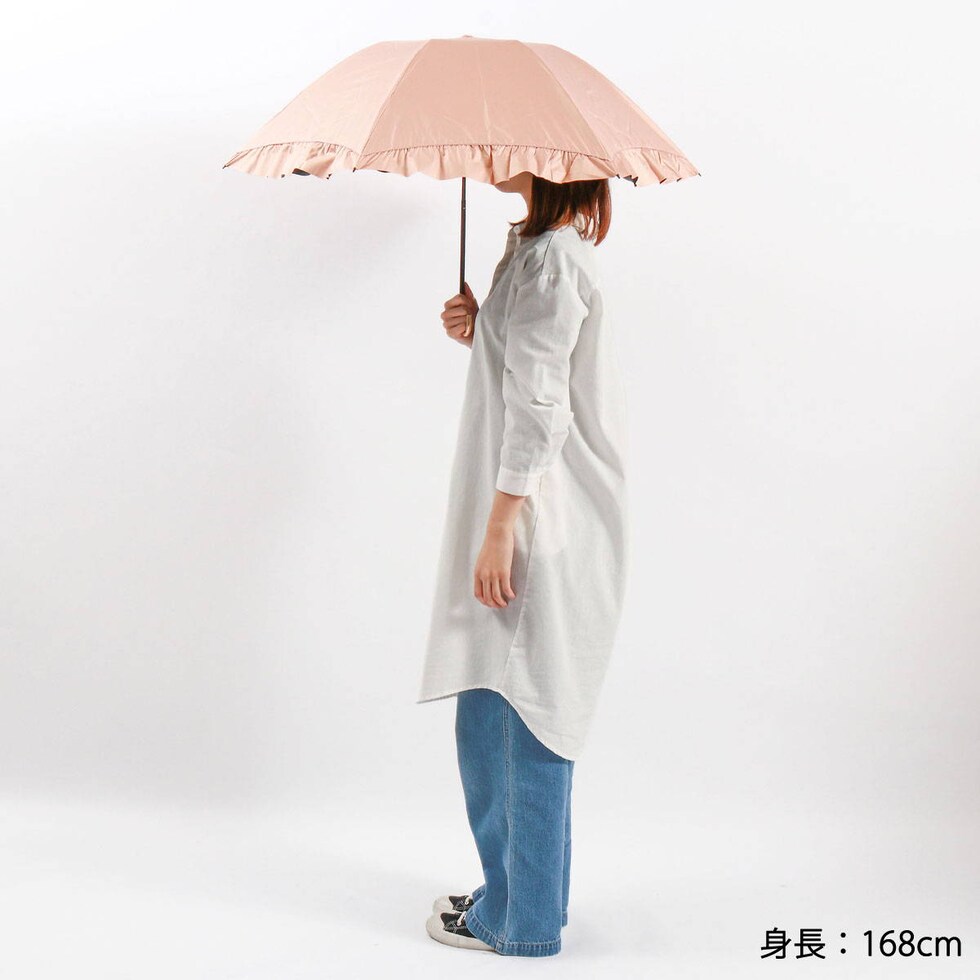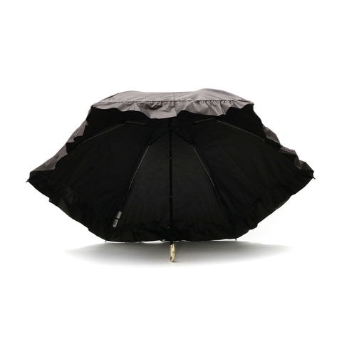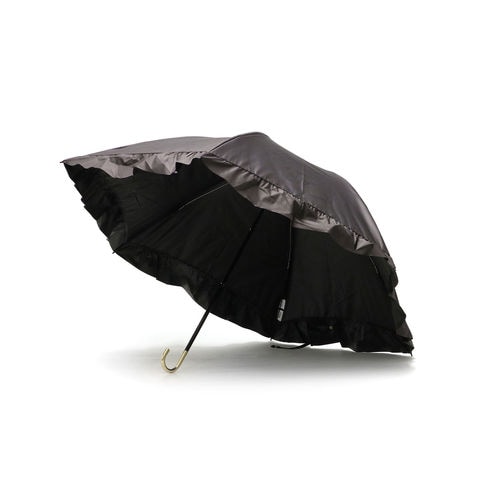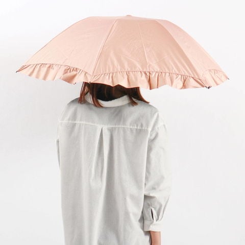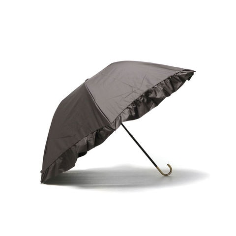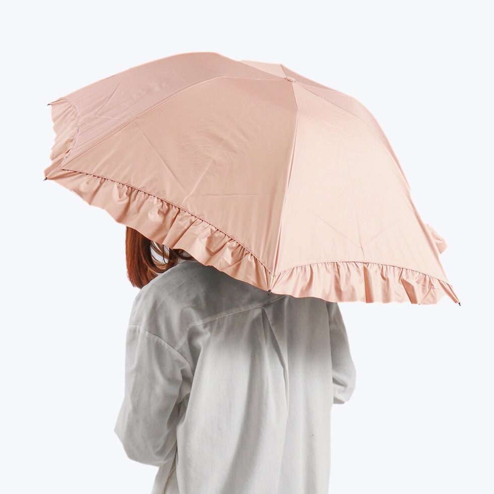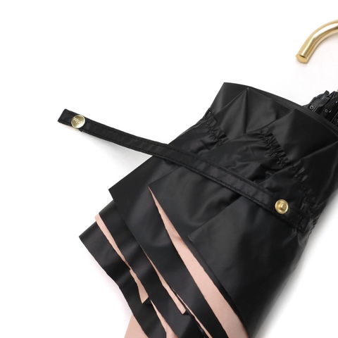 華やかなフリルを裾全体にあしらった、かわいらしい折りたたみ傘。軽くて錆びにくいアルミゴールド性の華奢なハンドルが、さらに高級感を演出します。通常の傘と比べて親骨が55cmと大きく、鳥かごのようなカーブが特徴的。まるで包み込まれているような安心感があります。