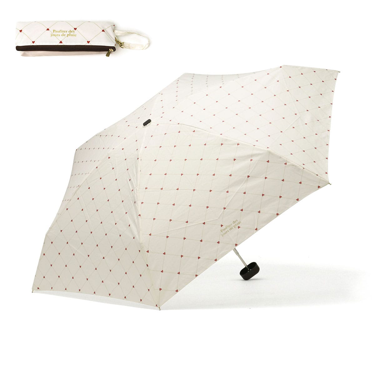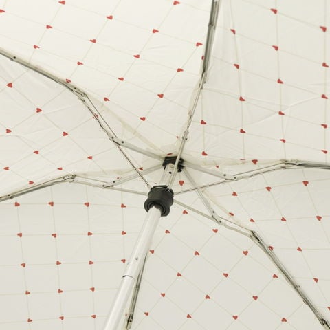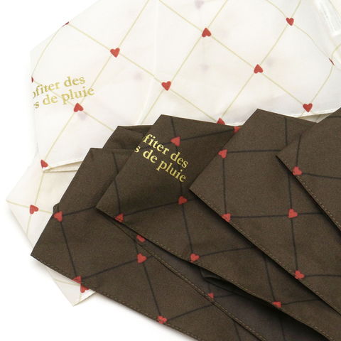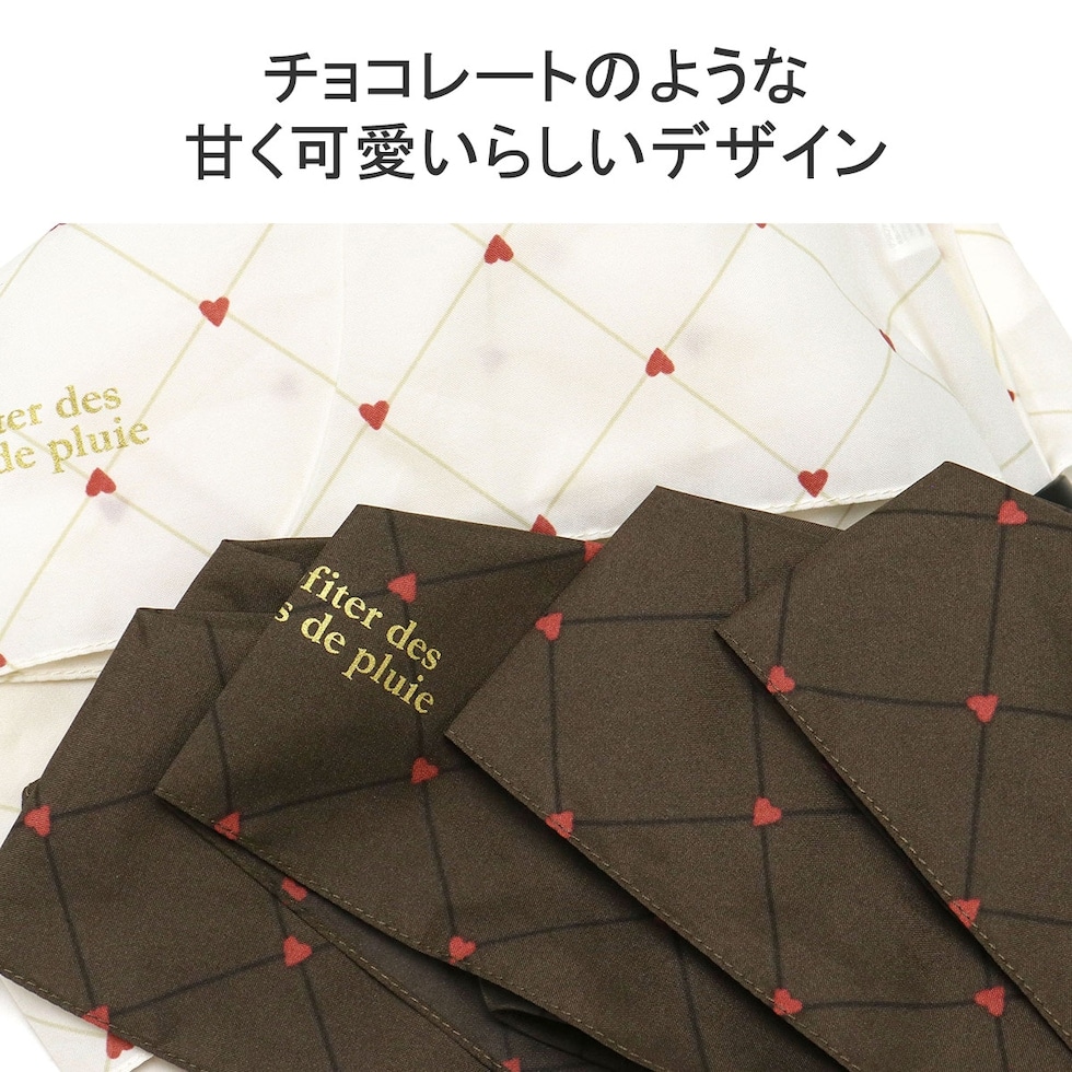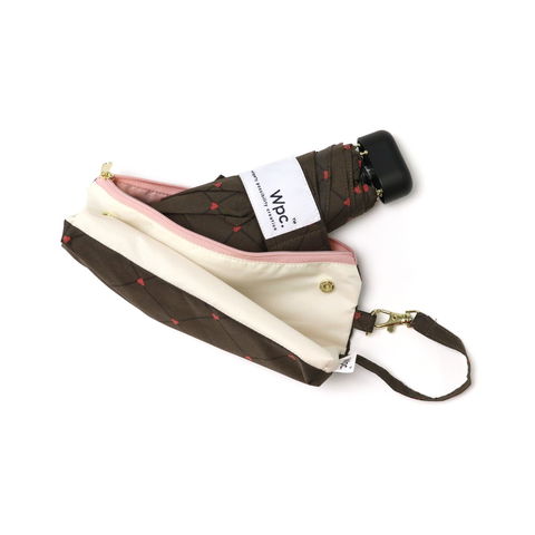 チョコレートをイメージしたハート柄の折り畳み傘。クロスラインのカラーやクラッチバッグ風の収納ケースなど、デザインにこだわった1本です。シルクプリントされた「雨の日を楽しむ」といった意味合いを持つロゴの通り、憂鬱に感じがちな雨の日も気分が上がる可愛らしいアイテムに仕上がっています。スクエア式に折り畳みが可能なフラットタイプの骨なので、コンパクトにして持ち運びが可能です。