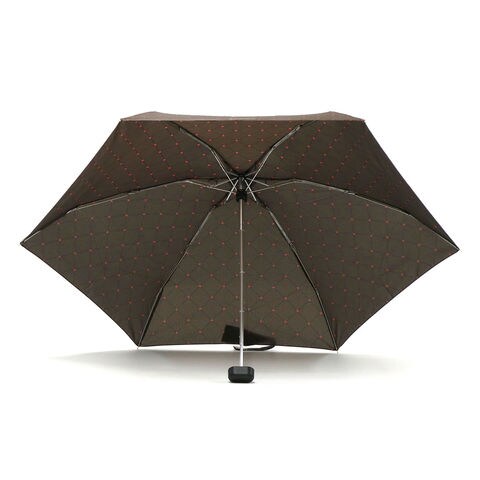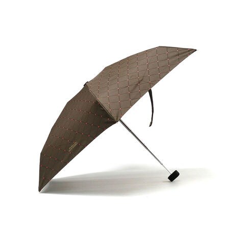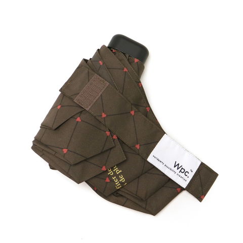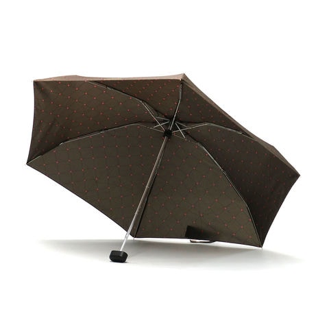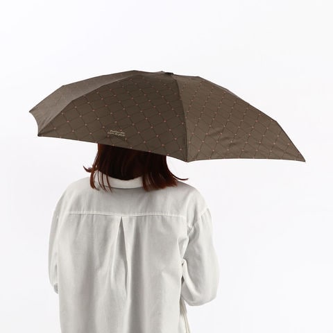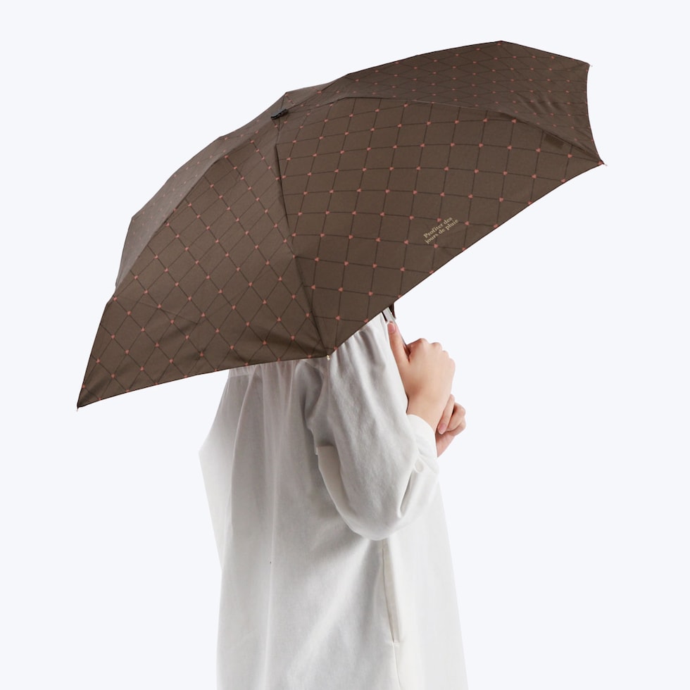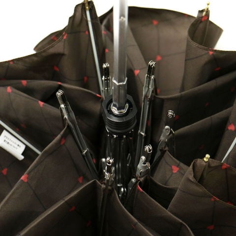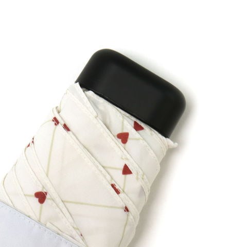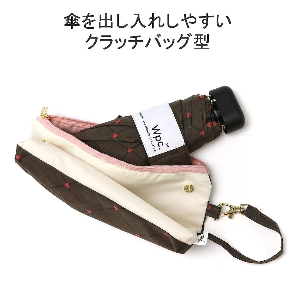 チョコレートをイメージしたハート柄の折り畳み傘。クロスラインのカラーやクラッチバッグ風の収納ケースなど、デザインにこだわった1本です。シルクプリントされた「雨の日を楽しむ」といった意味合いを持つロゴの通り、憂鬱に感じがちな雨の日も気分が上がる可愛らしいアイテムに仕上がっています。スクエア式に折り畳みが可能なフラットタイプの骨なので、コンパクトにして持ち運びが可能です。