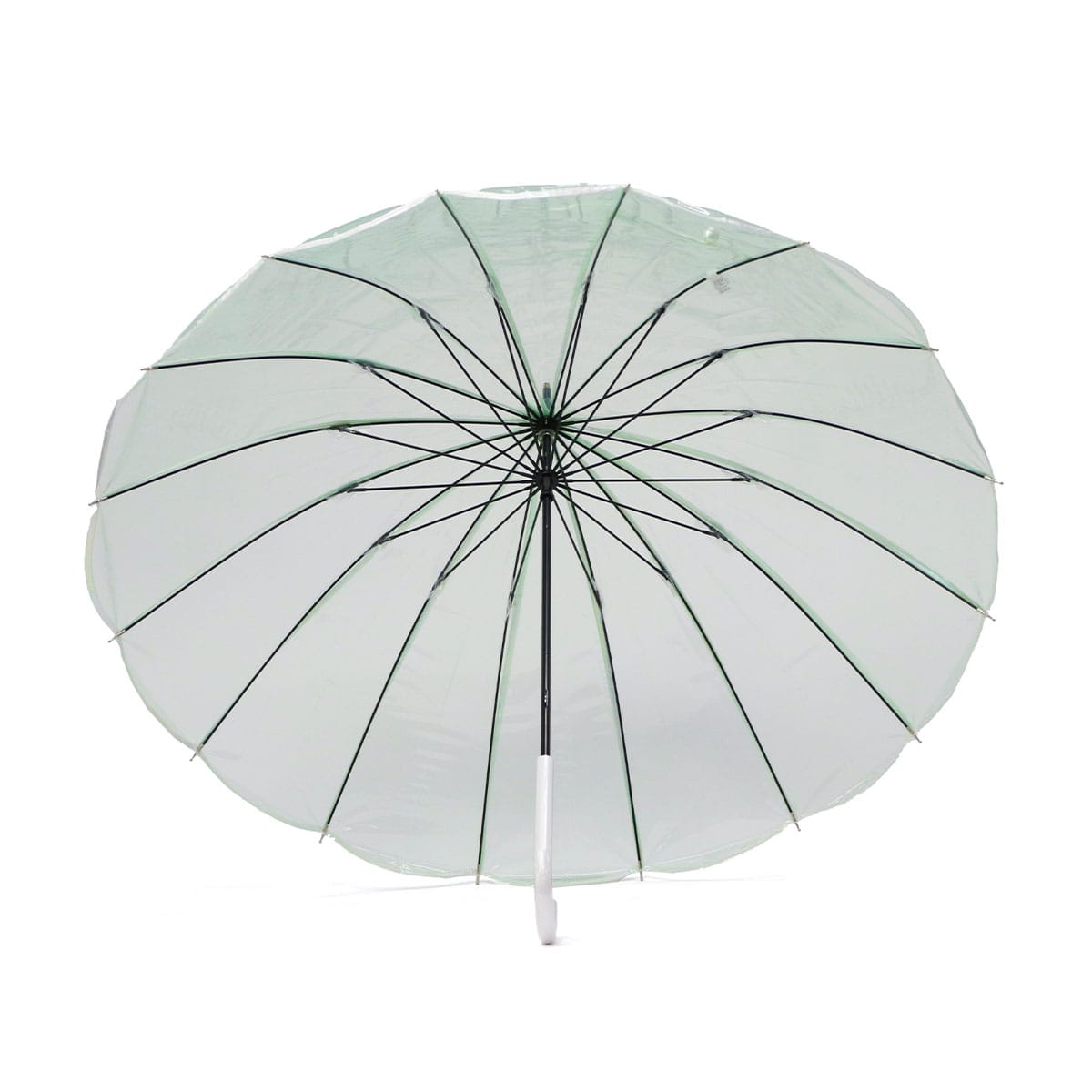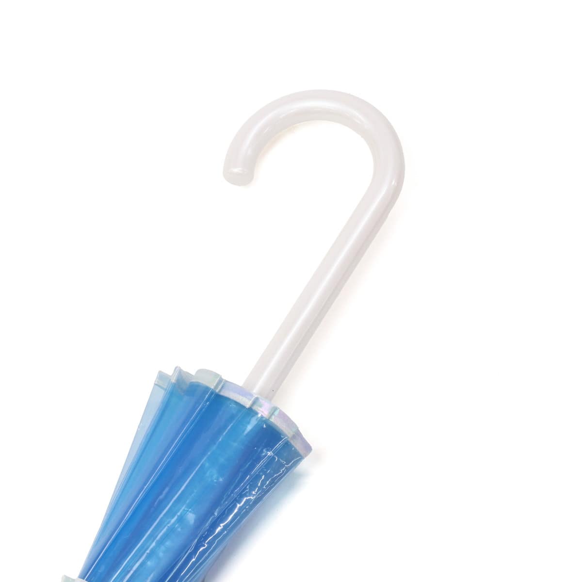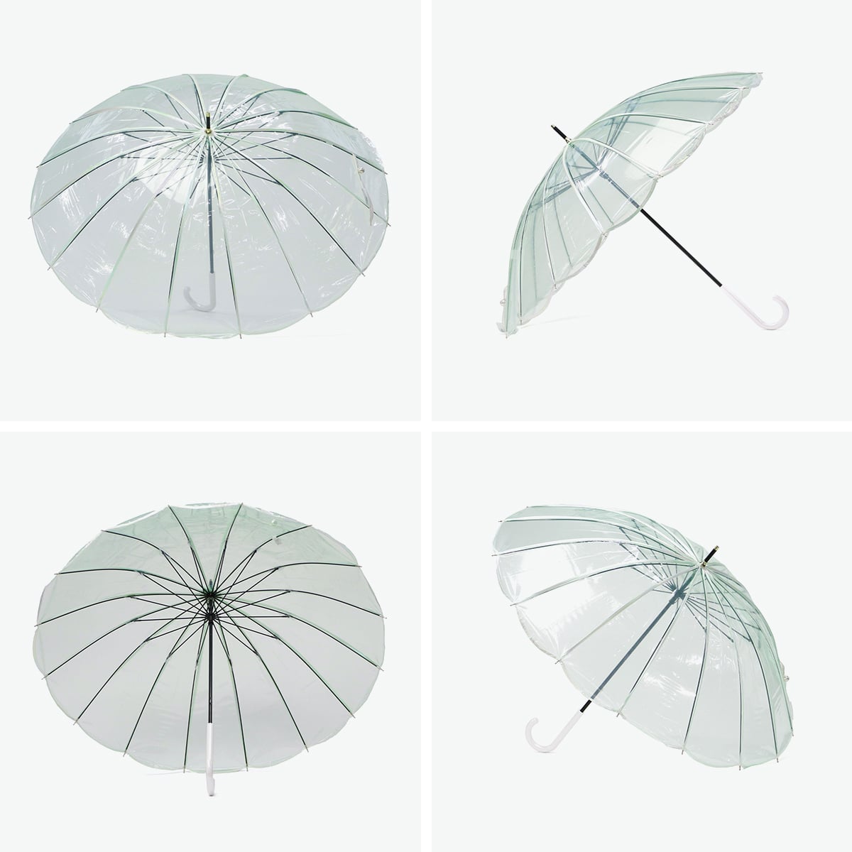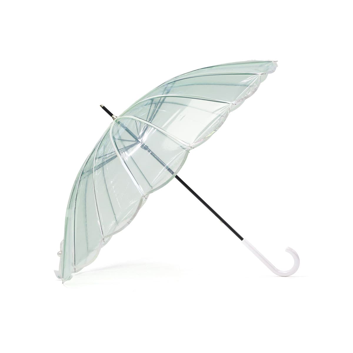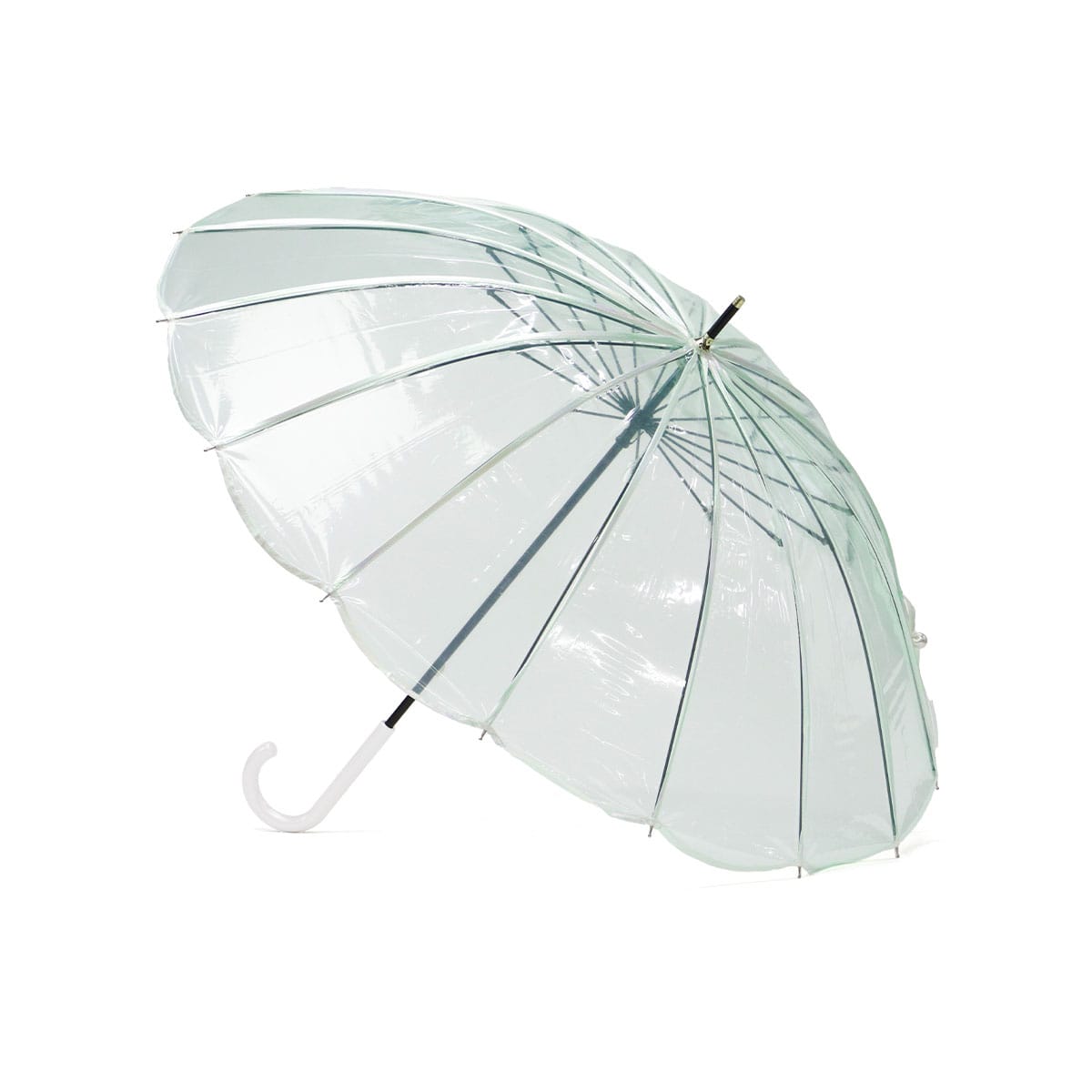 マーメイドが纏う貝殻をイメージとした美しい雨傘。水面の輝きを連想するキラキラとしたパイピング、パールのような輝きの手元とパールボタンが、幻想的な雰囲気を演出します。16本の多骨が、美しいフォルムと優れた耐風性を実現。長く愛用できる、使い捨てにしないビニール傘です。