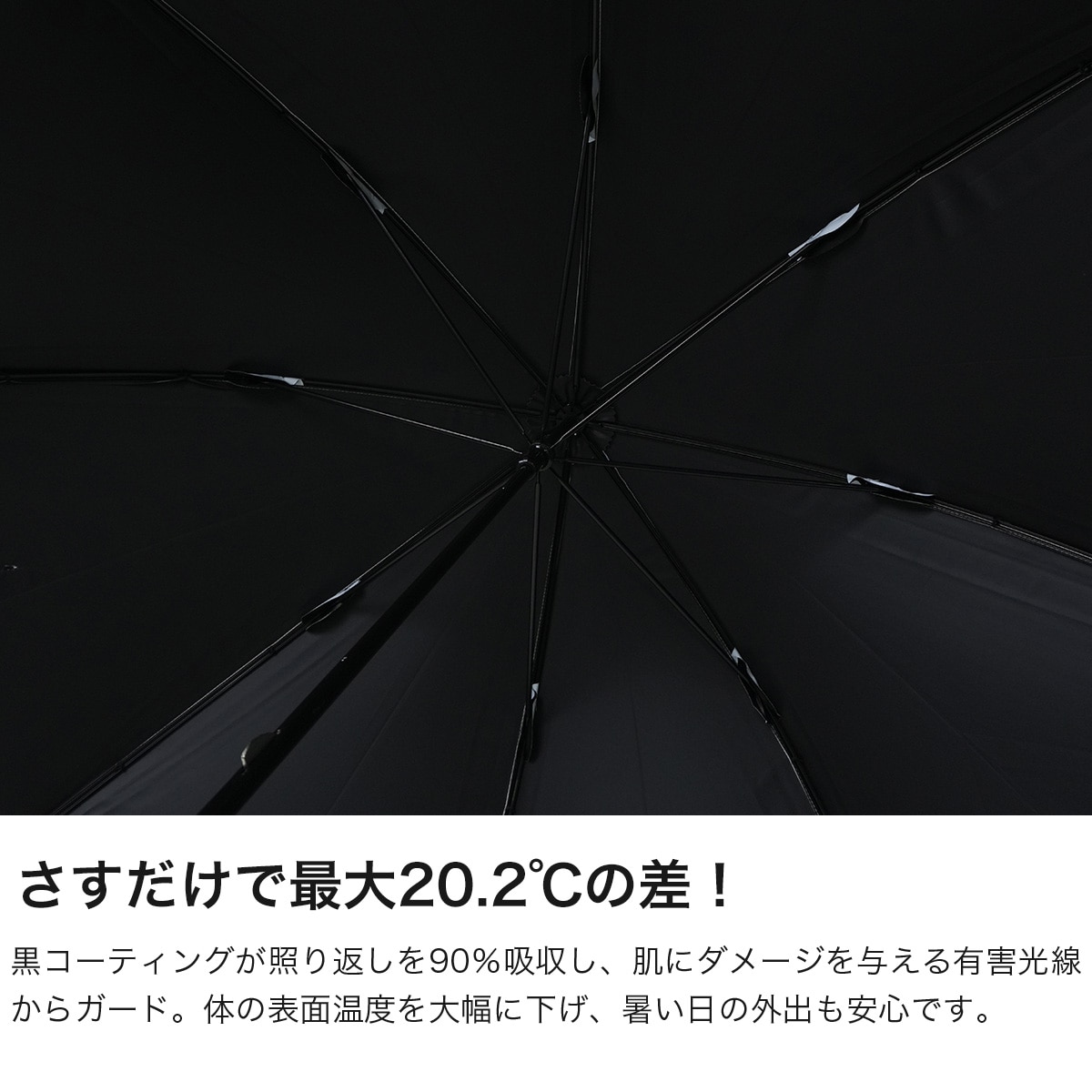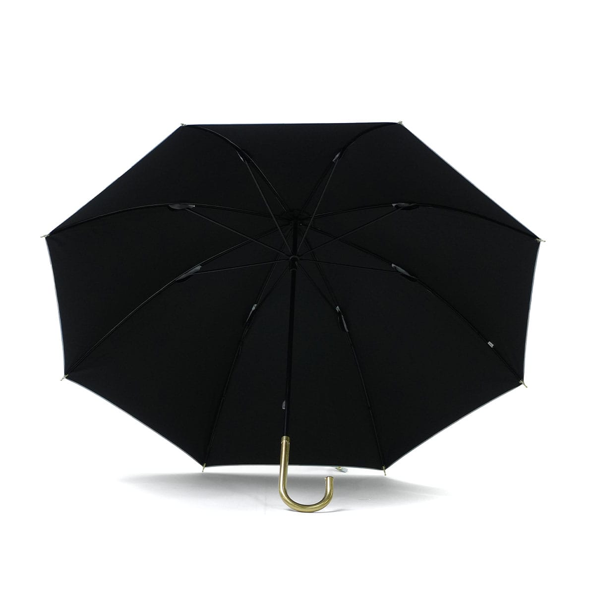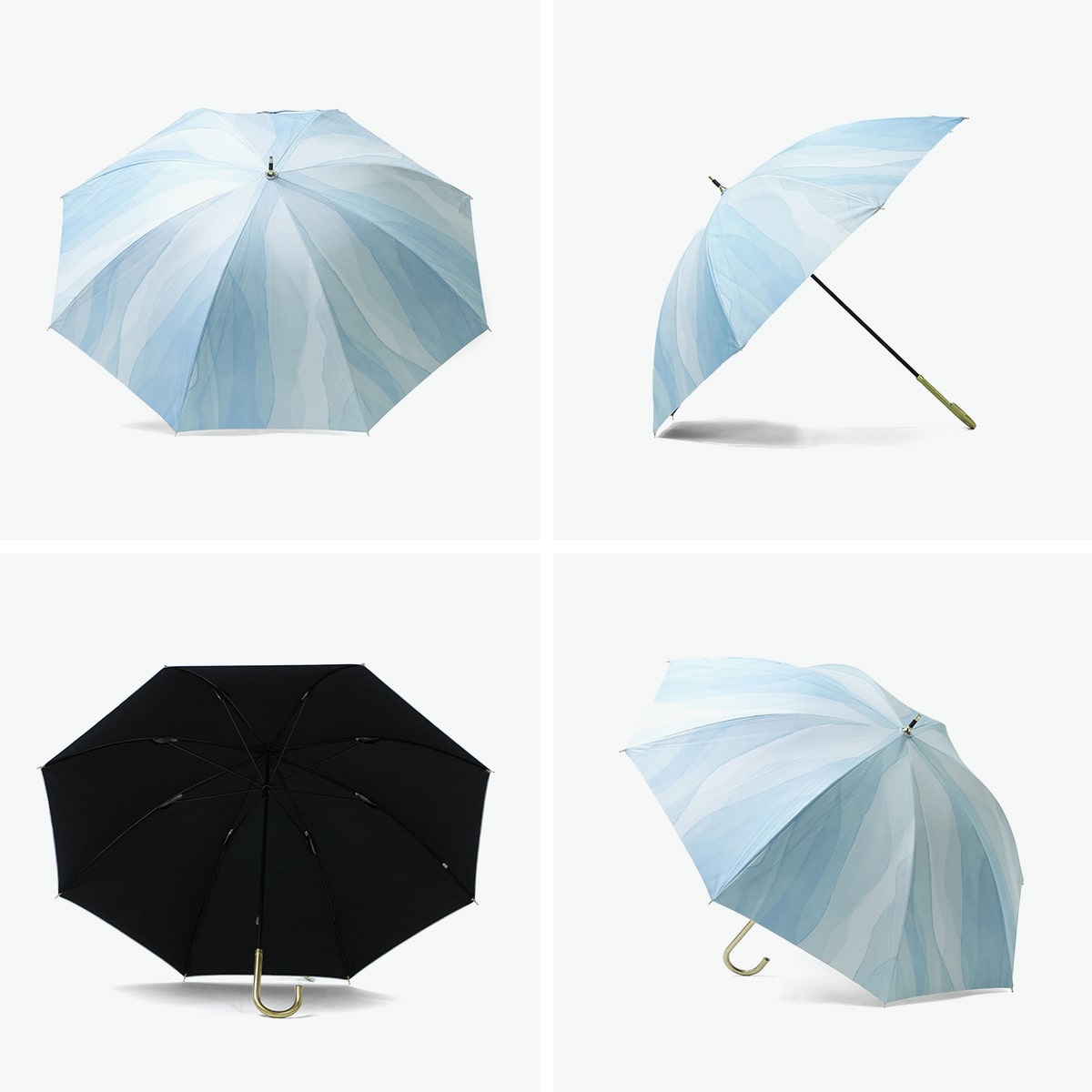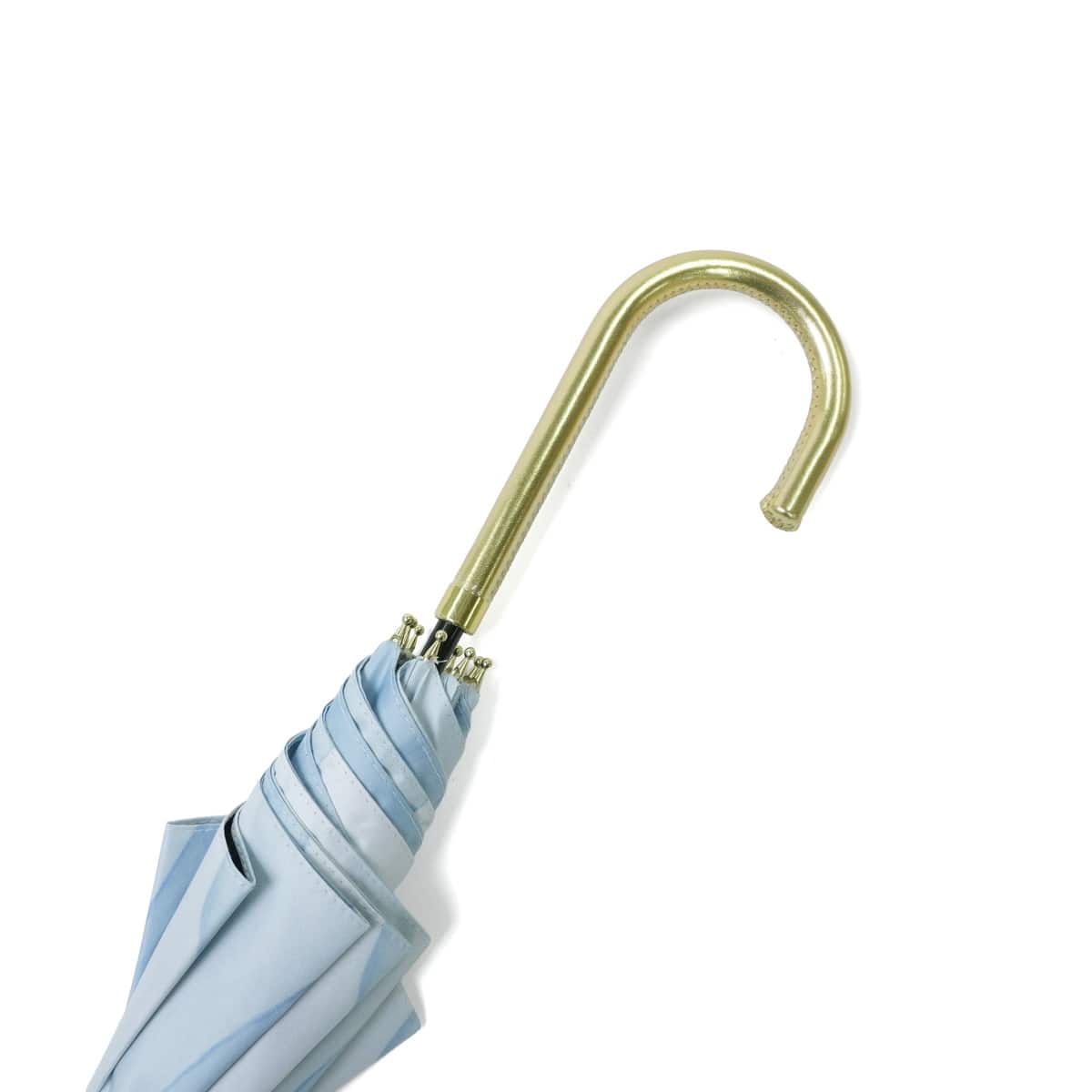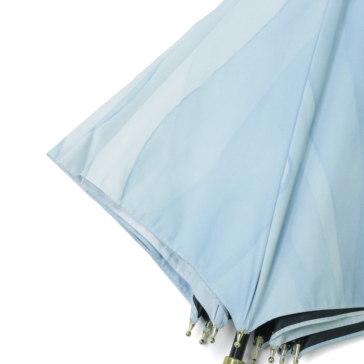 水彩絵の具で描いたような柄が魅力の日傘。はっ水防水加工を施しているため雨傘としても使用できます。傘内側の黒コーティングが照り返しを90%吸収し、傘の内側で起こる光の反射を大幅に減らして、肌にダメージを与える有害光線からガードします。水彩風の美しさを落ち着いた色合いで表現し、大人っぽい雰囲気に仕上げました。ゴールドのロゴシルクプリントと、ゴールド合皮手元が、上品な輝きを添える品格ある1本です。