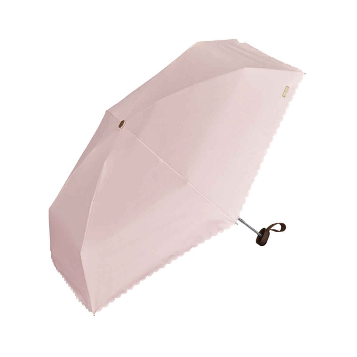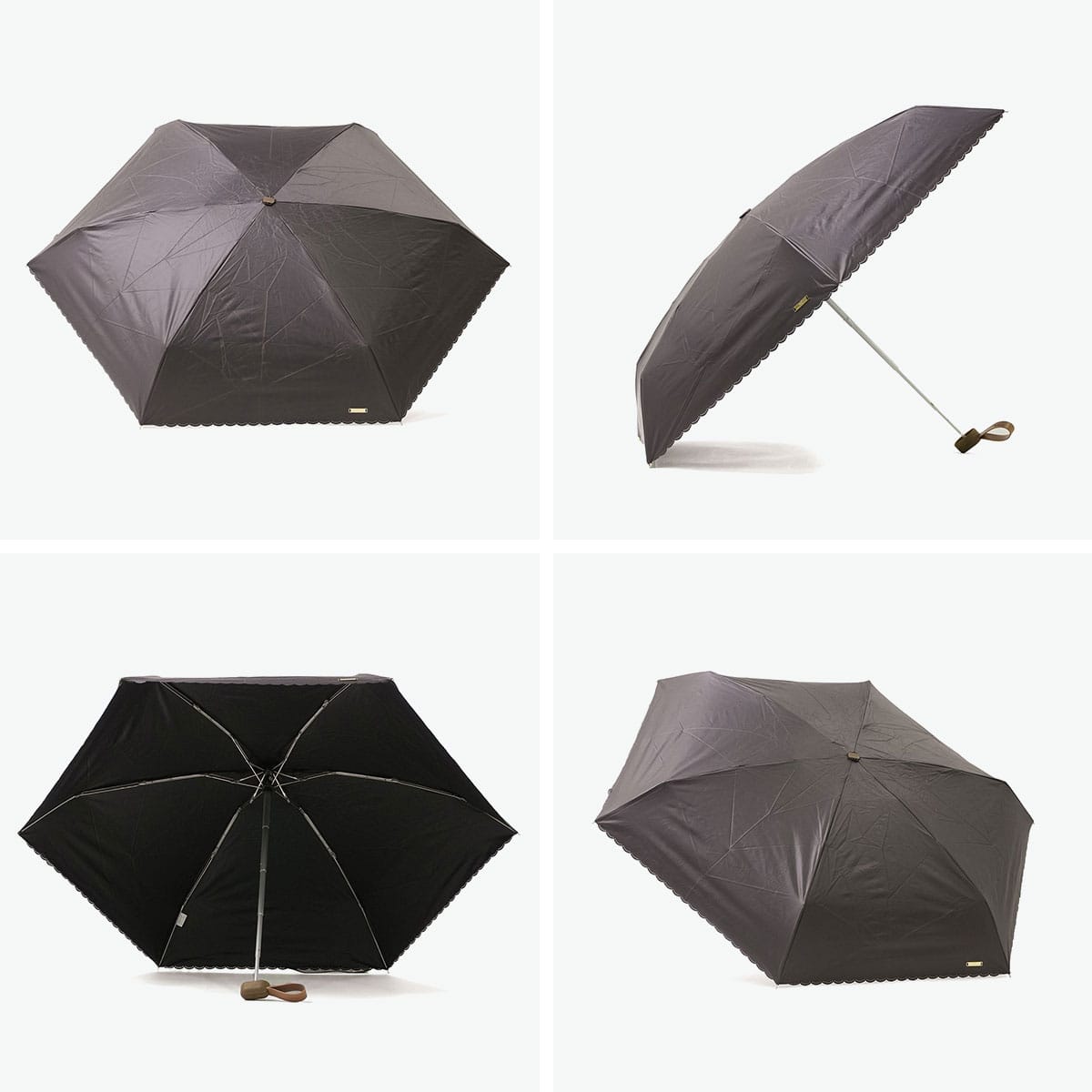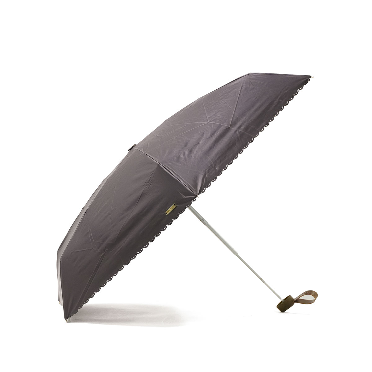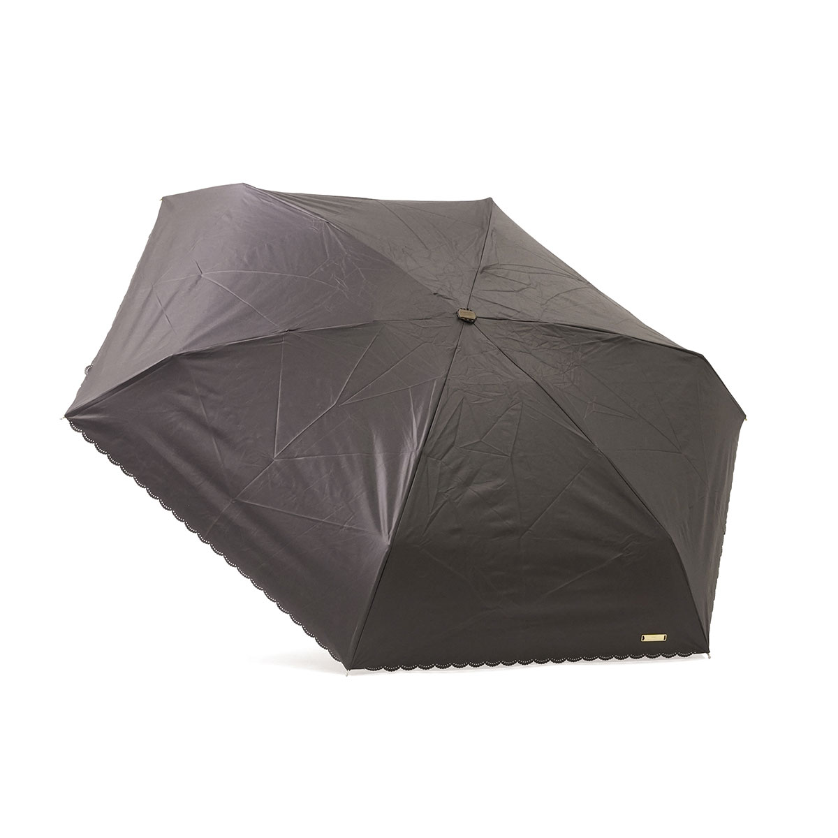 シンプルなカラーに縁のカッティングが映える、晴雨兼用の折りたたみ日傘。ビジューボタンやゴールドプレートが上品なアクセントを添えます。遮光率・UVカット率100%、UPF50+で紫外線対策も万全。5段骨のコンパクト設計で持ち運びやすく、バッグにすっきり収まるスクエア型。通勤やお出かけに活躍します。