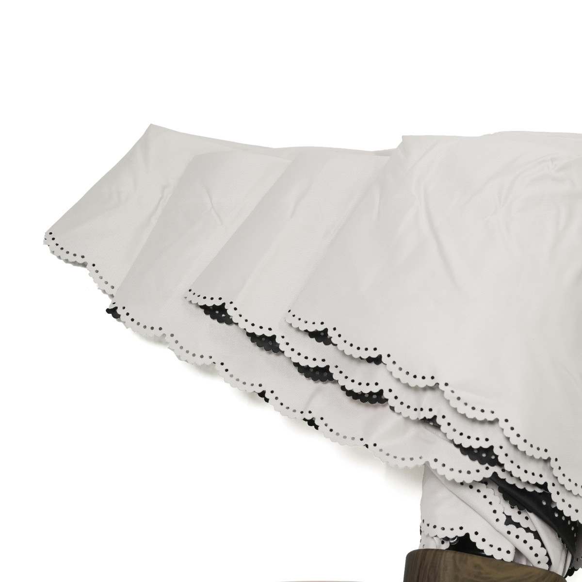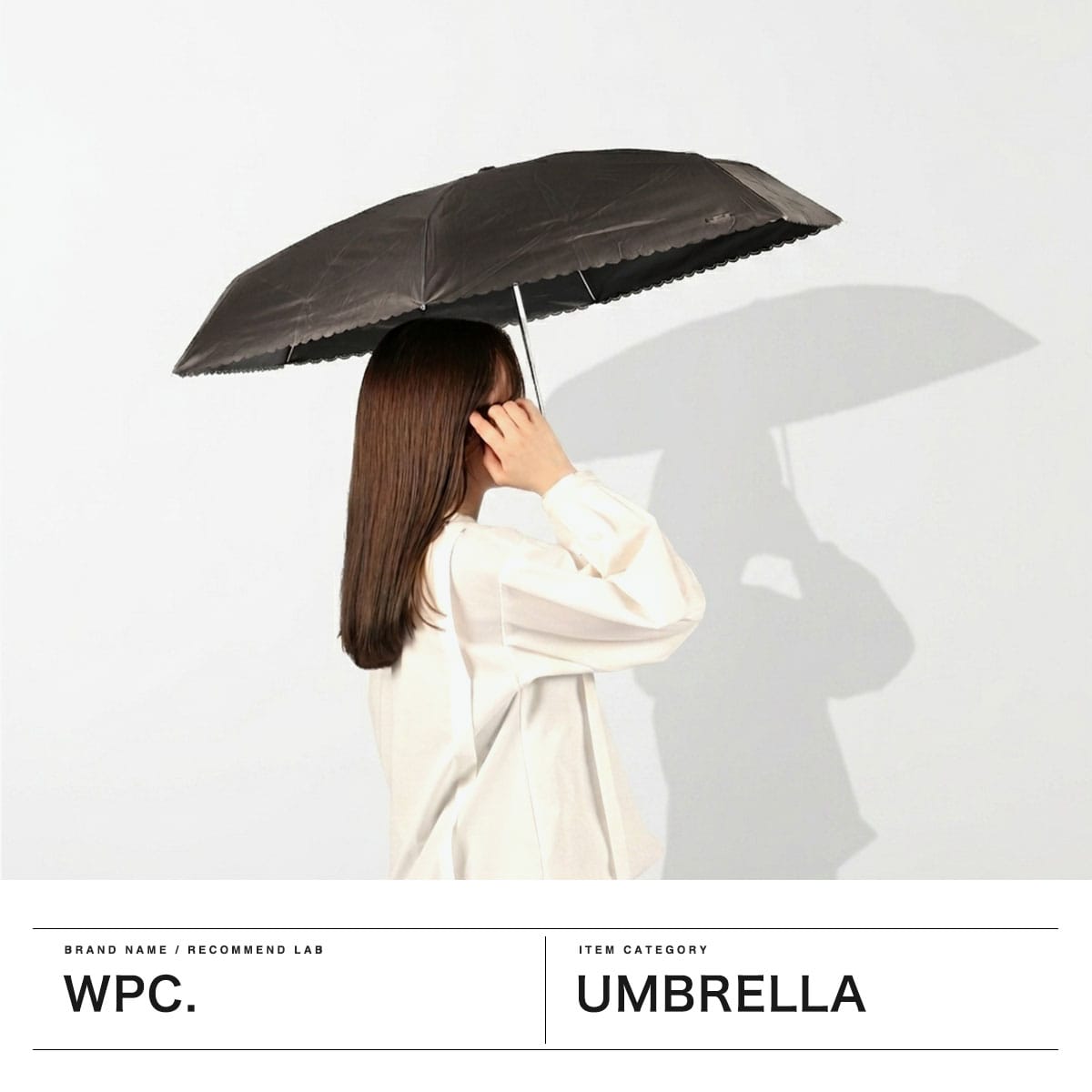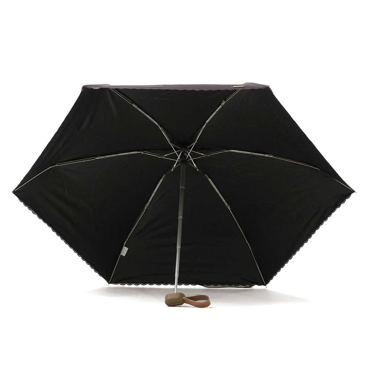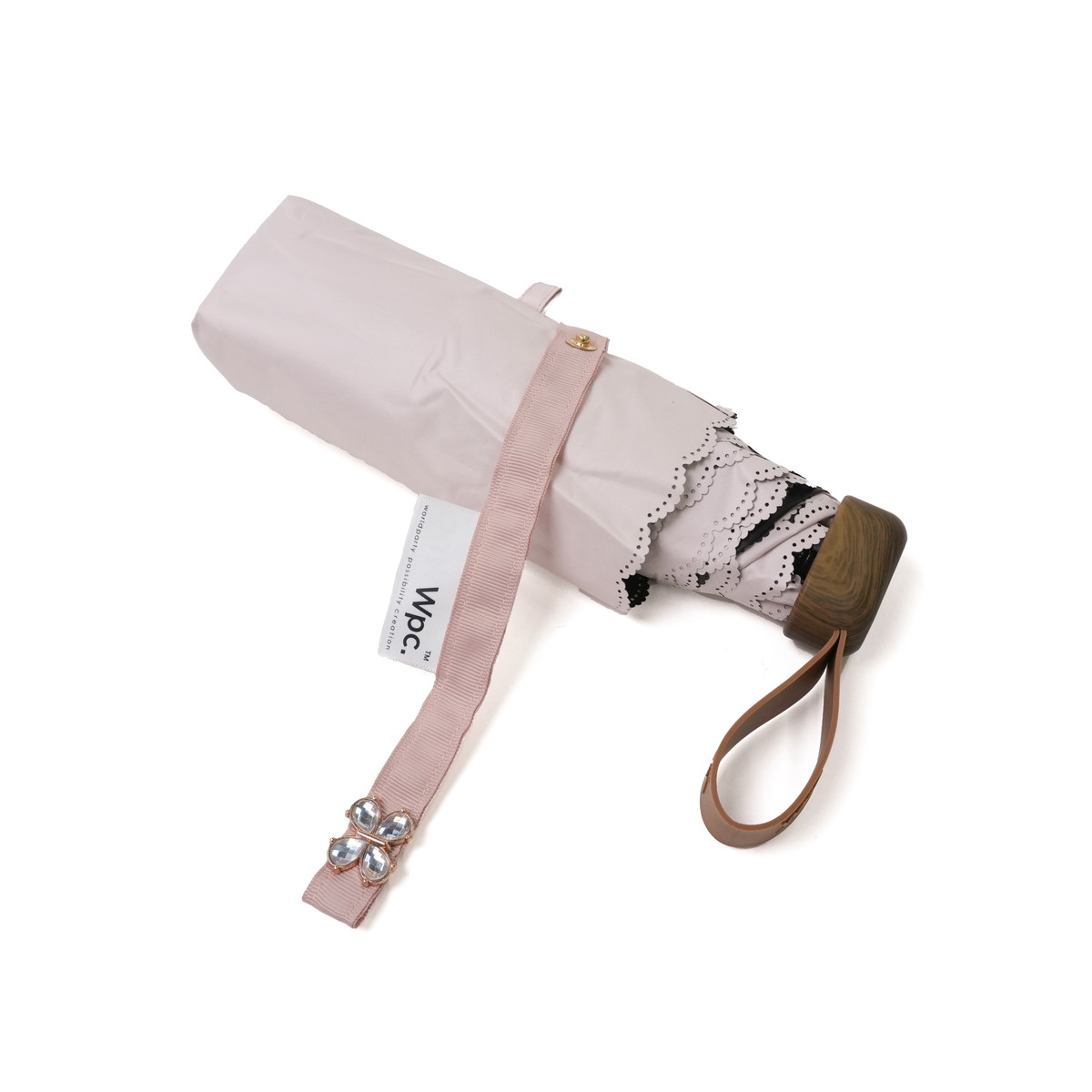 シンプルなカラーに縁のカッティングが映える、晴雨兼用の折りたたみ日傘。ビジューボタンやゴールドプレートが上品なアクセントを添えます。遮光率・UVカット率100%、UPF50+で紫外線対策も万全。5段骨のコンパクト設計で持ち運びやすく、バッグにすっきり収まるスクエア型。通勤やお出かけに活躍します。