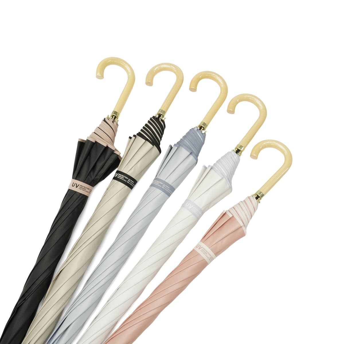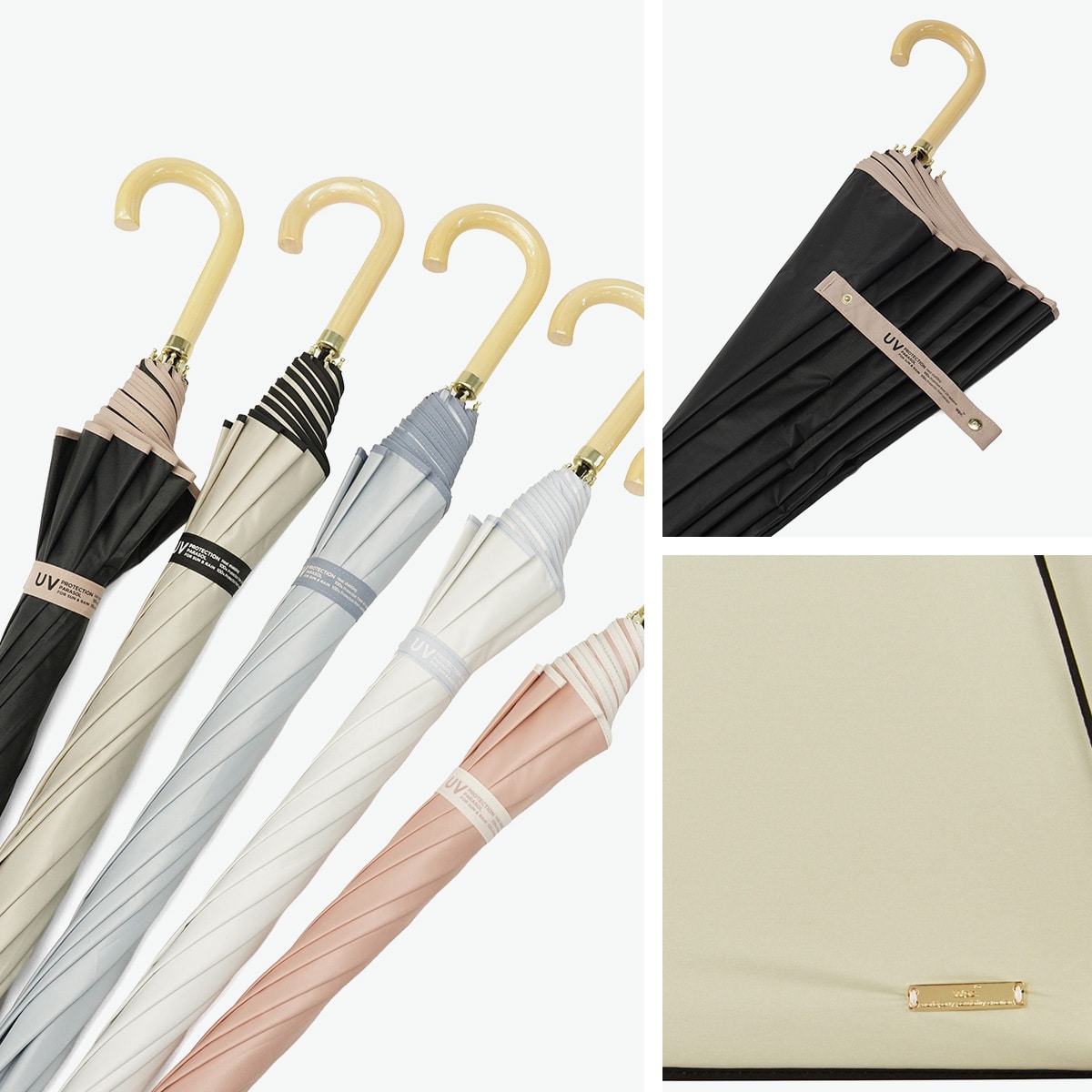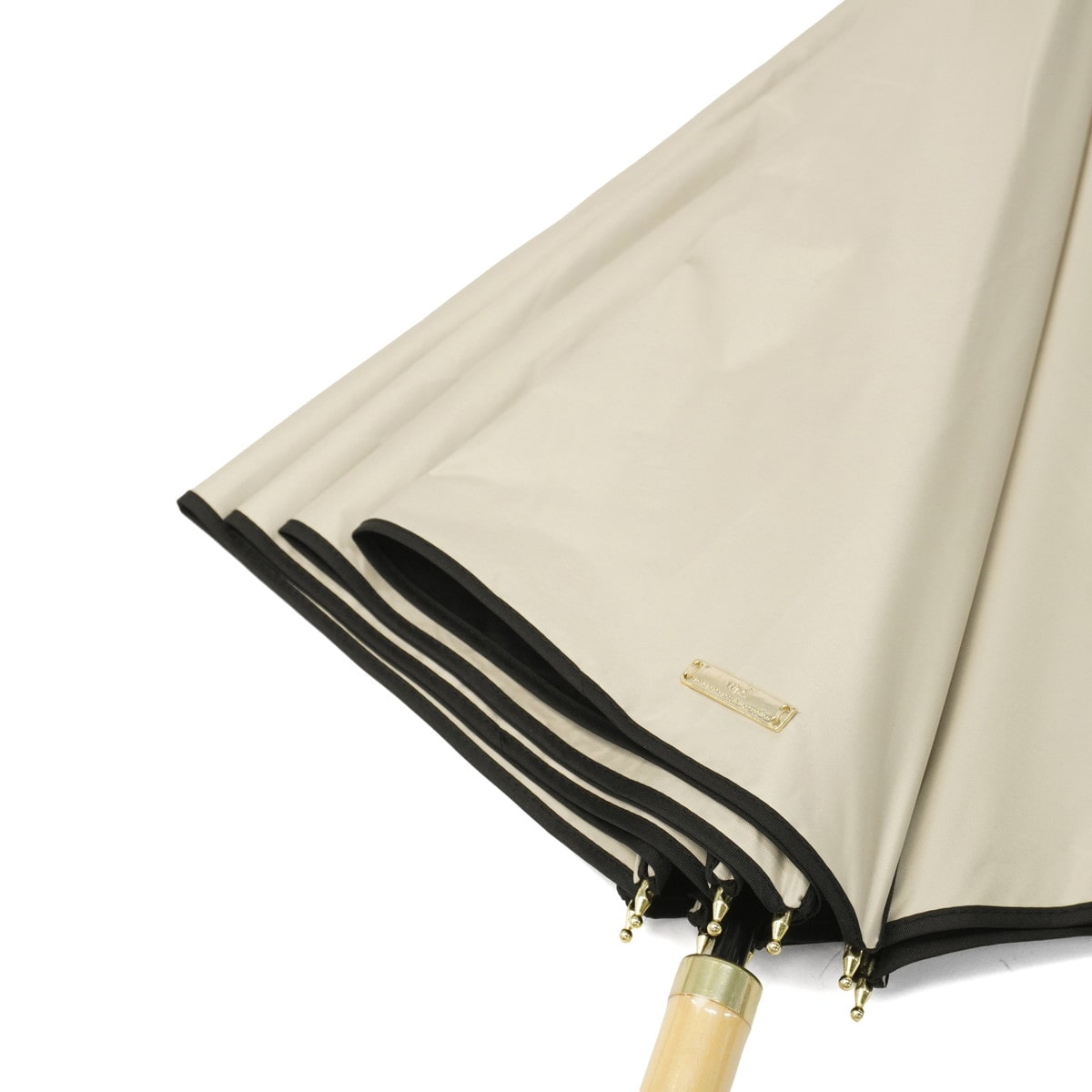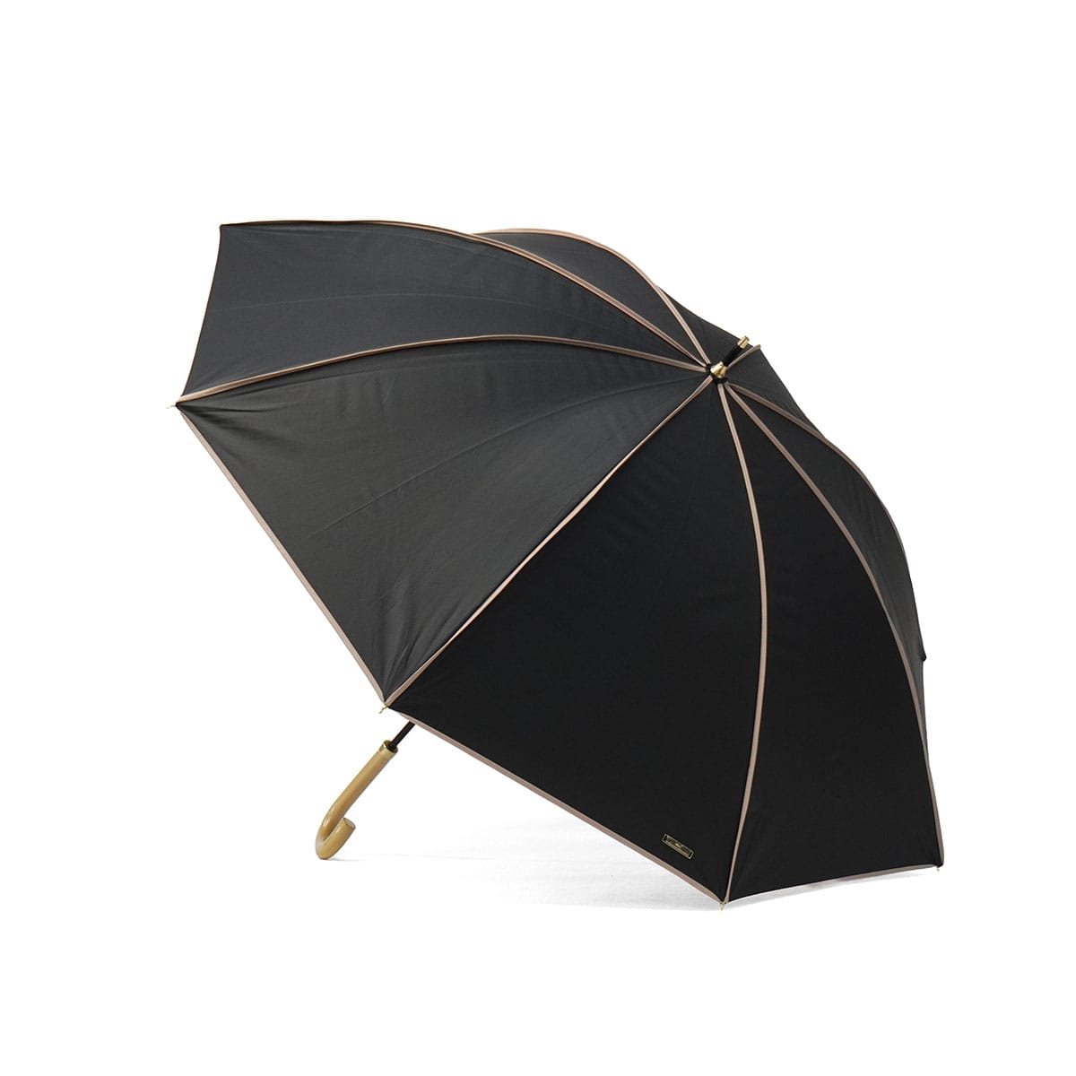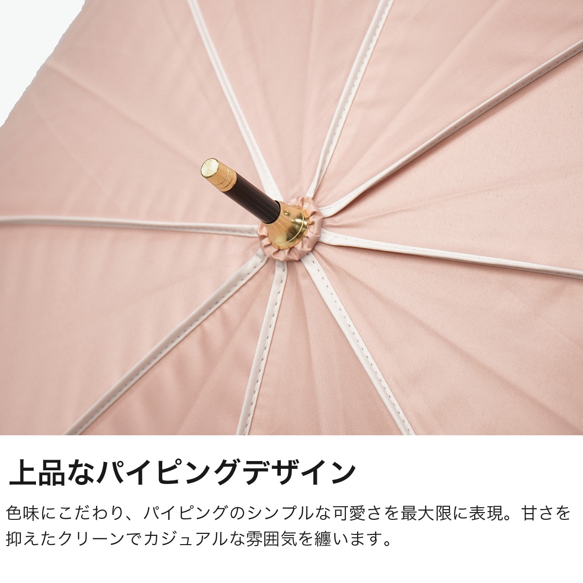 配色のパイピングをあしらうことで、カジュアルで上品な大人の女性におすすめの晴雨兼用長傘に。柔らかく落ち着いたトーンをベースに、パイピングの可愛さが映える色合わせにこだわりました。上品さを演出するゴールドプレートがワンポイントに。遮光率100%、UVカット率100%、UPF50+を実現し、高い実用性を誇る1本に仕上げました。
