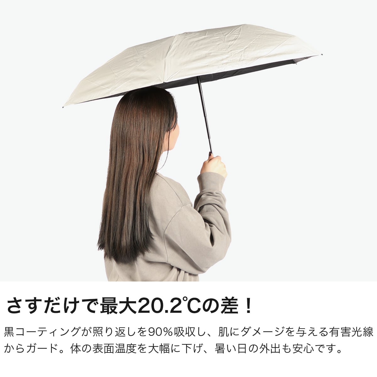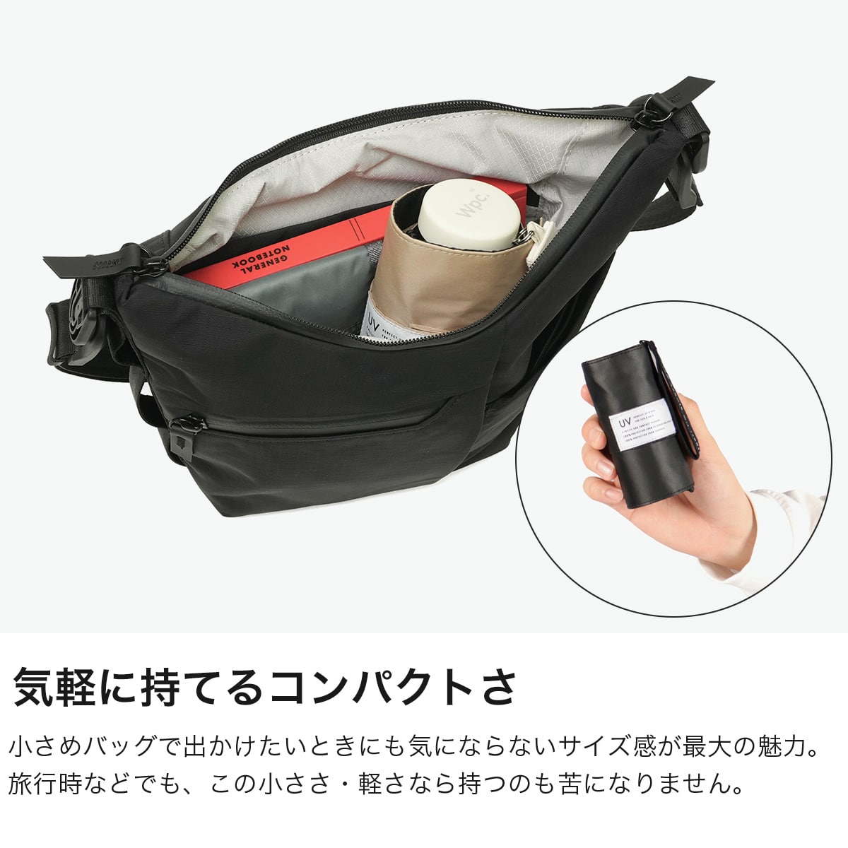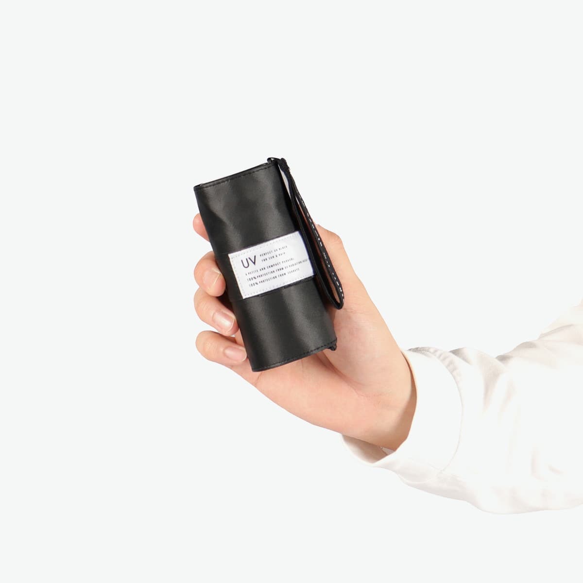 小さなバッグやポケットにもすっと入るコンパクトサイズで持ち運びに便利な晴雨兼用の折りたたみ傘。収納袋はゆとりのある形状で、巻いてまとめるタイプのため、きれいに畳まなくてもコンパクトに収納できます。傘内側の黒コーティングが照り返しを90%吸収し、肌にダメージを与える有害光線からしっかりガード。イージーオープン仕様で、ポキポキ折らずにスムーズに開閉できる手開きタイプです。