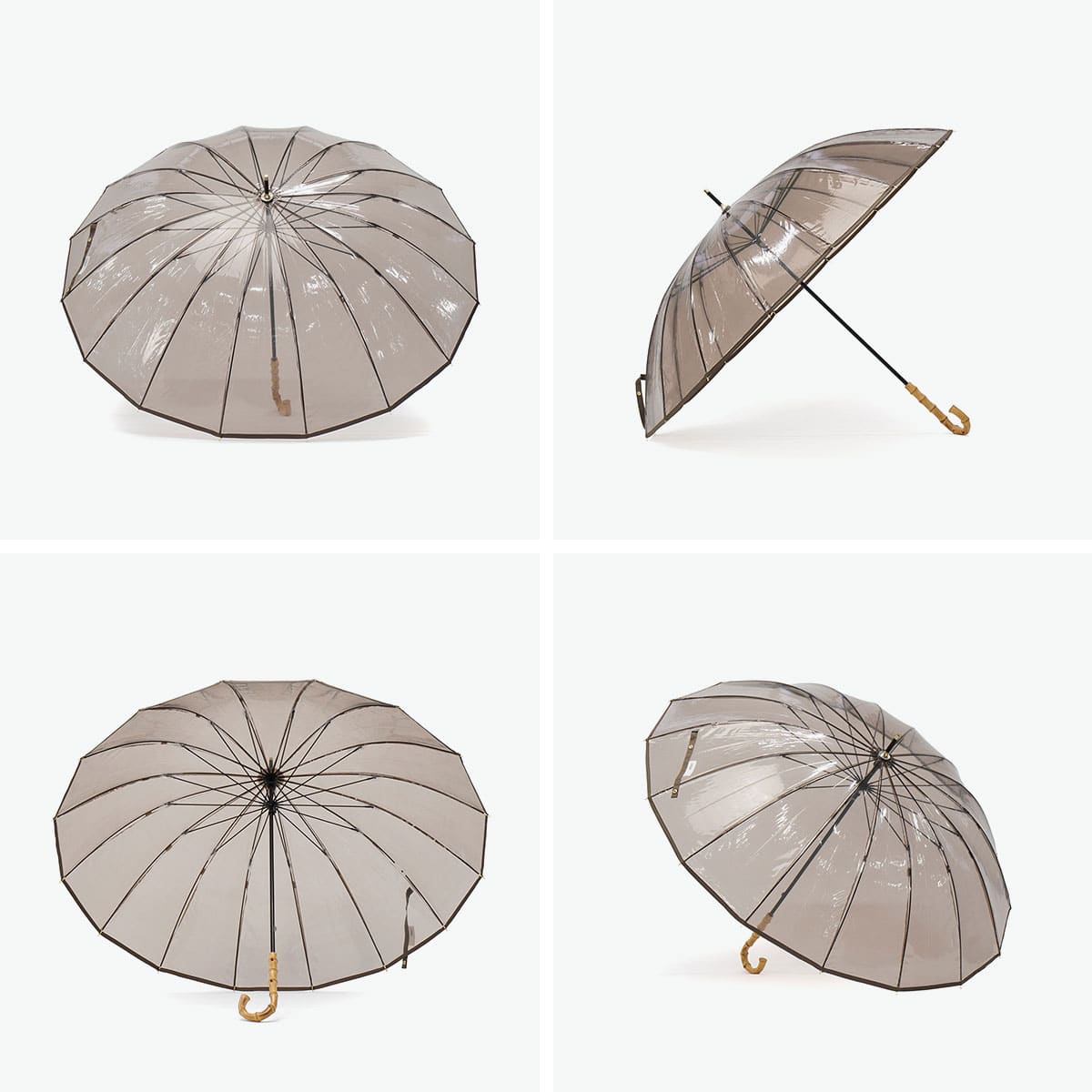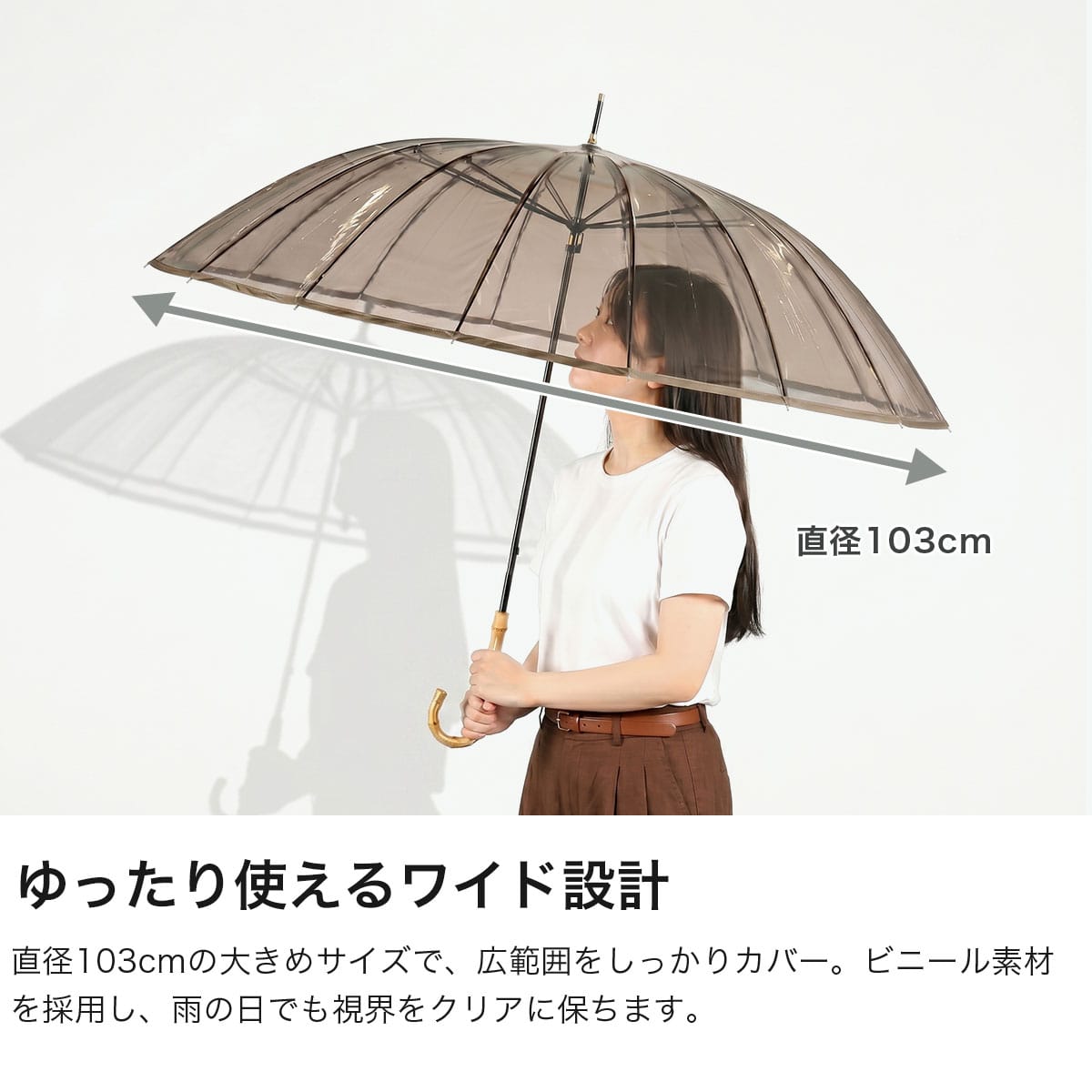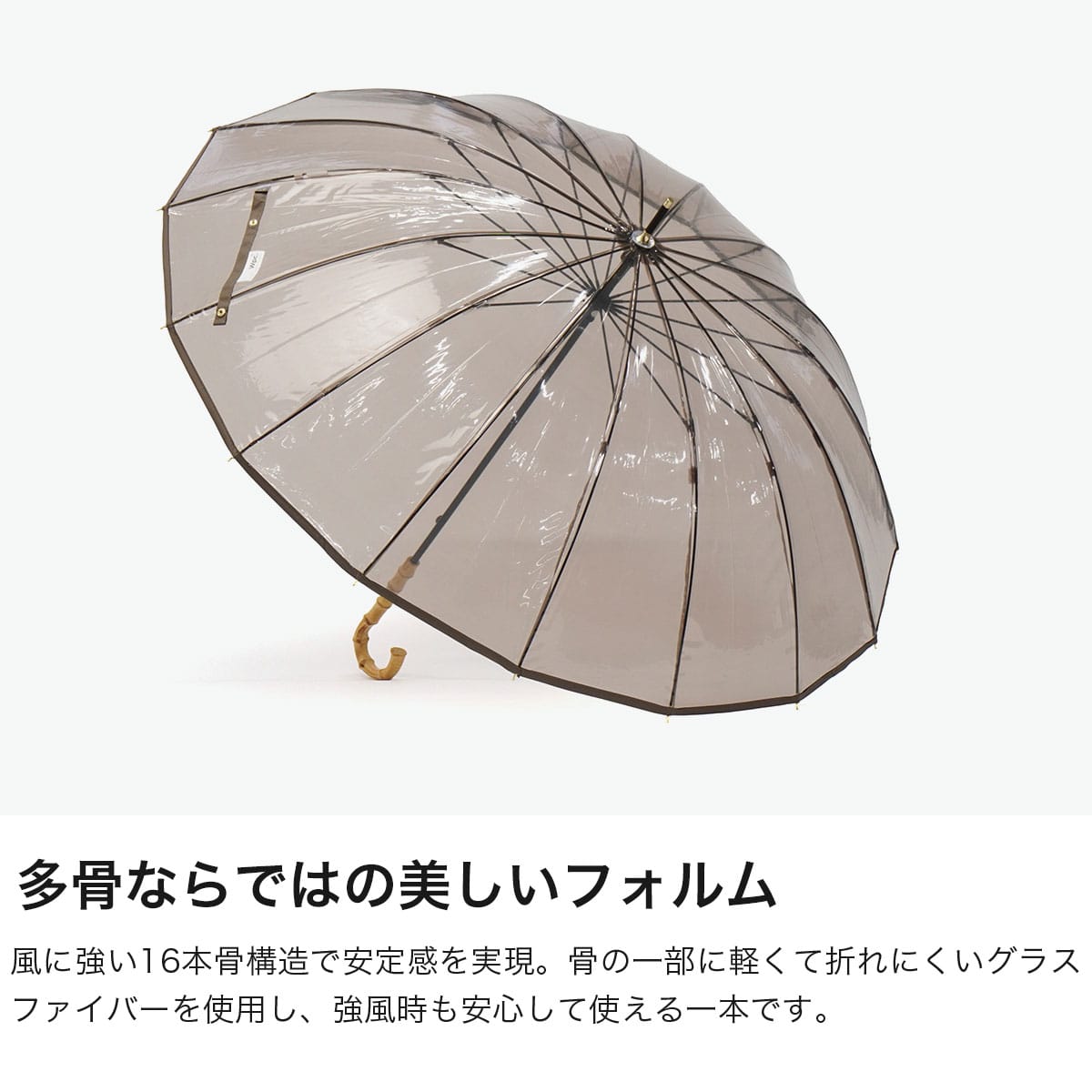風に強い16本骨構造で、安定感のある使い心地を実現したビニール傘。軽くて折れにくいグラスファイバー骨を採用し、長く愛用できる設計です。透明素材が視界を確保しつつ、洗練された印象を演出。節付きで握りやすいバンブーハンドルが上品さをプラスし、大人のスタイルに自然と馴染みます。通勤・通学にも使いやすい大きめサイズです。