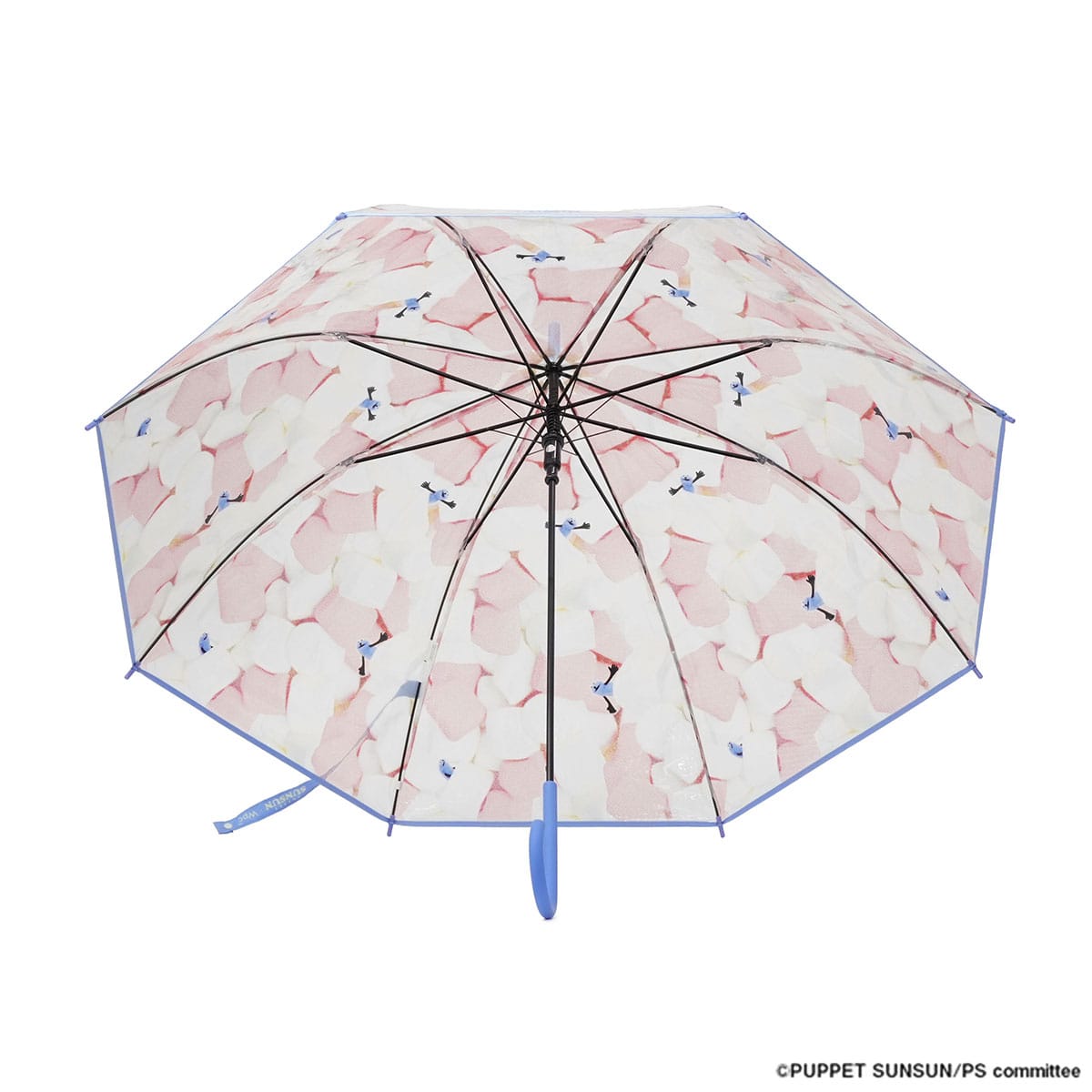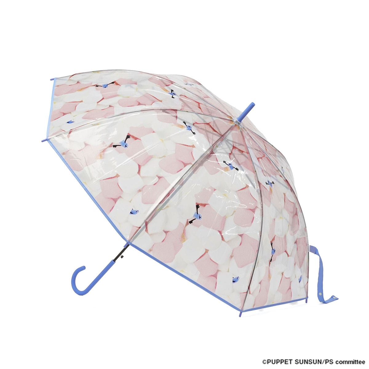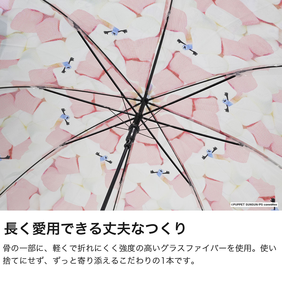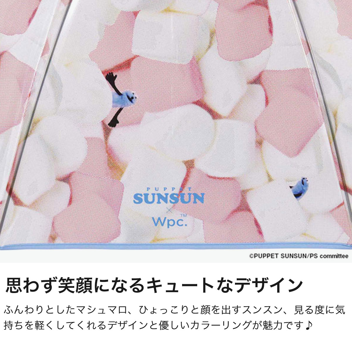 程よい透明感に、マシュマロの間から顔をのぞかせるスンスンがとっても愛らしいビニール傘。つゆ先やパイピング、手元は統一感のあるブルーで仕上げ、デザイン性を高めました。グラスファイバー骨を一部に使用し、軽くて折れにくい丈夫な設計。ワンタッチで開くジャンプ式で使い勝手も快適。愛着を持って大切に長く使っていただける、使い捨てにしないビニール傘です。