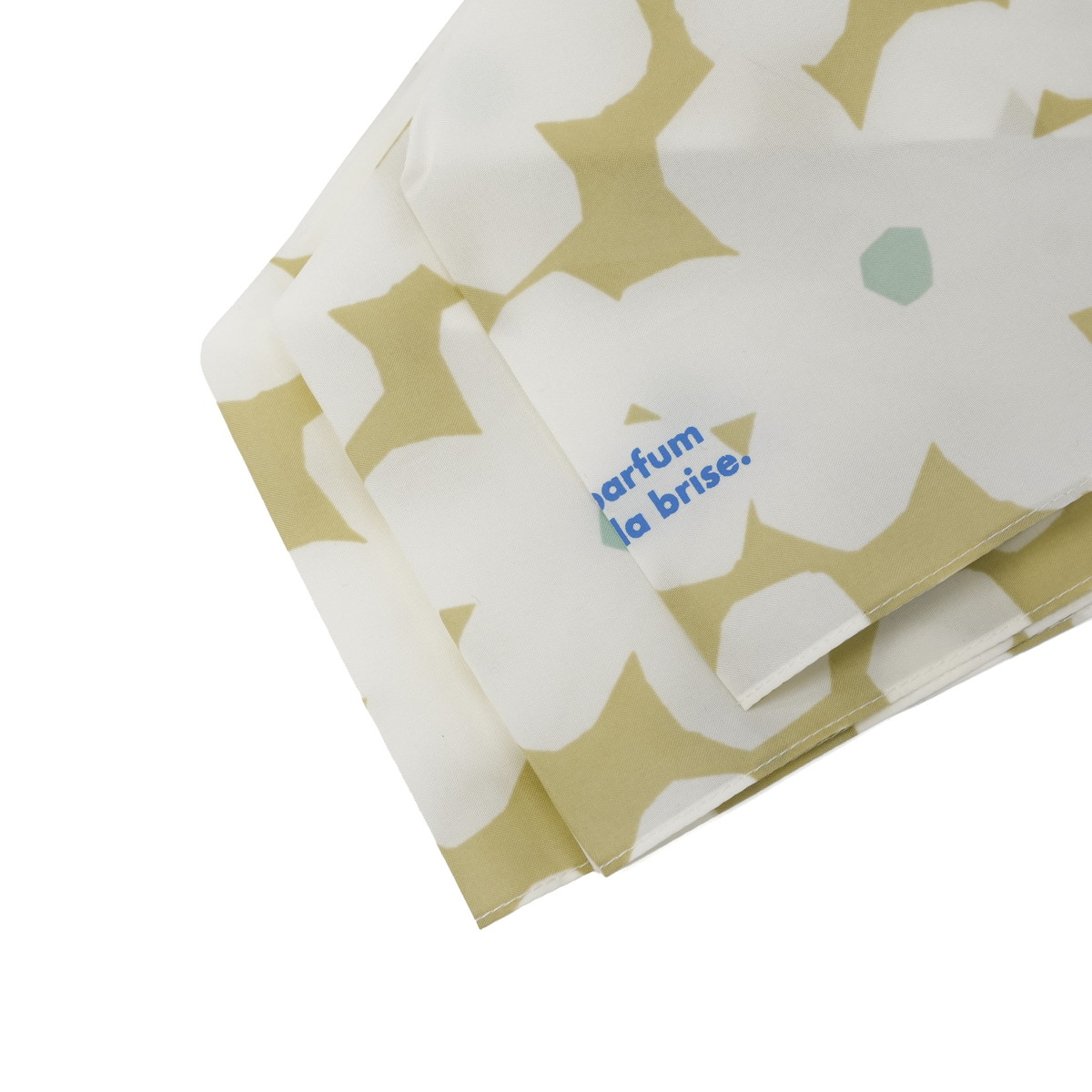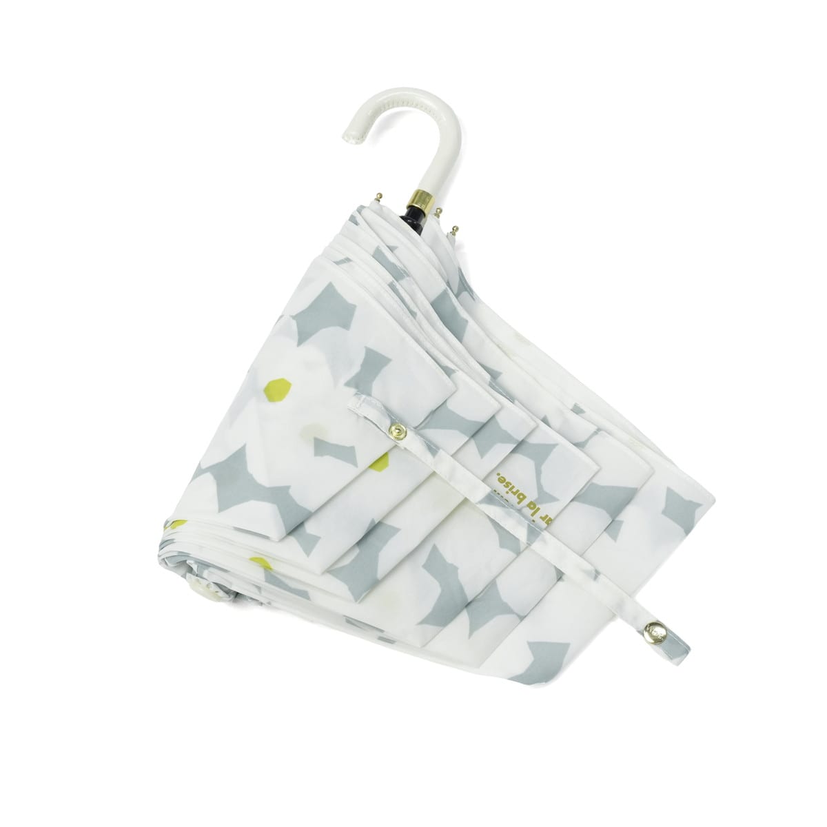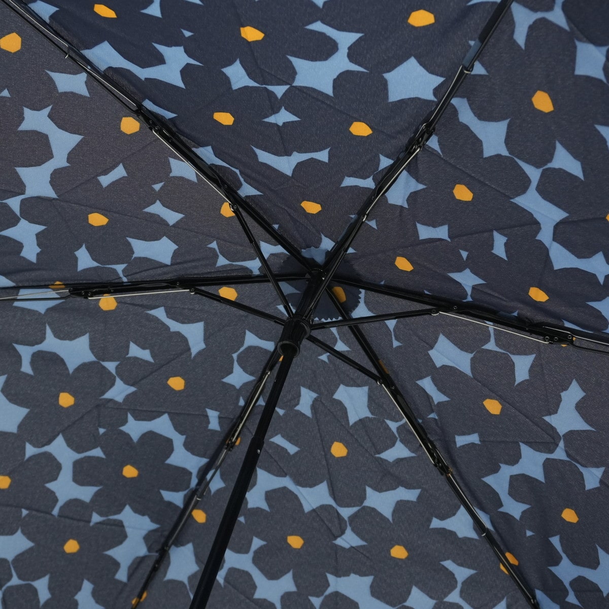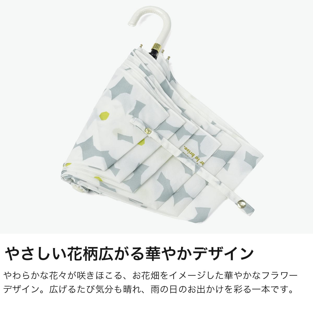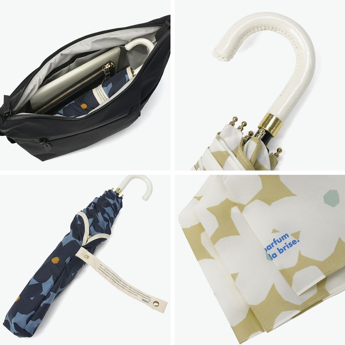 リズミカルにお花を配置したデザインの晴雨兼用折りたたみ傘。フロラージュはフランス語で「花」「花模様」という意味。"気持ちが落ち着く幸せなお花畑"をイメージ。収納袋の帯留めと外フチにはアクセントカラーを入れ、シンプルすぎずポップめな雰囲気に仕上げました。