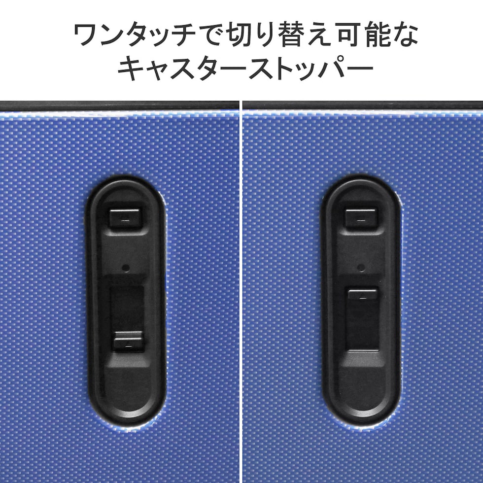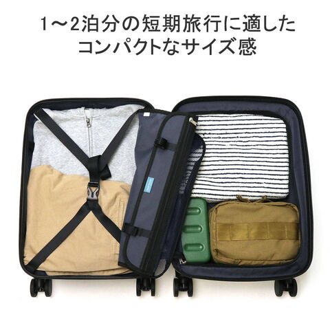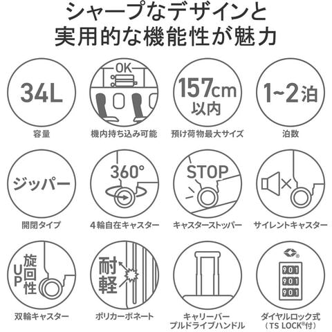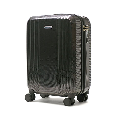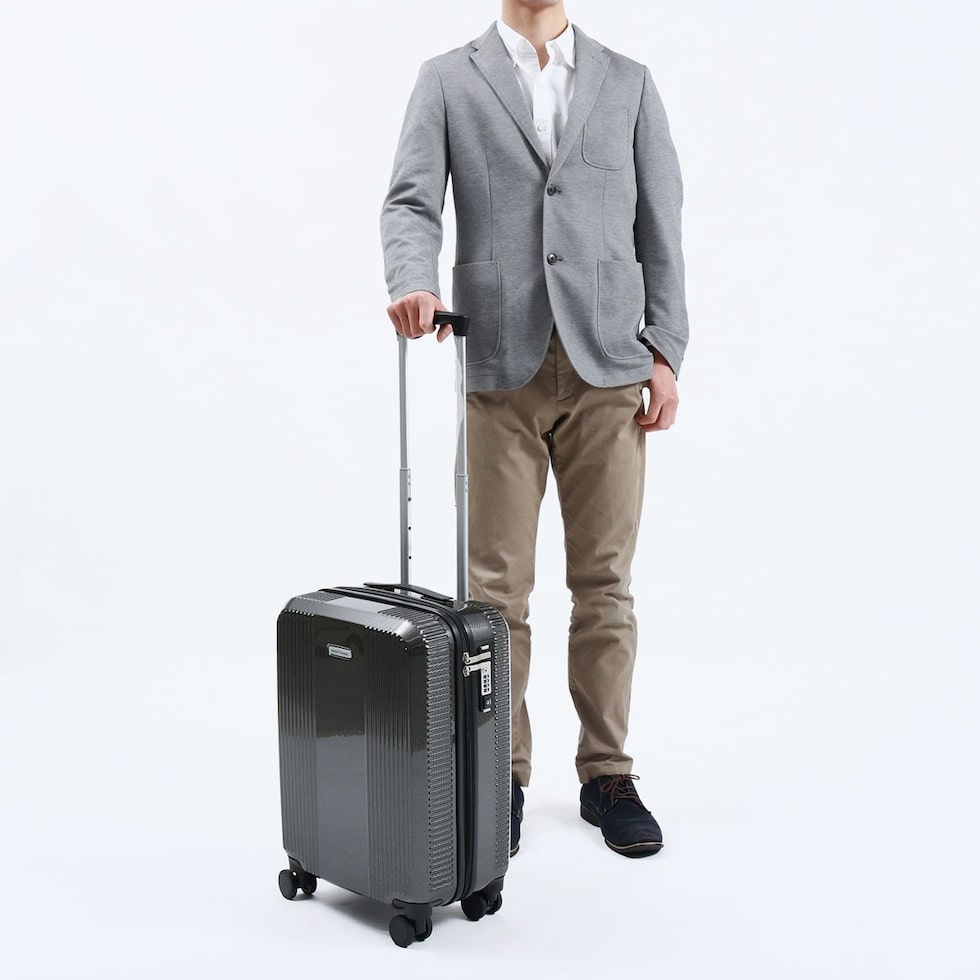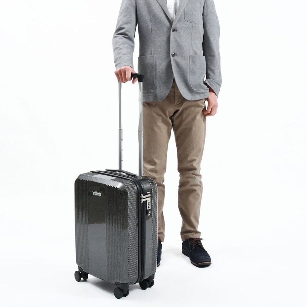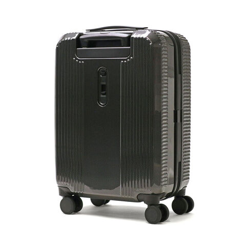 縦リブにカーボン柄を施したシャープなデザインが特徴の『ボトムベイ』シリーズ。本体は1~2泊分の荷物が収まるコンパクトなサイズ感で、旅行や出張などに持ち運びやすいアイテムに仕上がっています。静音双輪キャスターを採用し、静かで安定した走行を実現。また背面にはワンタッチで操作できるキャスターストッパーを装備し、電車や坂道での不意な移動を防止します。その他、TSAロック、耐衝撃性に優れたポリカーボネートをボディに使用するなど、実用的な機能を抑えた設計が魅力です。